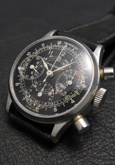This is an extremely rare watch made by Karl Plepla, a former watchmaker for Tiffany & Co. in the 1920s. Mr. Plepla ventured out on his own after a stint with Gruen in the 1930s, and produced watches on order for the Armed Forces and under other contracts, in conjunction with Jardur . This watch, named the Flytimer, was designed for use in aviation, and came with white and black gloss-gilt dials, powered by Valjoux 71/72 movements in the 1940s.