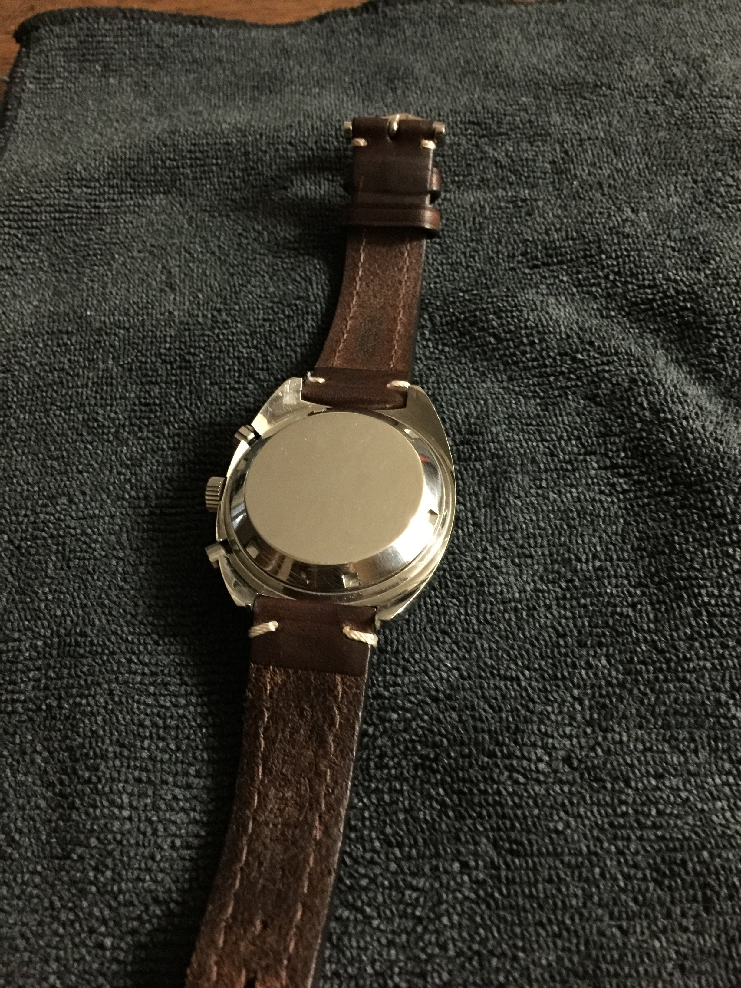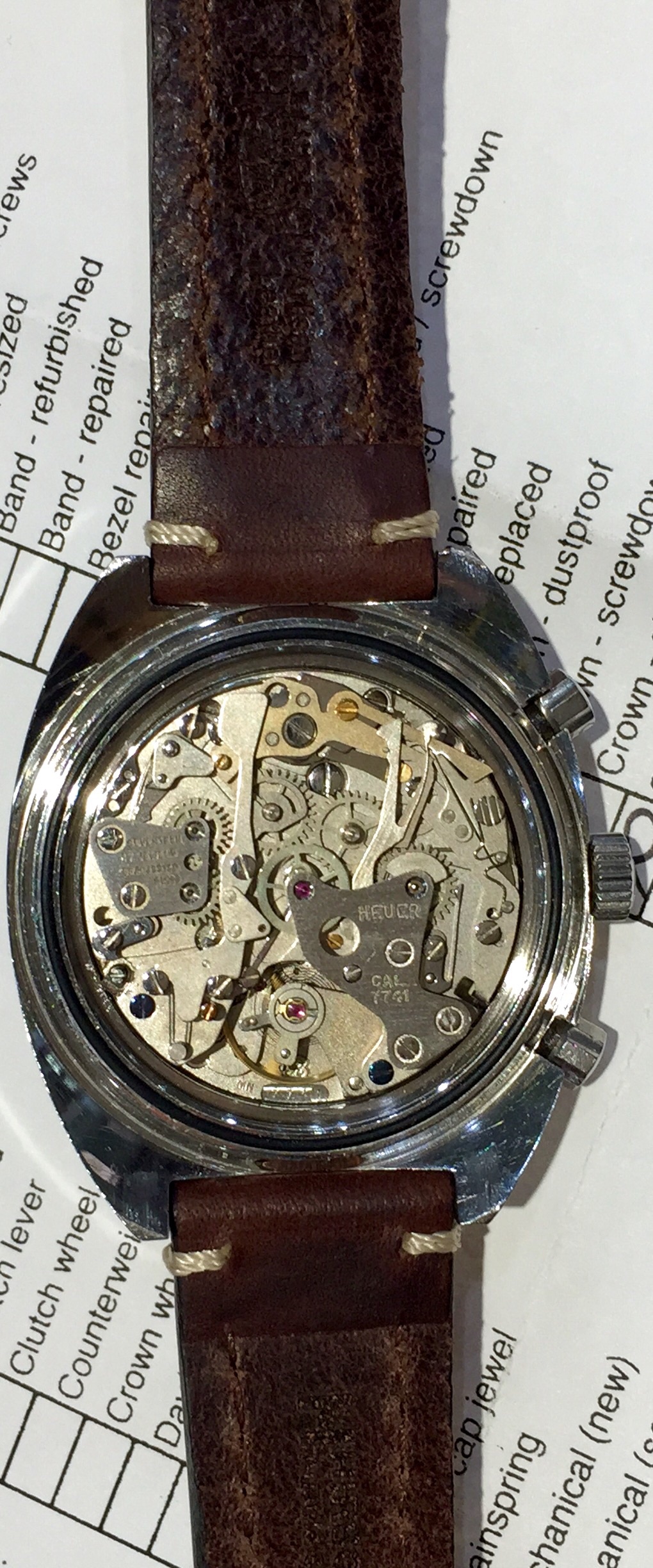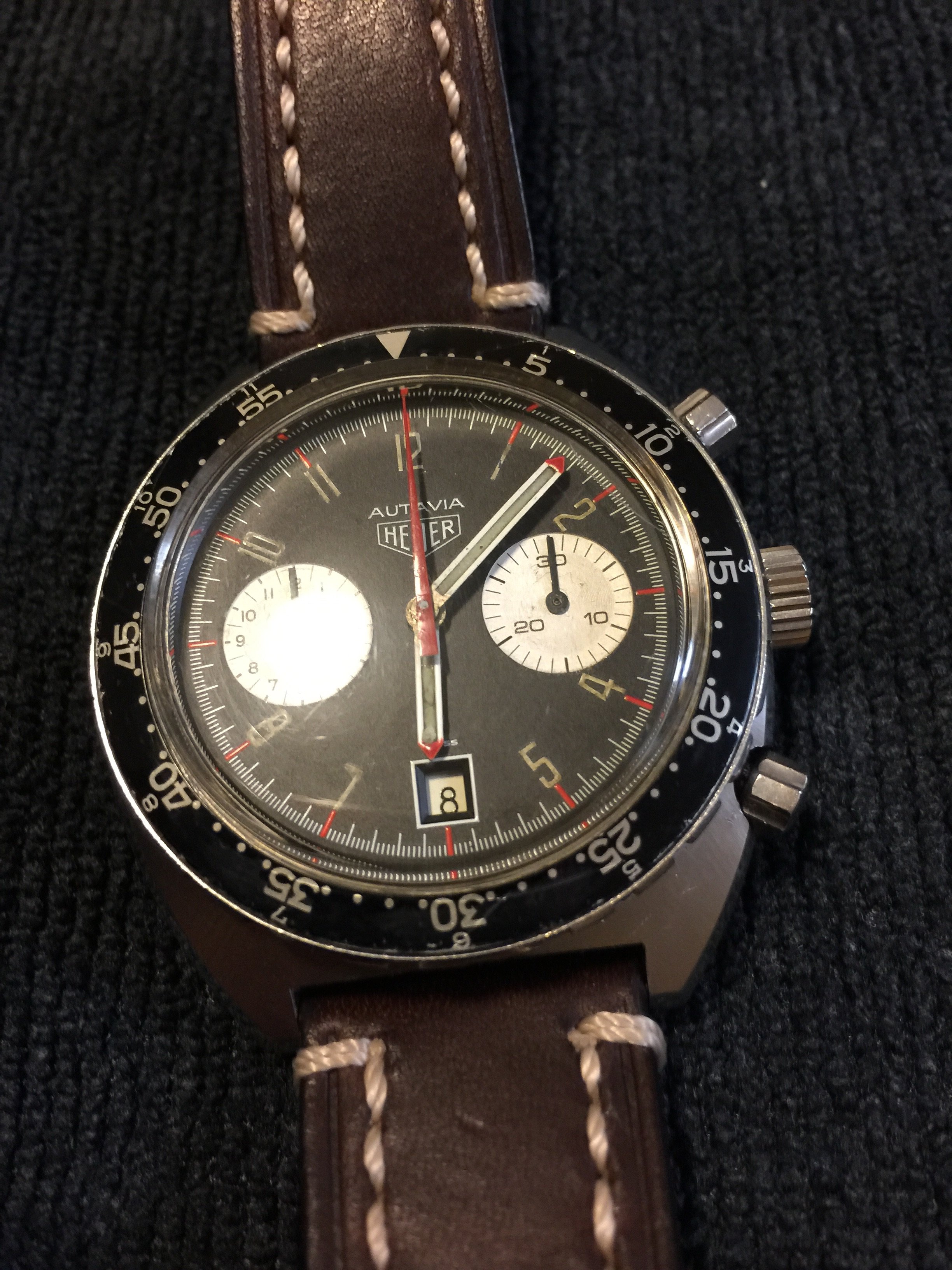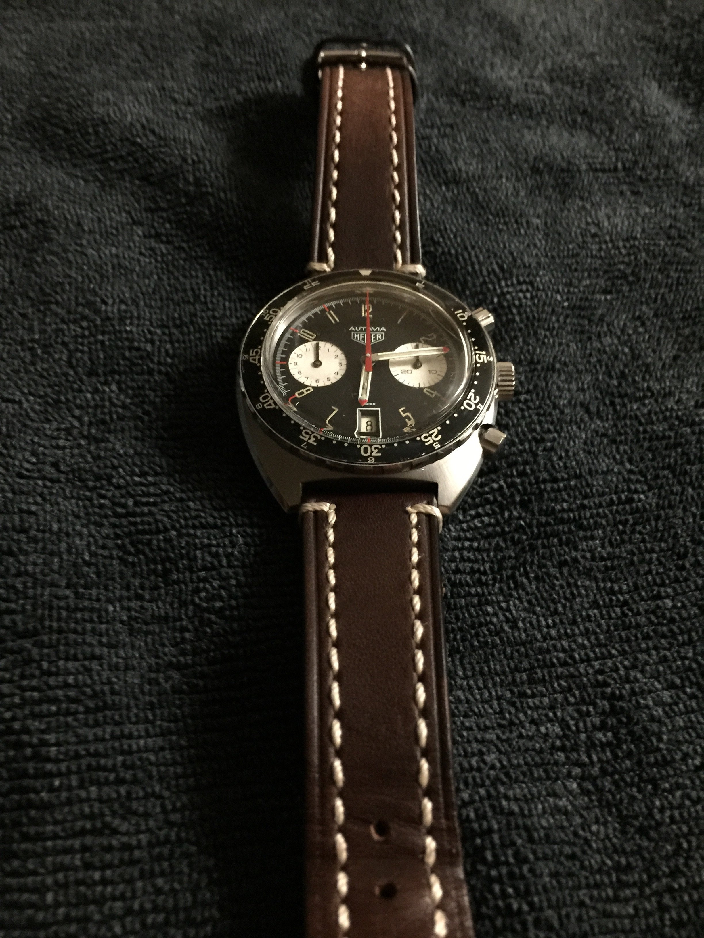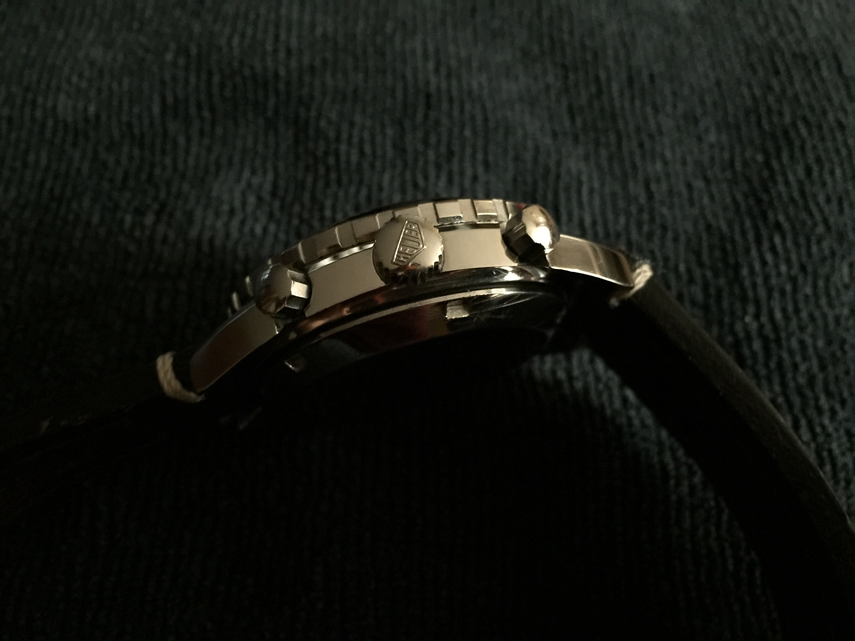 Cool movement too. The Valjoux 7741 is actually Heuer's Calibre 12 movement with the automatic winding mechanism removed- in effect, a manual-wind Chronomatic!