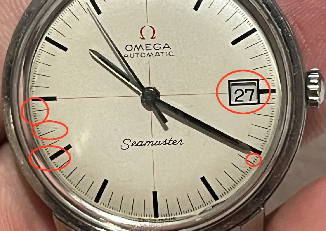 I agree some of the minute markers and the date window seem suspect but the broken crosshair is correct for this dial. A continuous crosshair would be a red flag.