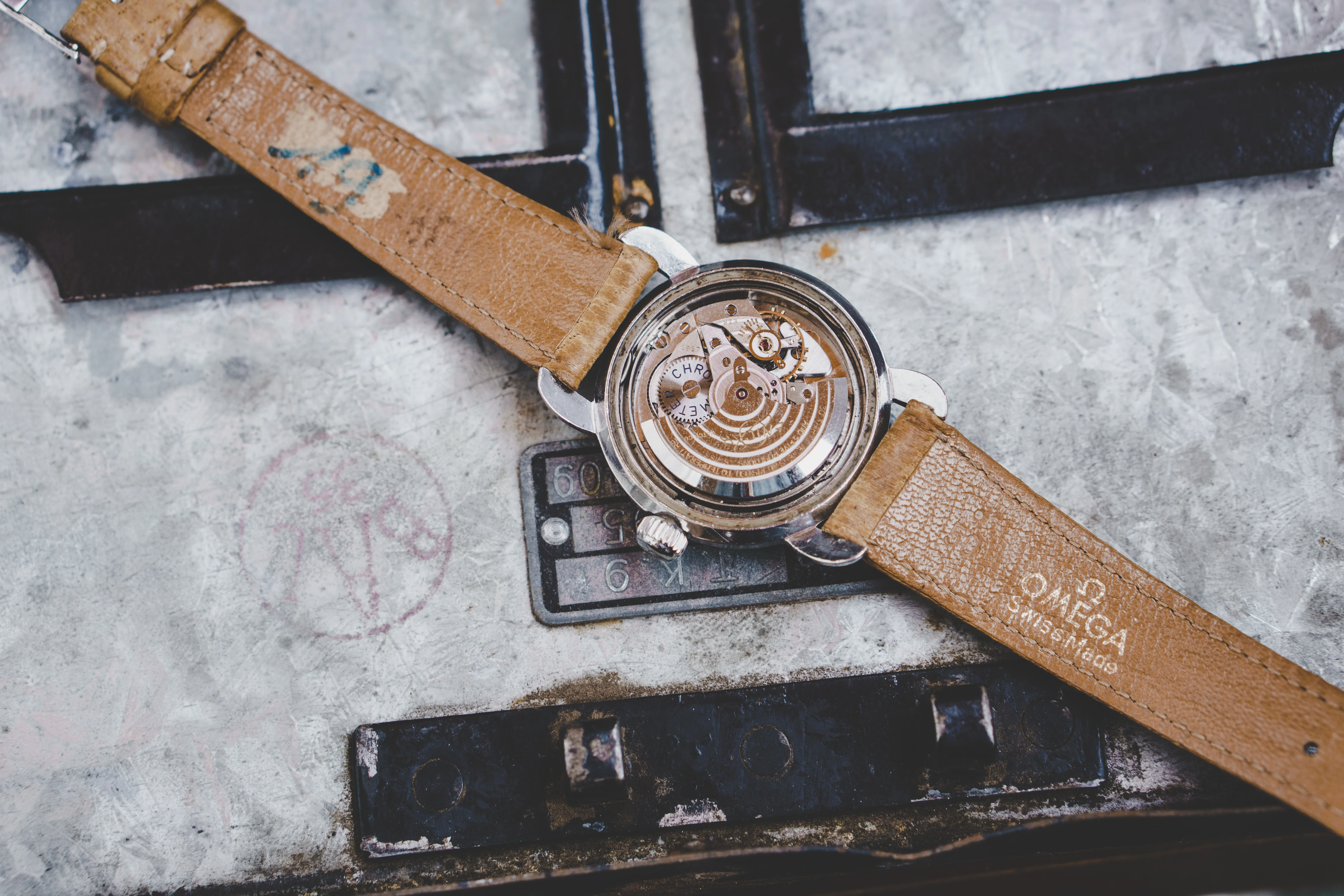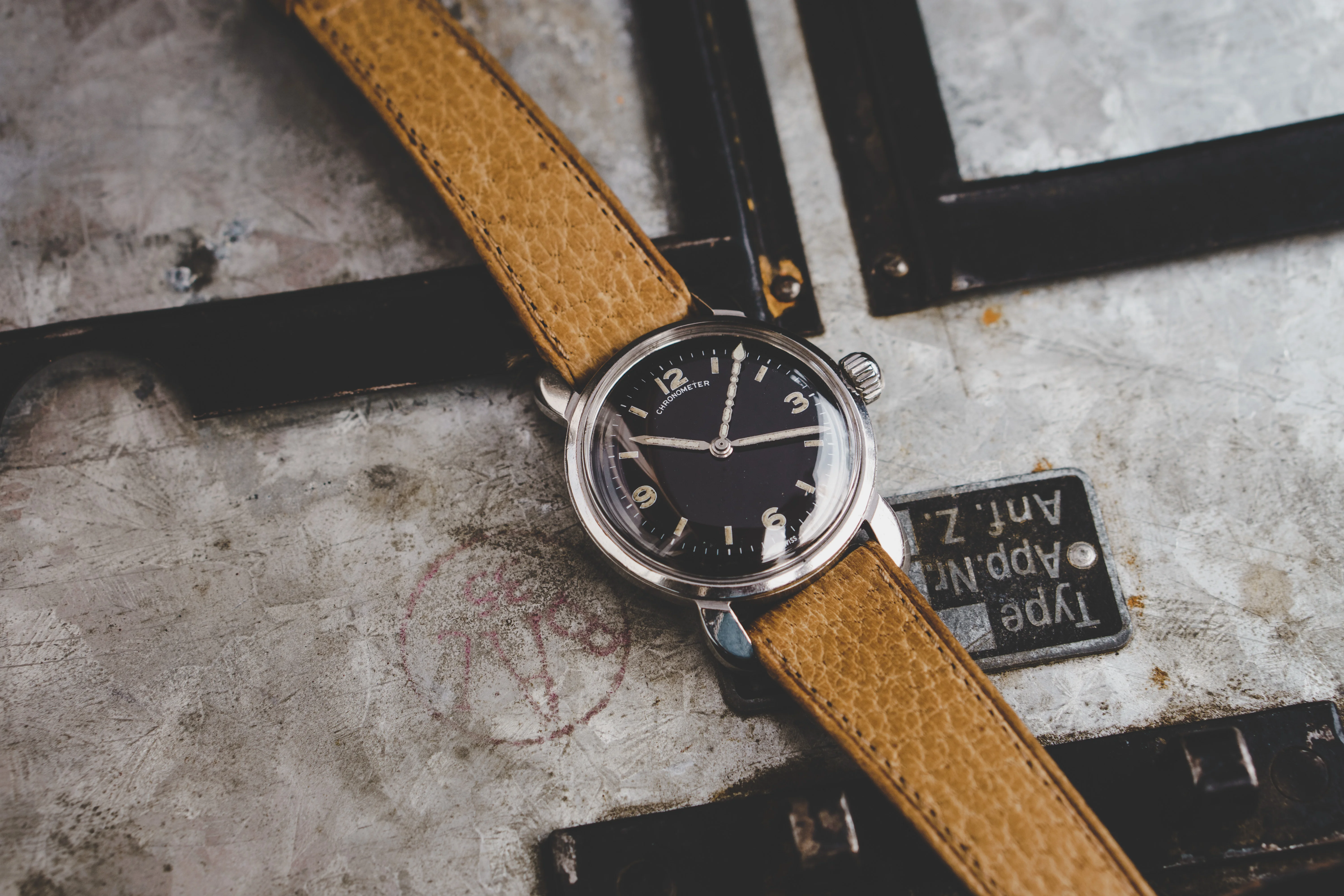 Maker’s mark on dial, crown, watch case and movement