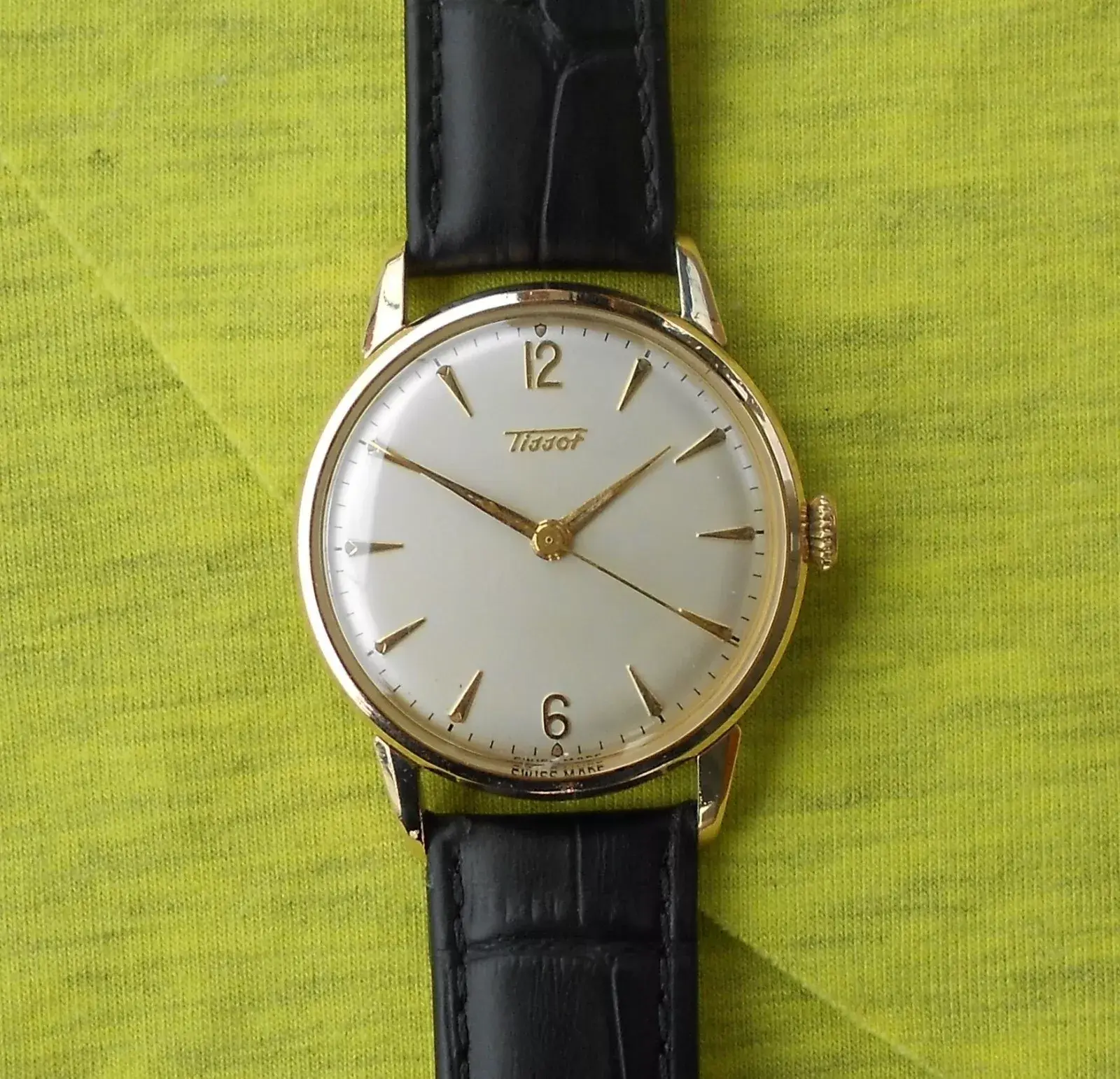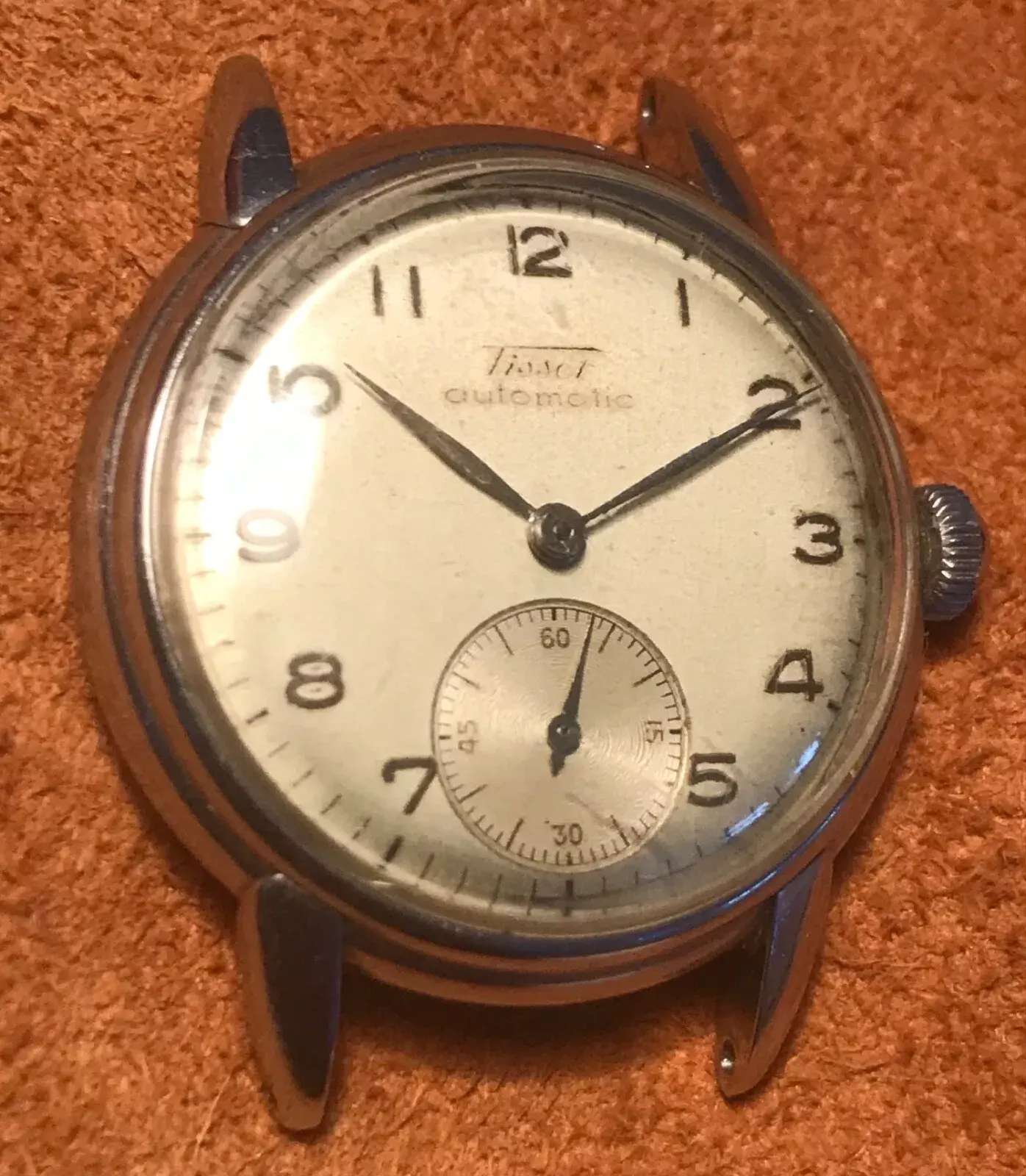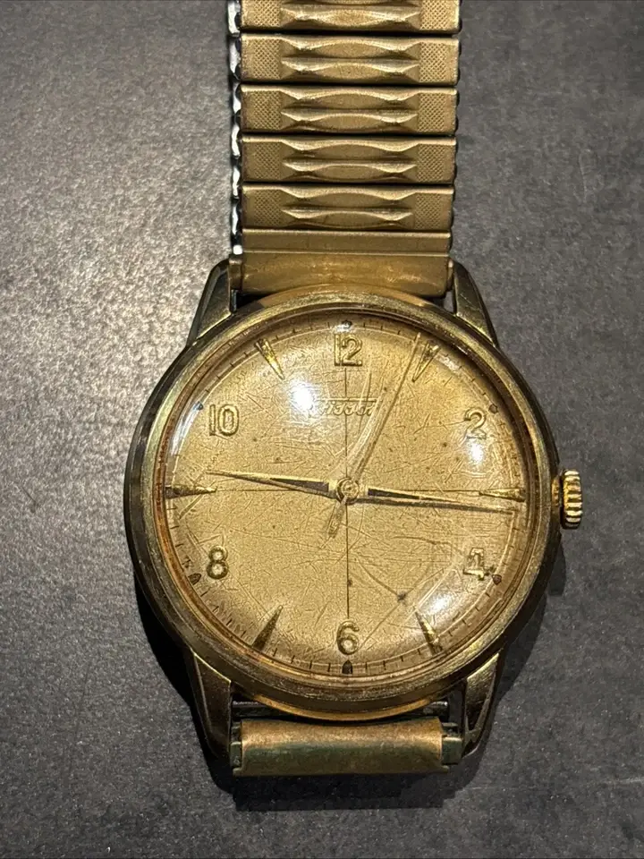 ·The pictures are terrible, but I think there's a nice watch hidden under all of that poor photography. Looks like a mid-century, 32mm manual-wind Tissot, with a black dial and raised markers in a steel screwback case. Hands are original and correct. Crown might be a replacement. Some spots on the face, but I think that's the crystal: