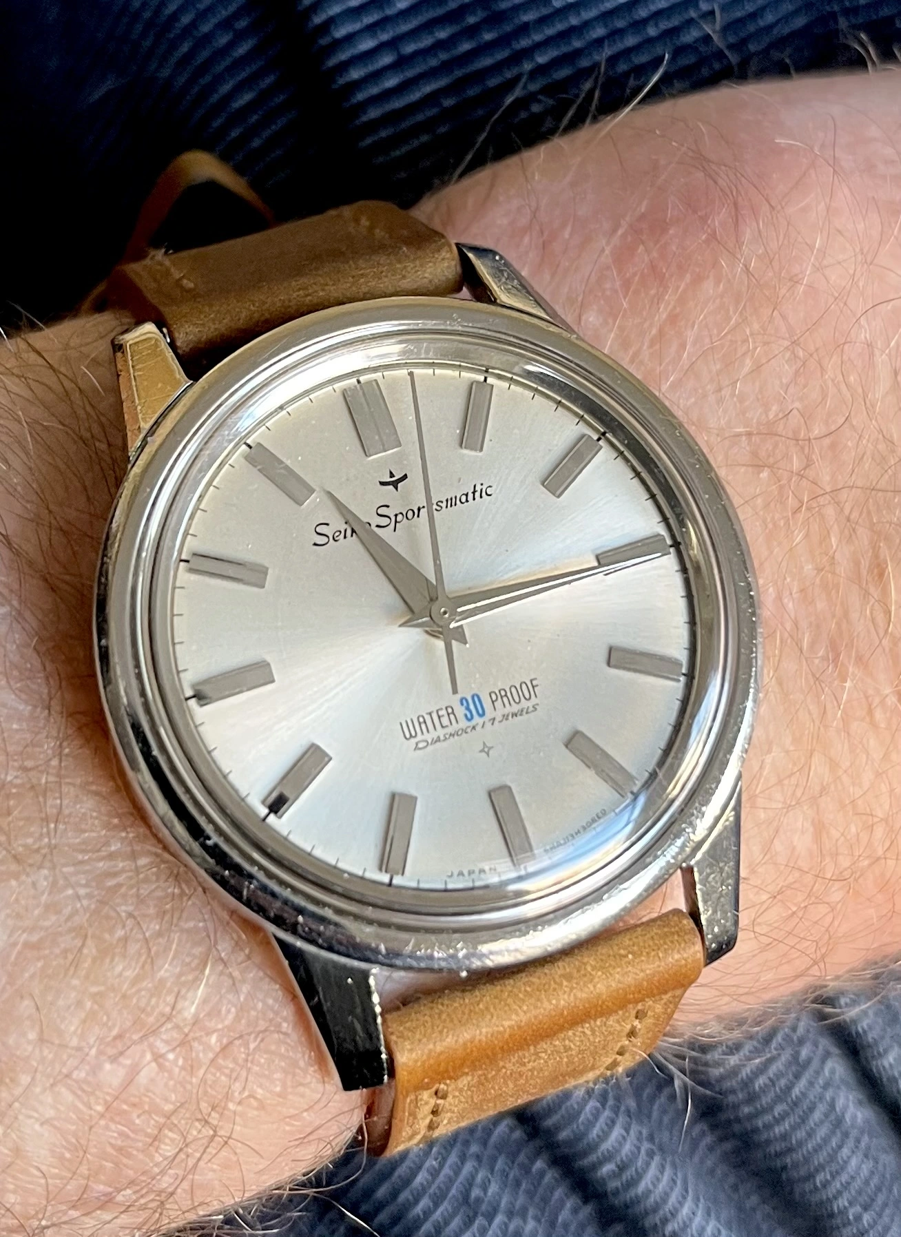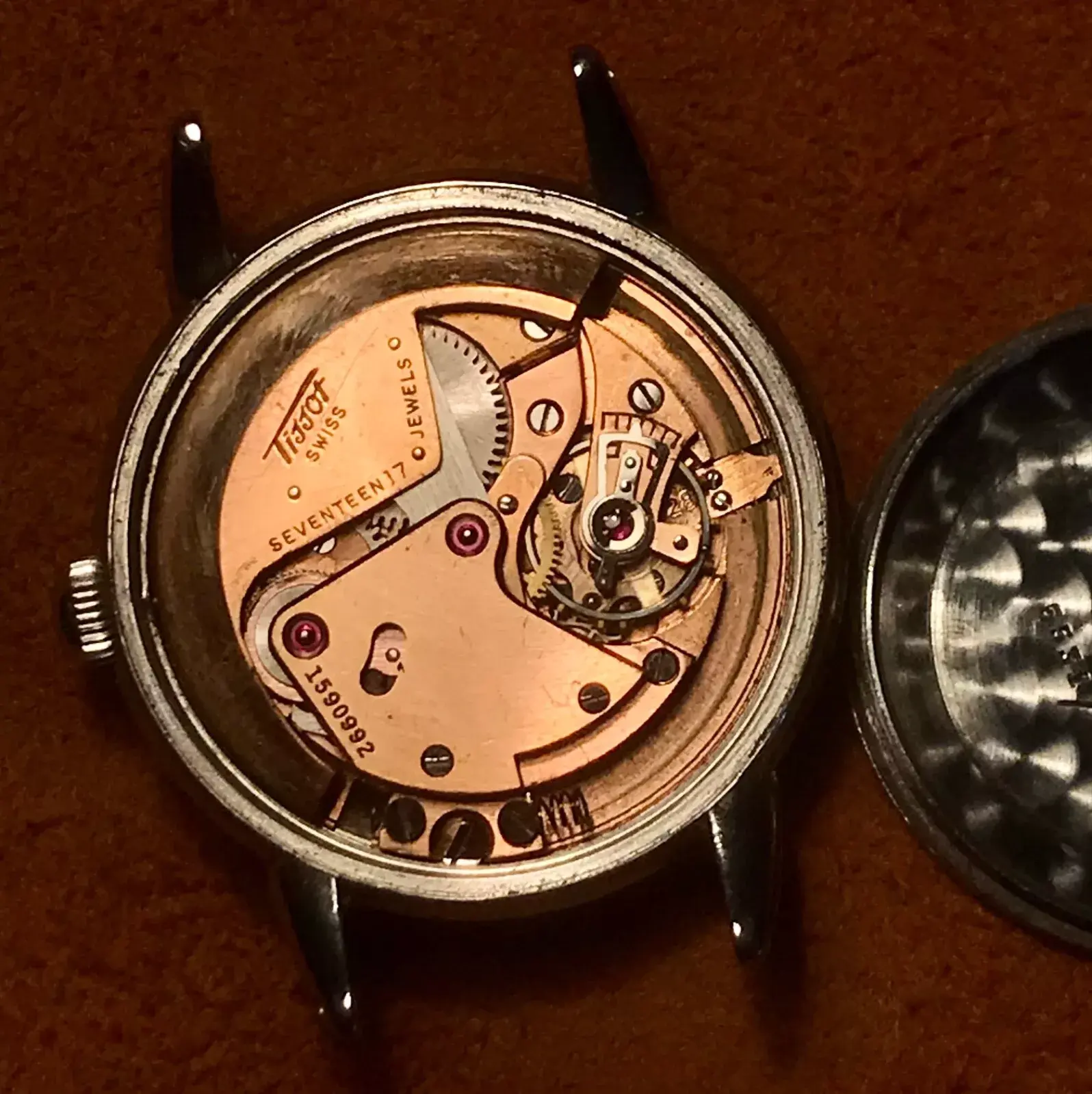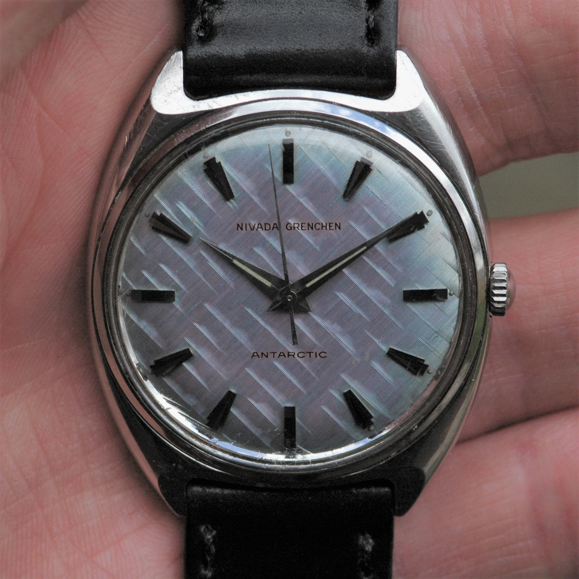 ·The pictures are terrible, but I think there's a nice watch hidden under all of that poor photography. Looks like a mid-century, 32mm manual-wind Tissot, with a black dial and raised markers in a steel screwback case. Hands are original and correct. Crown might be a replacement. Some spots on the face, but I think that's the crystal: