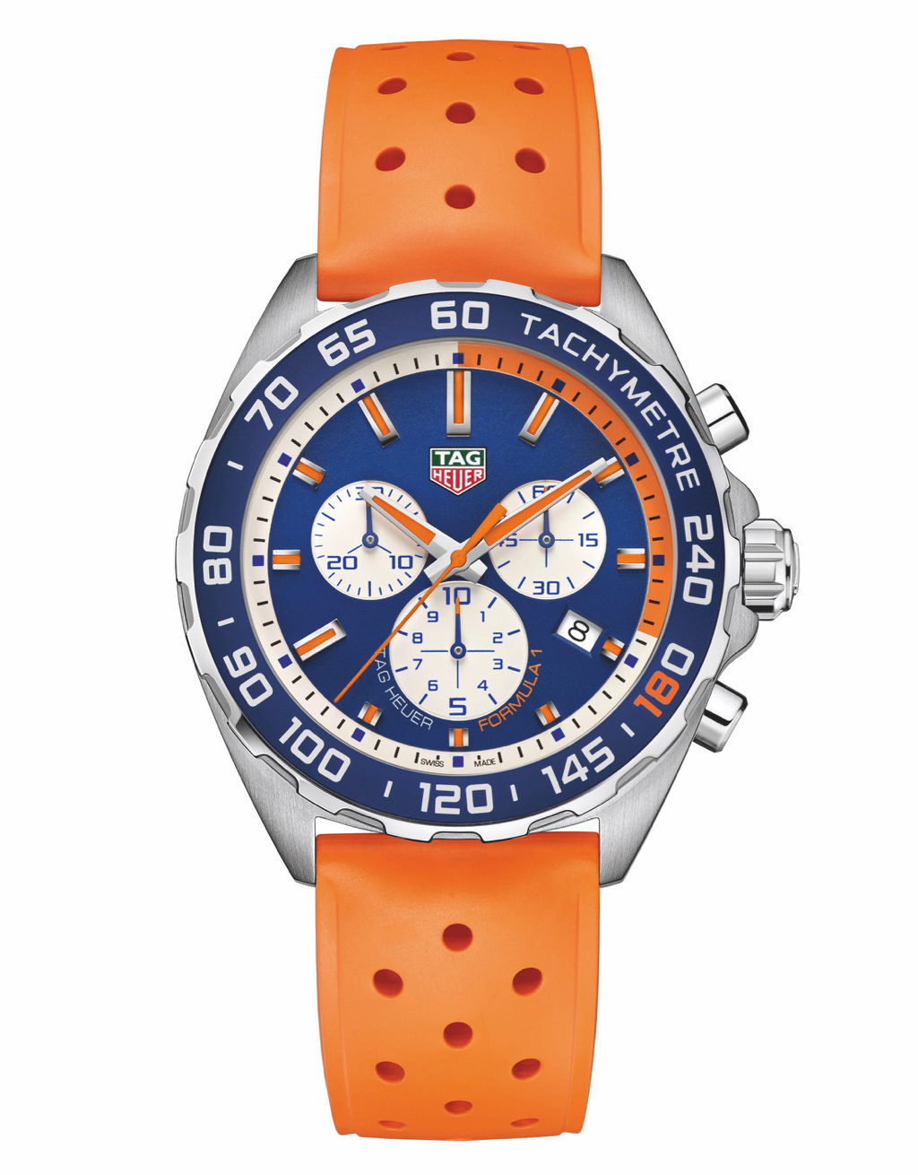 In addition to these two team watches TAG Heuer now presents the drivers watch, TAG Heuer Formula One Max Verstappen Youngest Grand Prix Winner Special Edition. It has a blue aluminium bezel with tachymetre scale and a specially marked orange space on the dial (from 0-180 of the tachymetre scale) with the “18” of the 180 in bold to underline the age of Max when he won his first Formula One Grand Prix. Other highlights of the watch include an orange perforated calf leather strap and “TAG Heuer Formula One Max Verstappen Youngest Grand Prix Winner Special Edition” engraved on the back of the case. This edition will be available from November 2016.