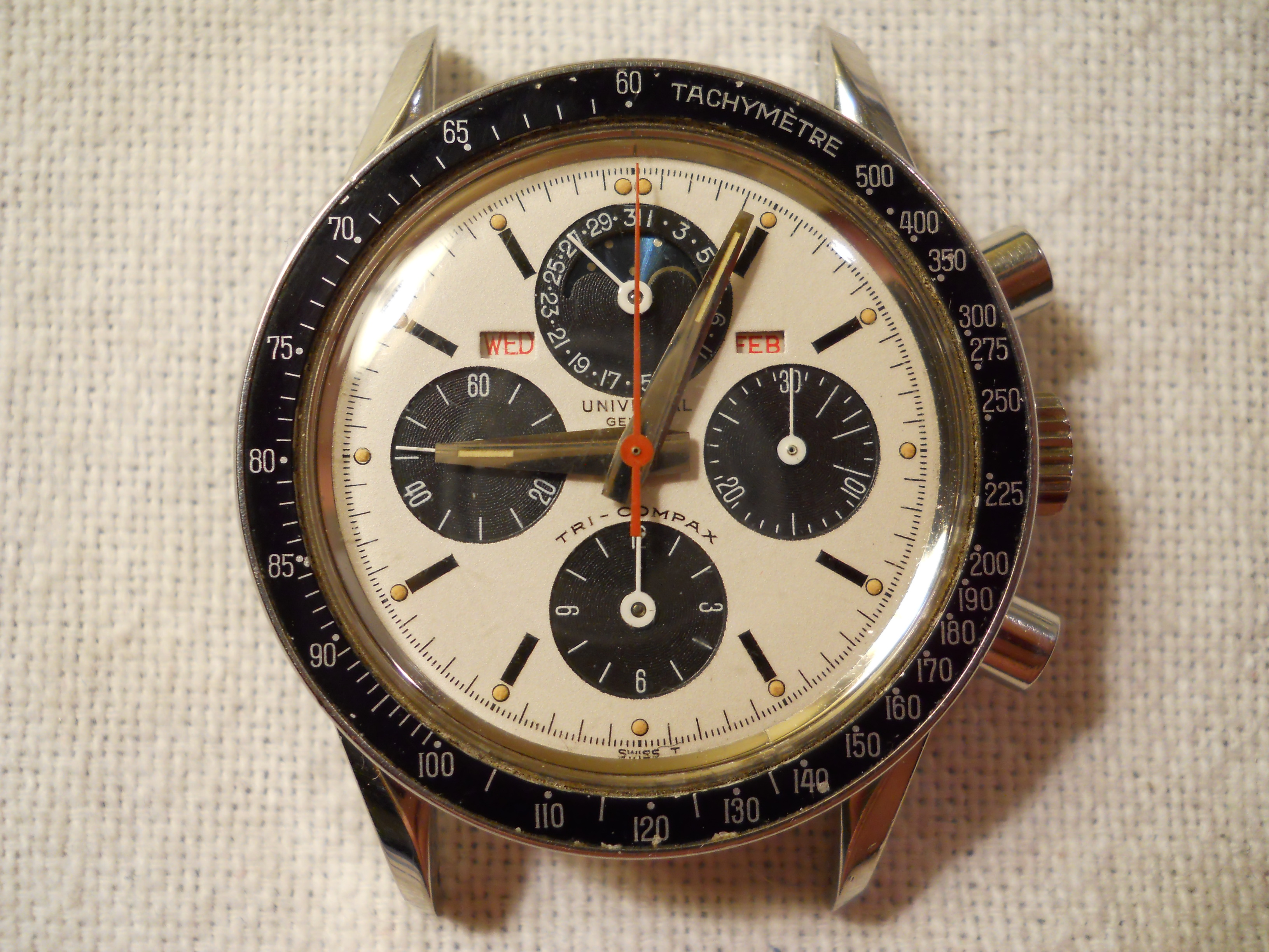 ·I recently rediscovered my Tri-Compax that I had received as a gift when I was quite young. Based on the serial number, it appears to date back to 1967. All functions are working, although the chronograph pushers are not moving freely. I was hoping I could solicit some advice via this forum regarding two issues. First - to whom should I entrust this watch for the needed maintenance (it has been idle for about 25 years). Second - for some reason, the final links on the original stainless bracelet are missing (the ones that would be closest to the watch case). Do I need to look for an entirely new watch band? By the way - you may notice that the bezel is not perfectly aligned (the 60 and 120mph markings do not lign up with the 12 and 6 o'clock markings). Is that something that could have happened during an early repair (the case unfortunately has marks indicating that the watch has been opened)? One more thing - I assume it is not a good idea to keep the watch wound while it is probably in desperate need of lubrication.
