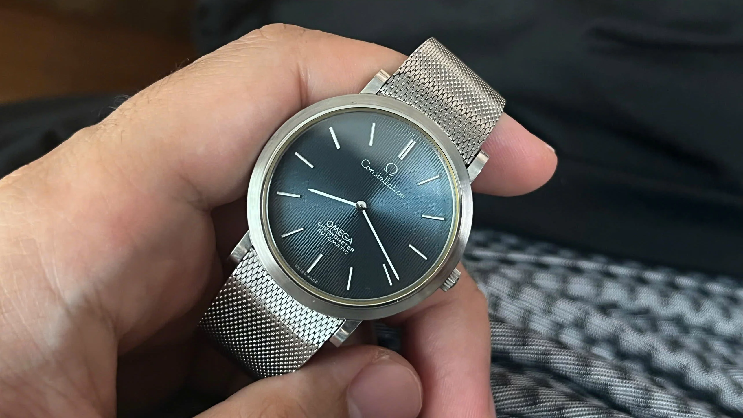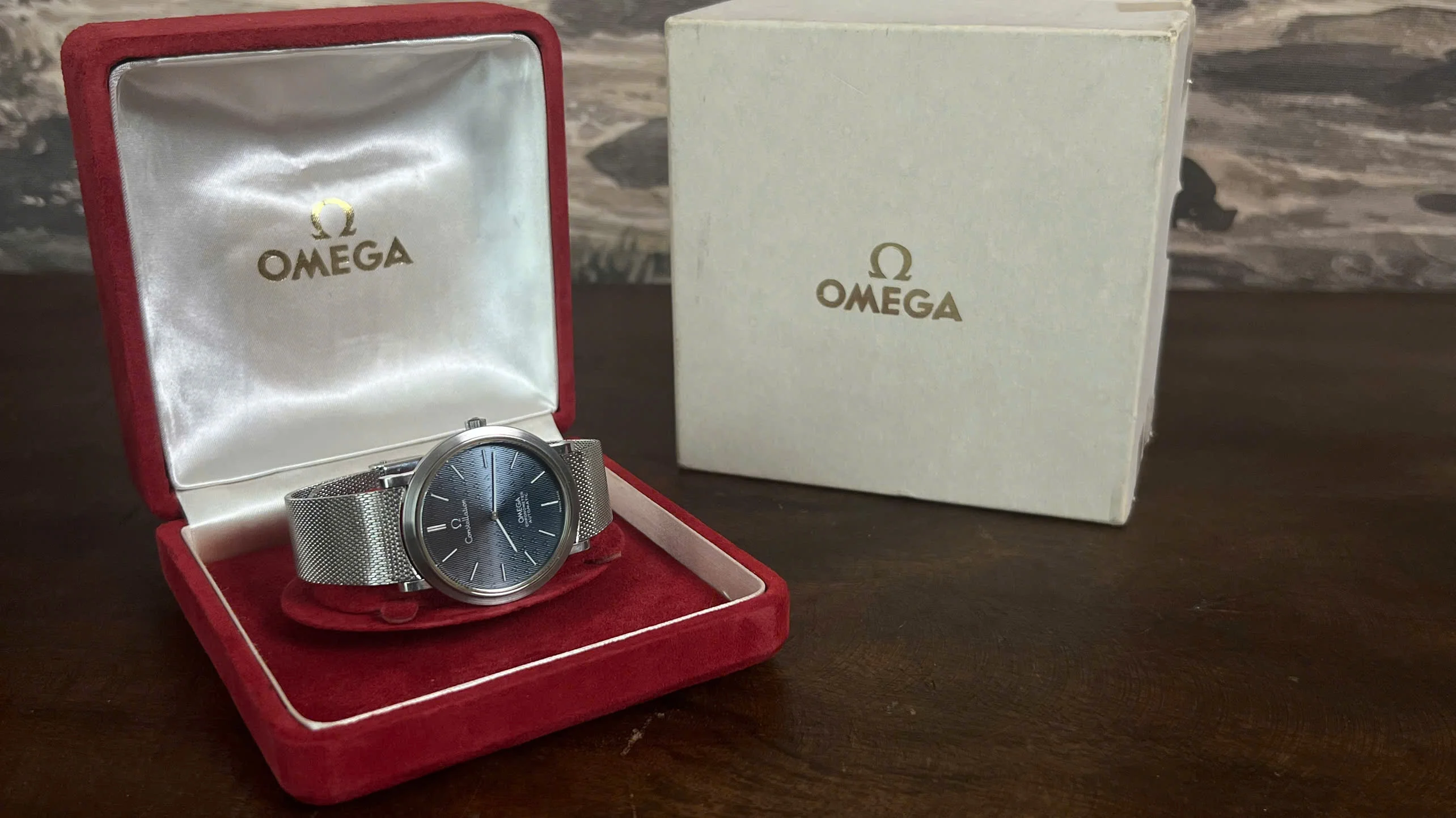 For sale is a 1968 Omega Constellation ref. 157.0001, featuring the ultra-thin chronometer-rated Cal. 712 automatic movement. This reference stands out with its slim case profile and elegant design, and this example is particularly attractive with an original blue textured dial and the correct Omega mesh bracelet (ref. 2041). It also comes with the original Omega double box set (cream outer + red inner), a seldom seen bonus.
