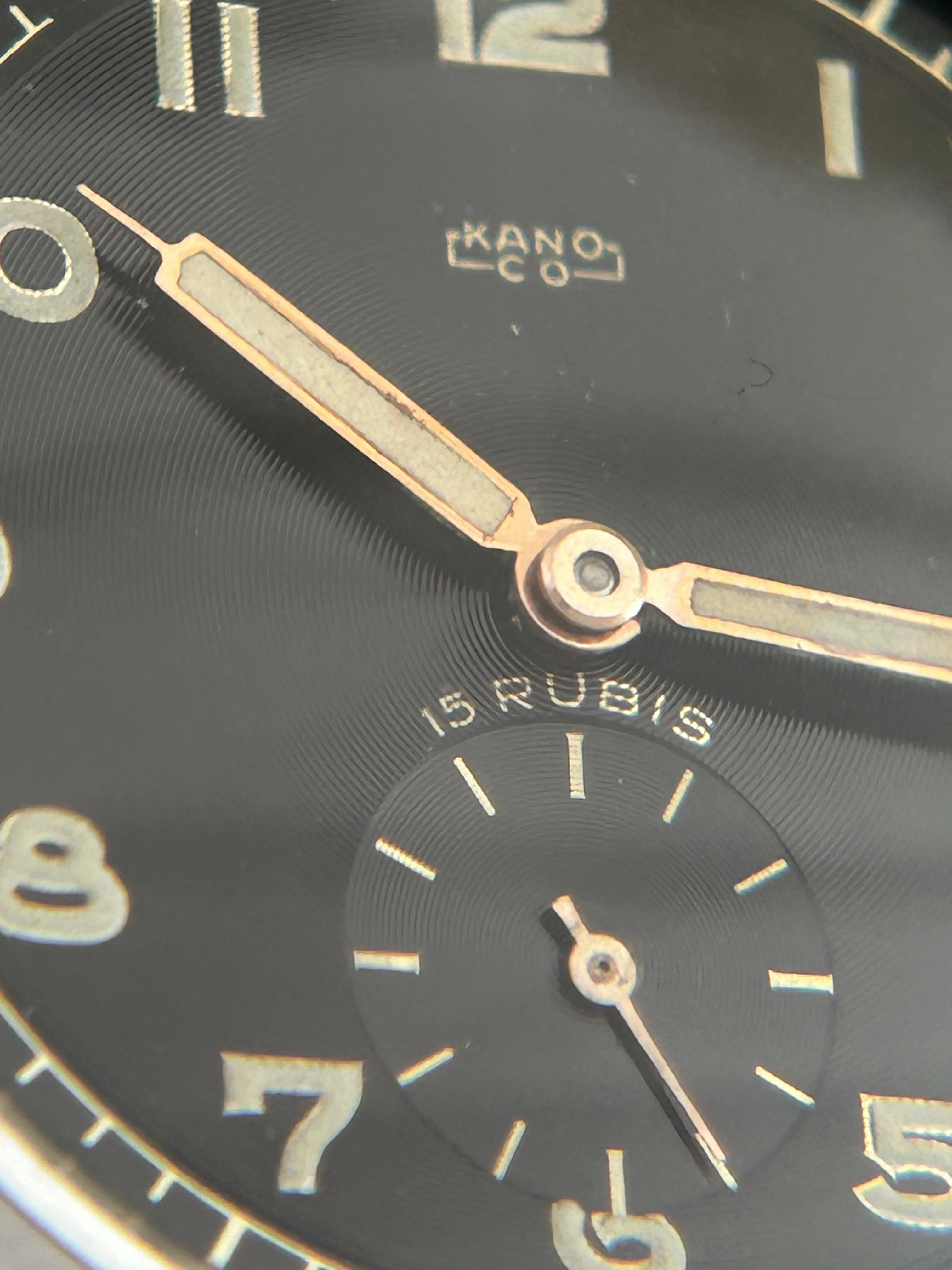 ·Up for sale is a truly remarkable new old stock transitional late-1940s Kano military-style wristwatch, from Karl Nonnenmacher’s Pforzheim-based firm. This is an absolute time capsule in untouched, original condition - incredible black rose-gold sunburst dial.