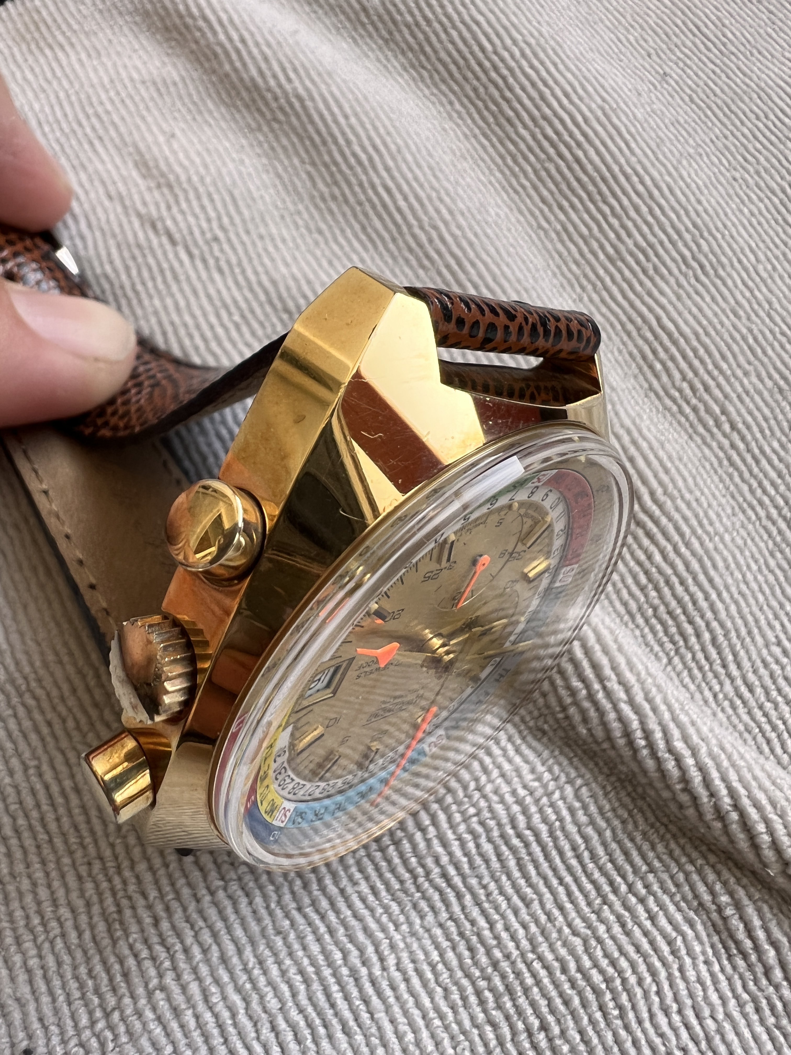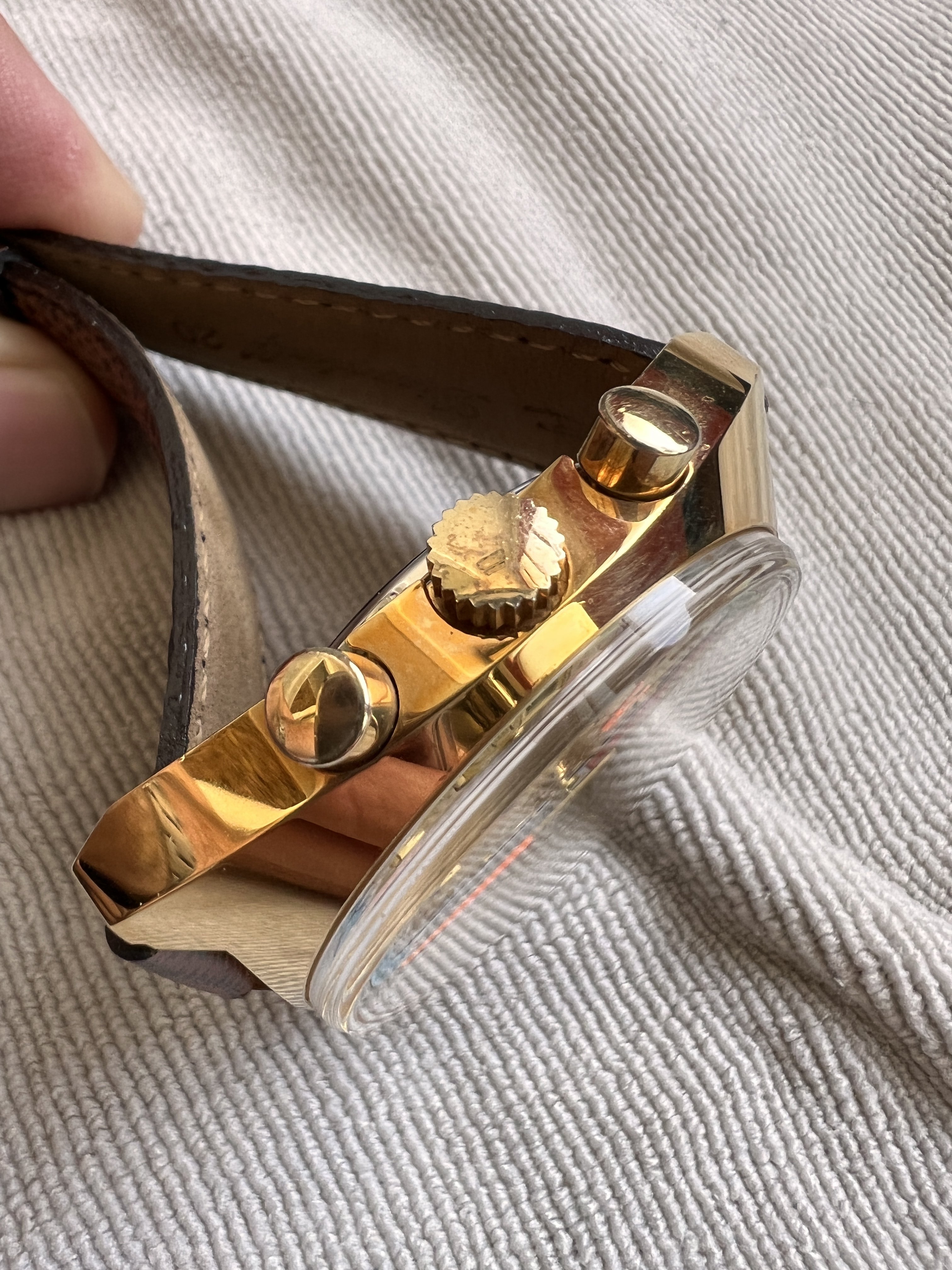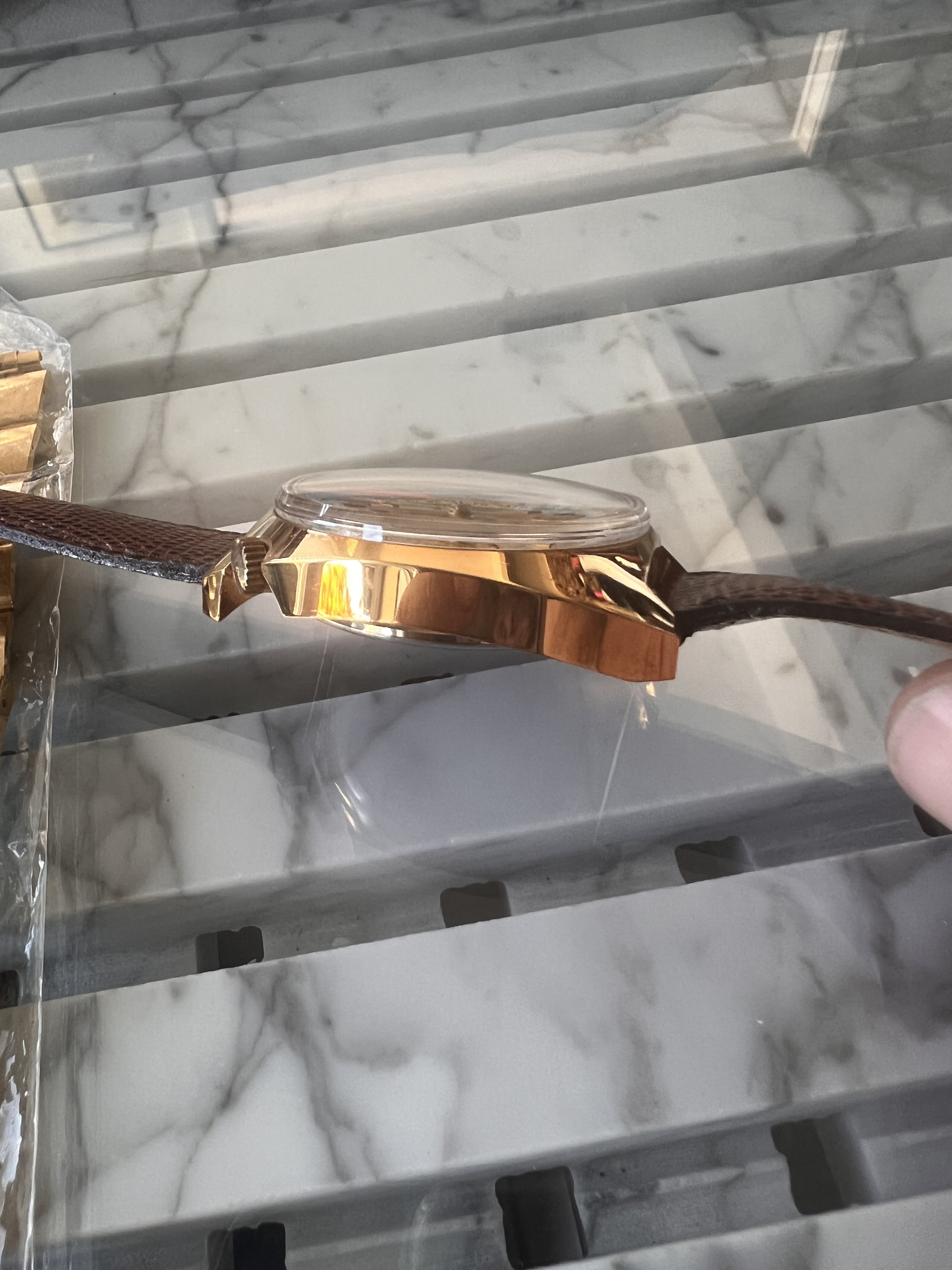 Despite the otherwise NOS condition, there is on the ~7:30 position on the front-facing case a tiny, hairline, scratch in the gold plating. I’ve tried hard to photograph it, and in its most egregious looking lighting - but that is still difficult (see red ring photo). Also, the crown, which is of a slightly different material/plating than the case, has a touch of patina, which I believe could be cleaned off with the appropriate cleaner/cloth but I leave that to its new owner.