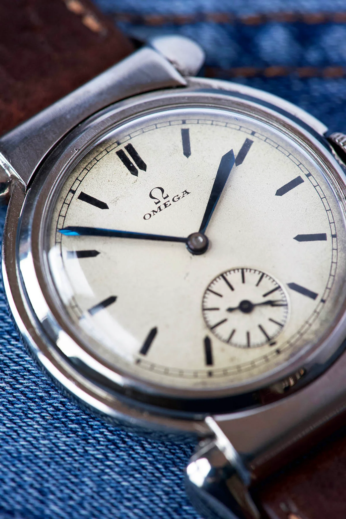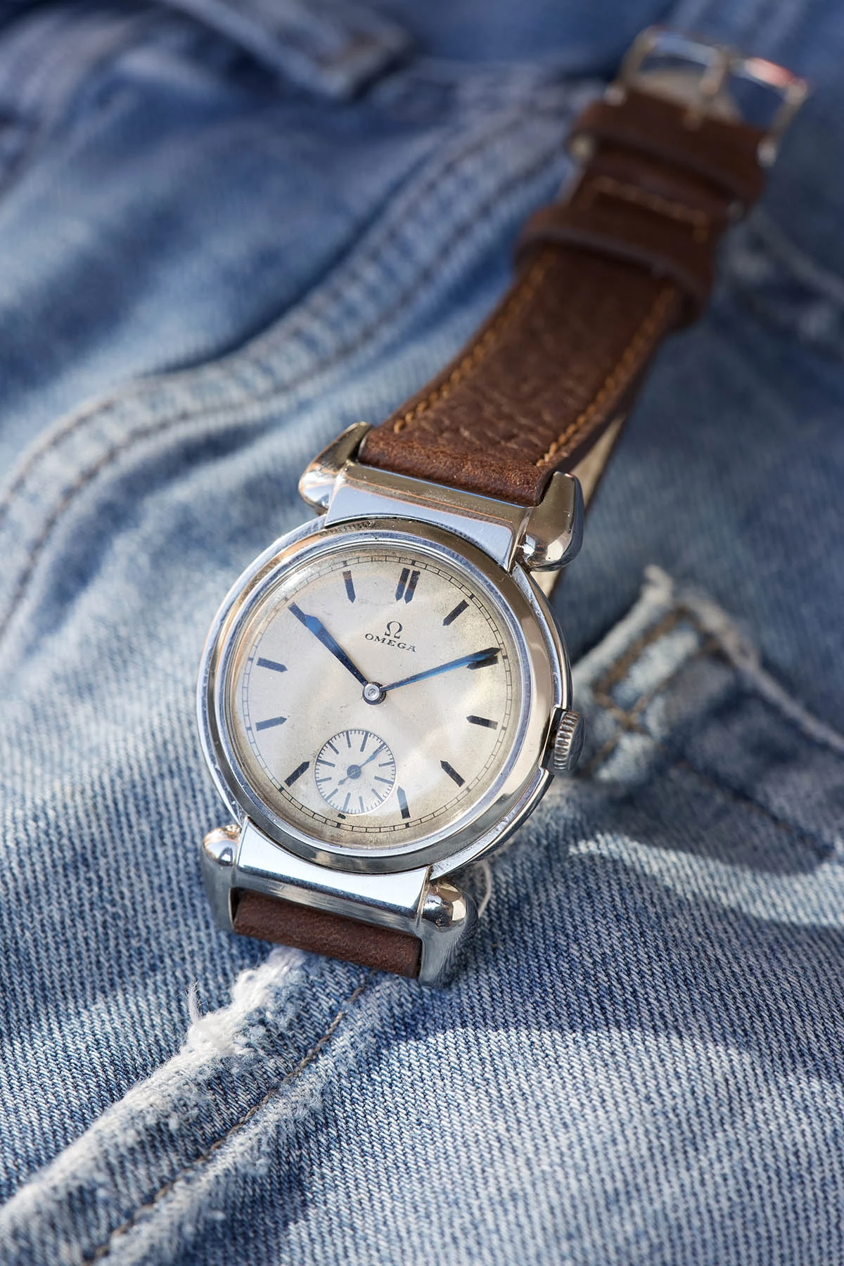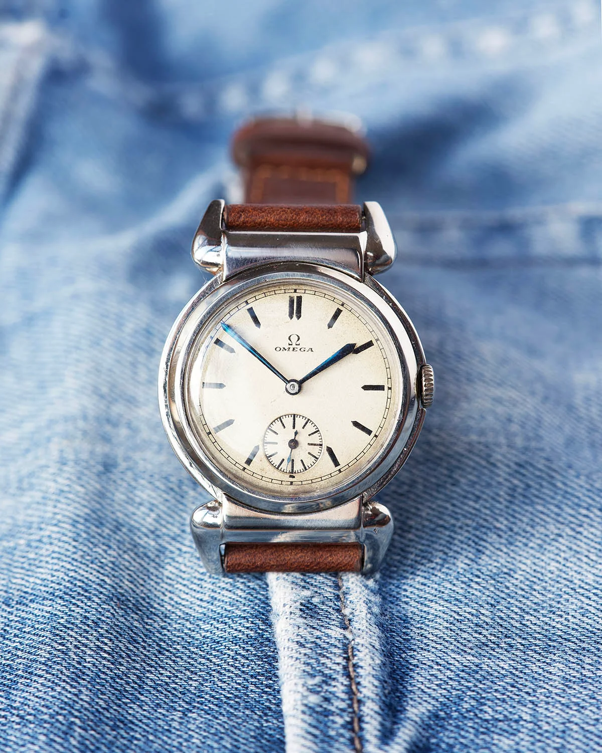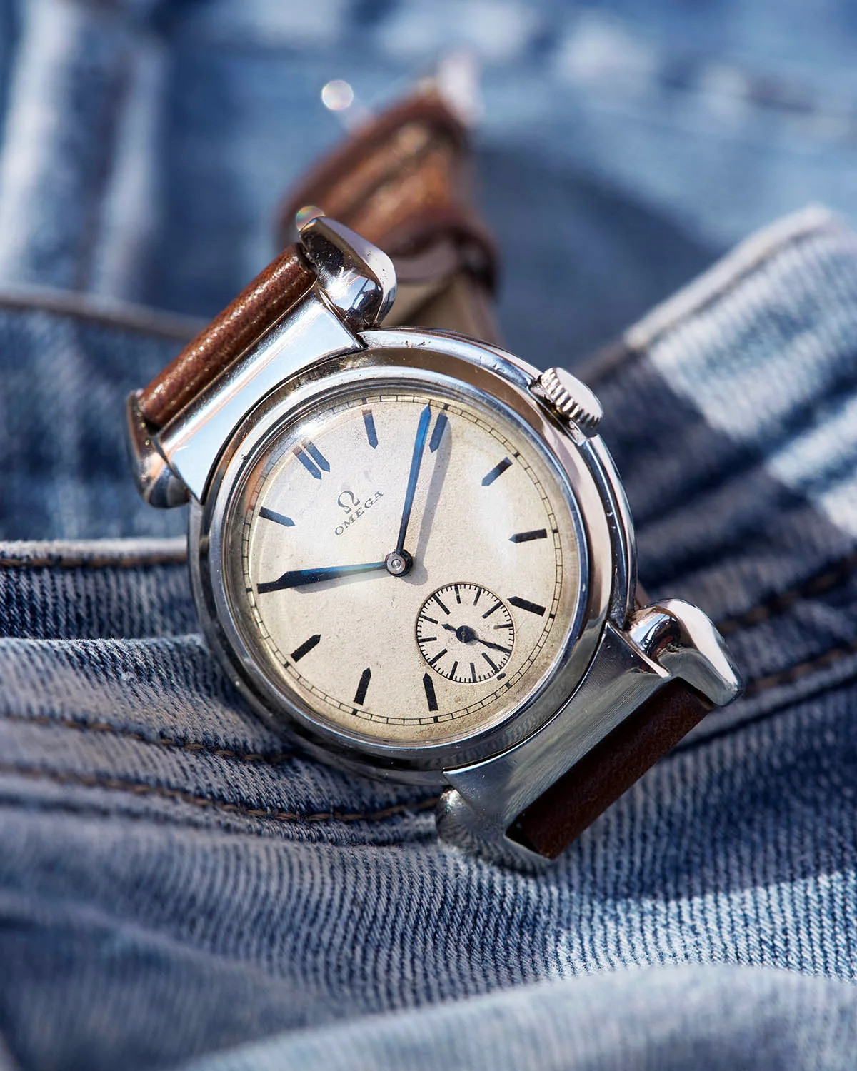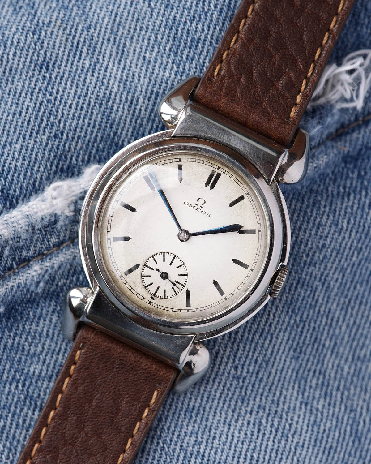 The Omega “Big Scarab” is a rare vintage watch from the 1940s, admired for its bold and distinctive design. Its nickname comes from the large specific lugs, reminiscent of a scarab’s legs. It often features the renowned Omega 30T2 movement, celebrated for its reliability and precision. The 35mm steel case was considered large for its time, adding to its charm. A highly sought-after piece among collectors, it stands out for its unique and elegant aesthetic.