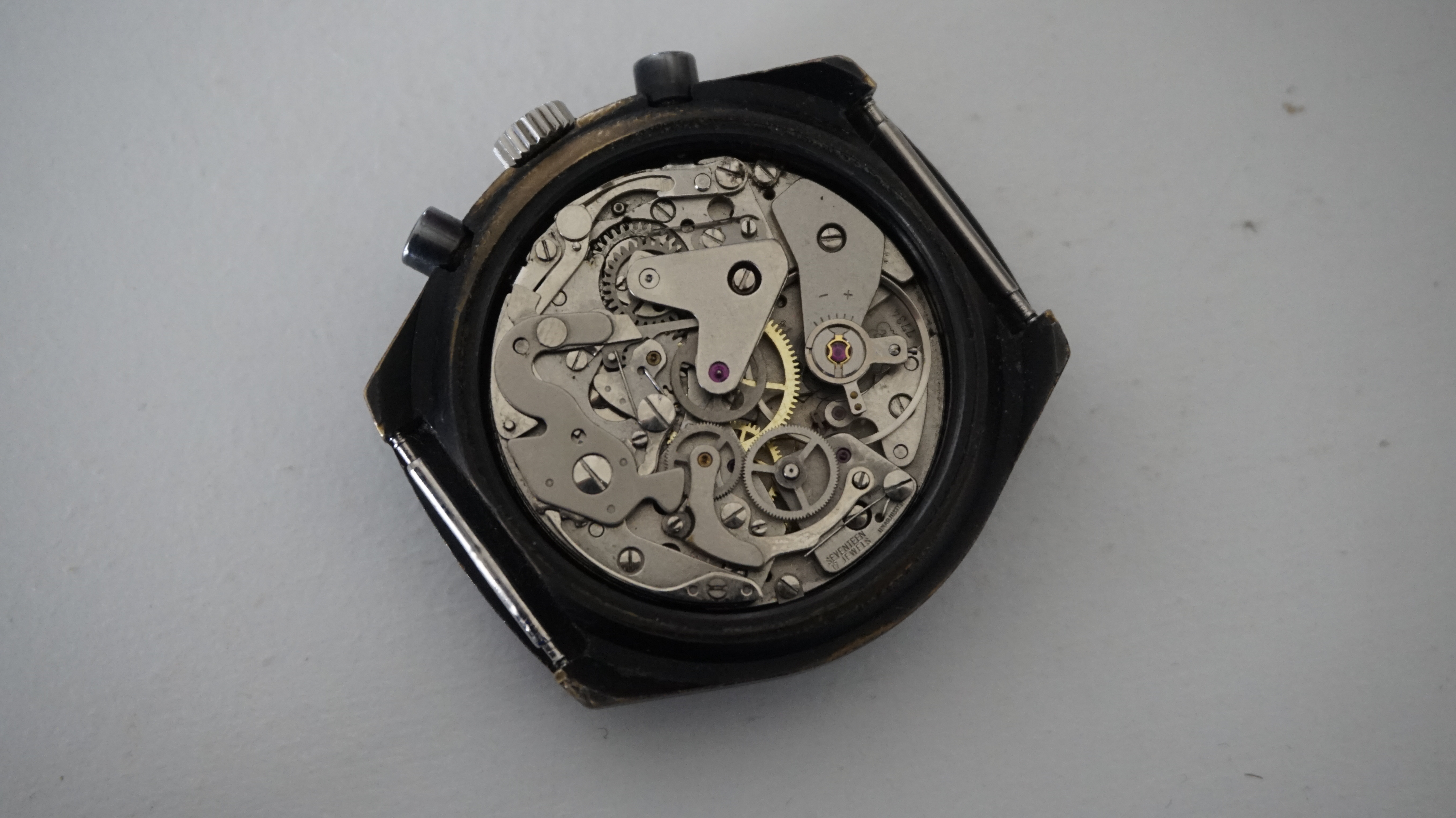 the movement is unsigned, and the back is usigned, just marked 12. the movement is a valjoux 7734 like it should be.