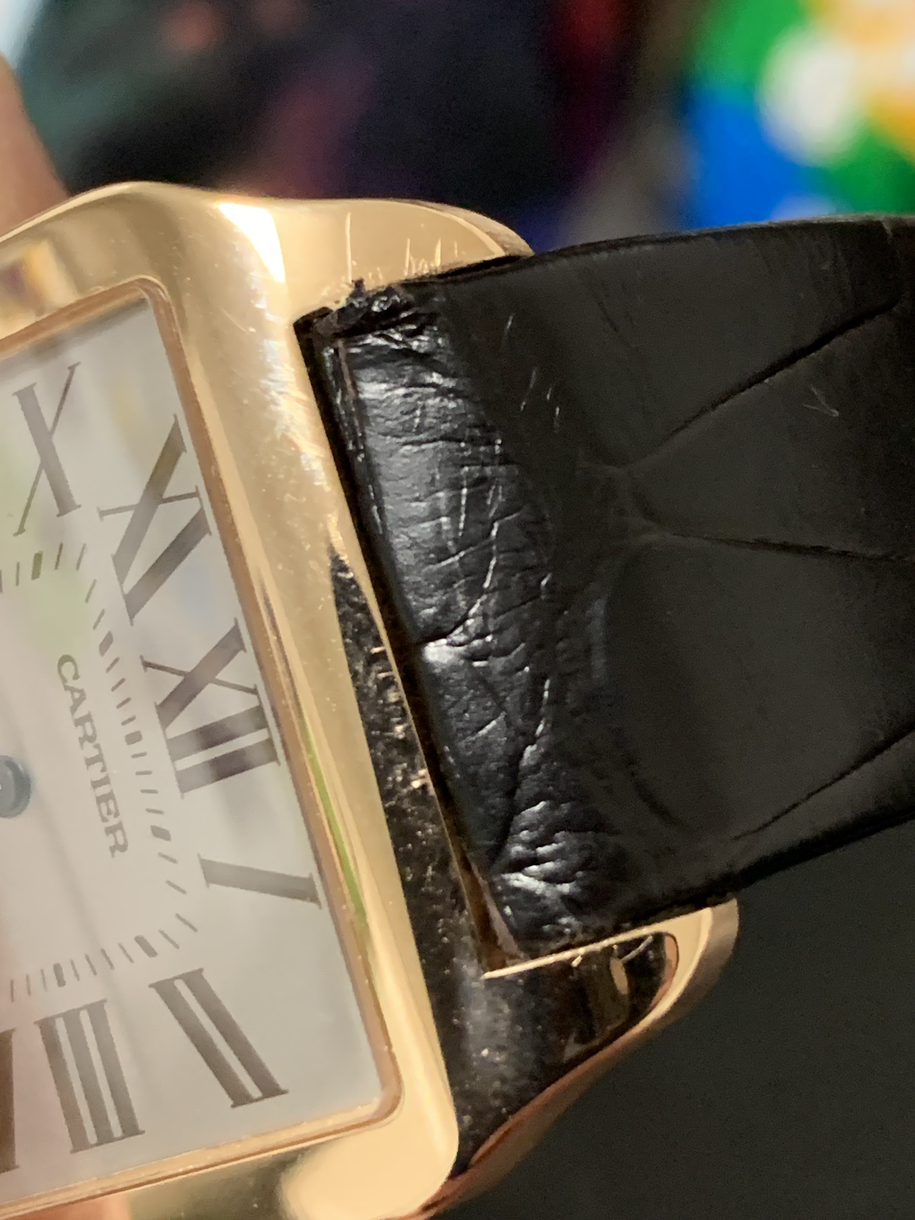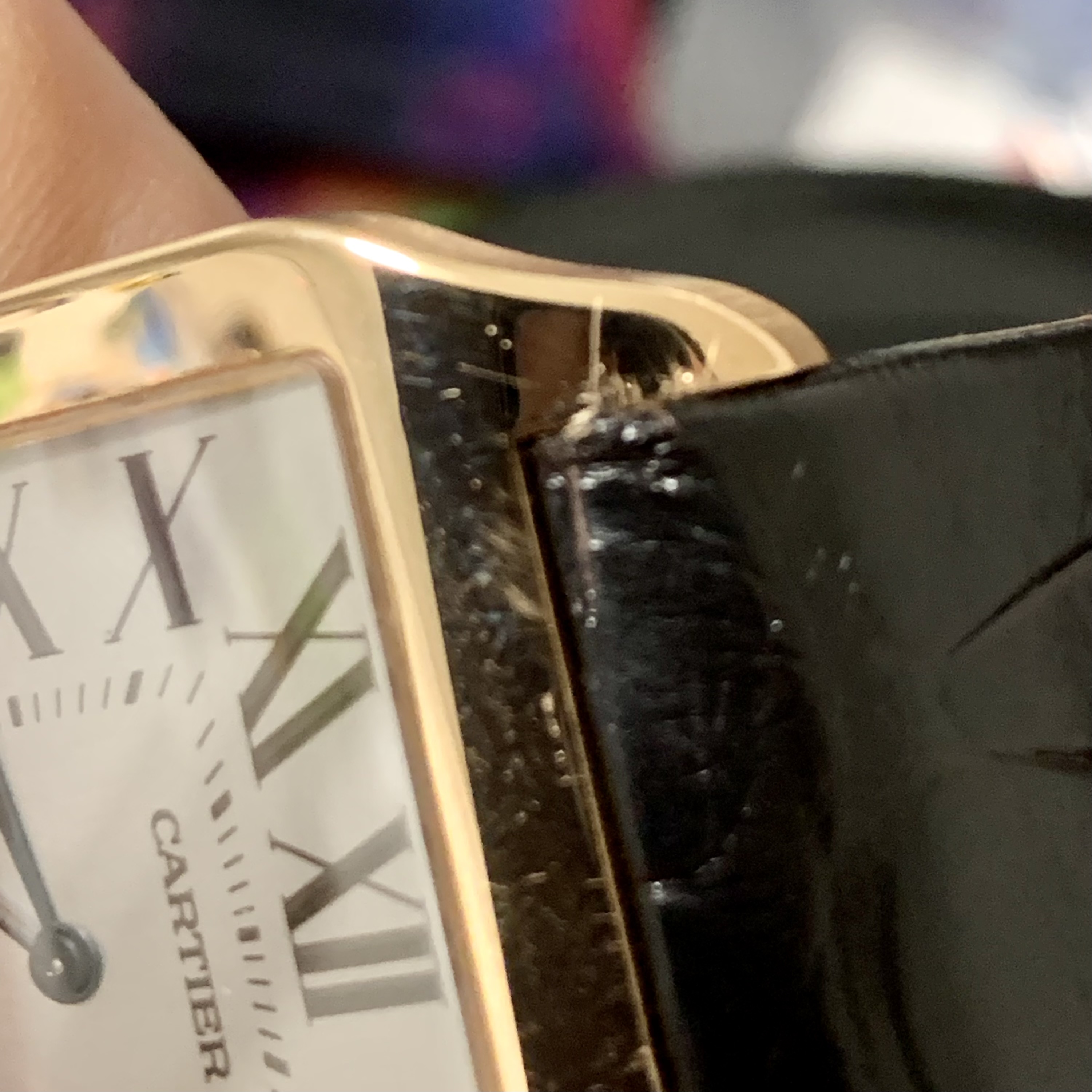 ·I ended up getting my Santos Dumont a full service from my local Cartier boutique. I was fine with the polishing because it’s a dress watch for me and I’d rather it look nice than “vintage”. I also splurged for a new strap even though I could have gotten a custom one for less money. They shipped it to me for free so I didn’t bother to pick it up at the store. However when I got it back today I saw some noticeable scratches at the front lugs where somebody tried to squeeze in a new strap. It almost looks like the strap they installed is 1-2mm too big. I’m sure they’ll offer to repolish it but extra polishing on one lug isn’t what I was aiming for