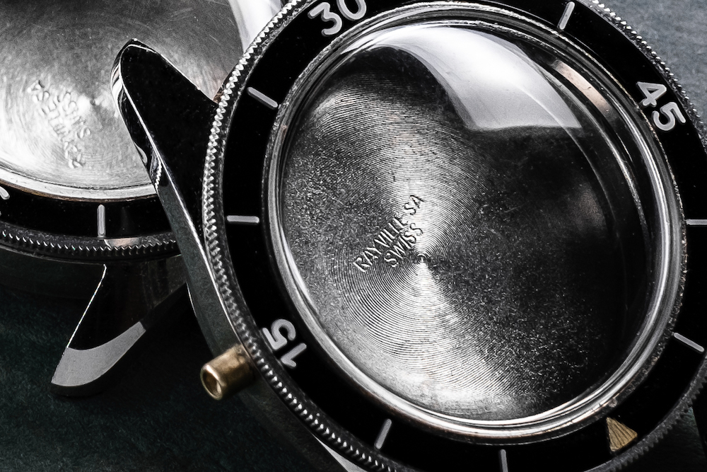 Date window at 4:30 is subdued thanks to the matching black background. Note the beveled frame of the window