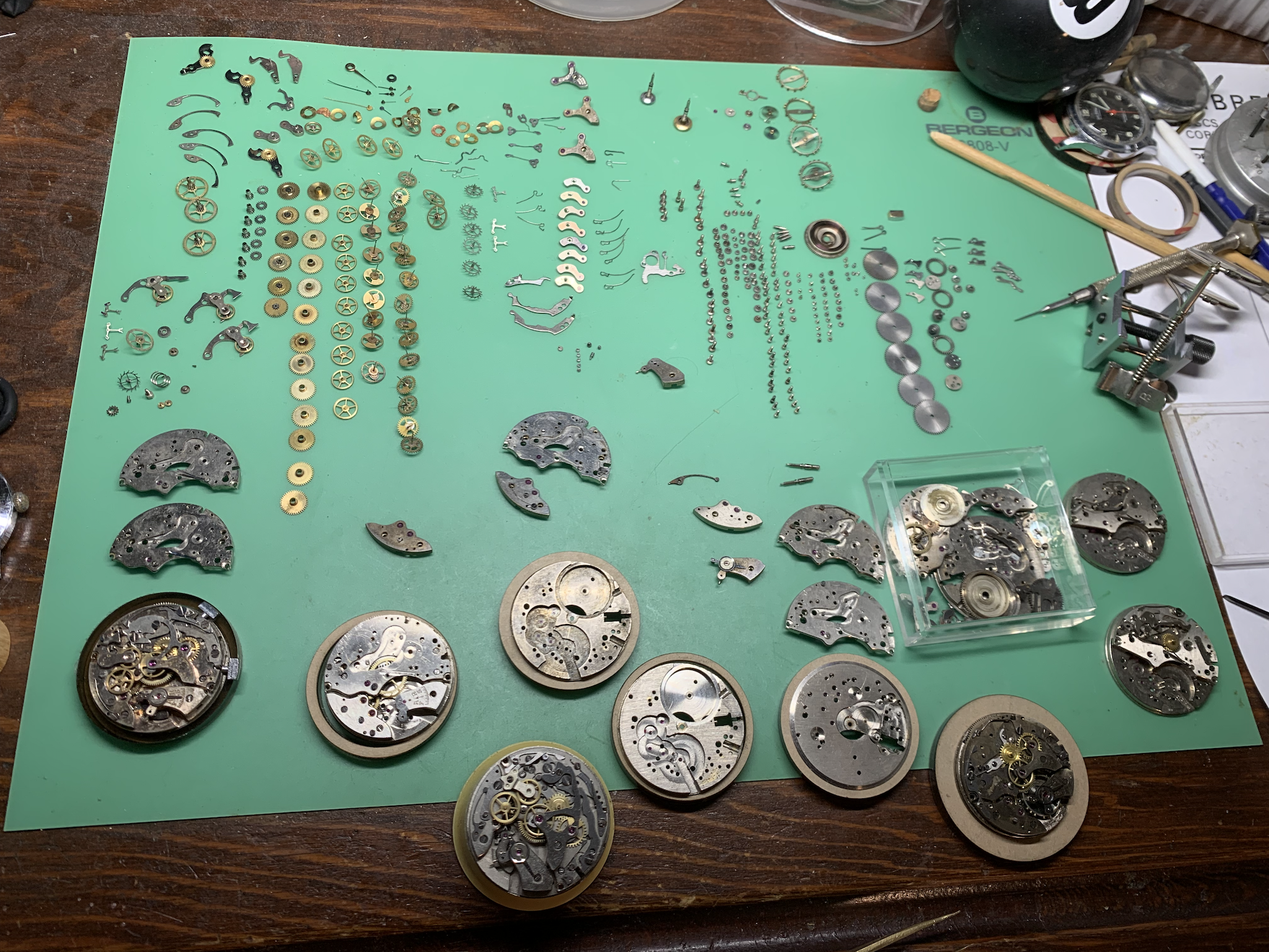 The above image shows one of the many iterations attempting to group these rabbits and spare parts. This shows 4 Landeron 51 and 5 Landeron 48 watches. One of the Landeron 51 watches (lower left) is mostly complete needing a case. The other three are basically parts movements.