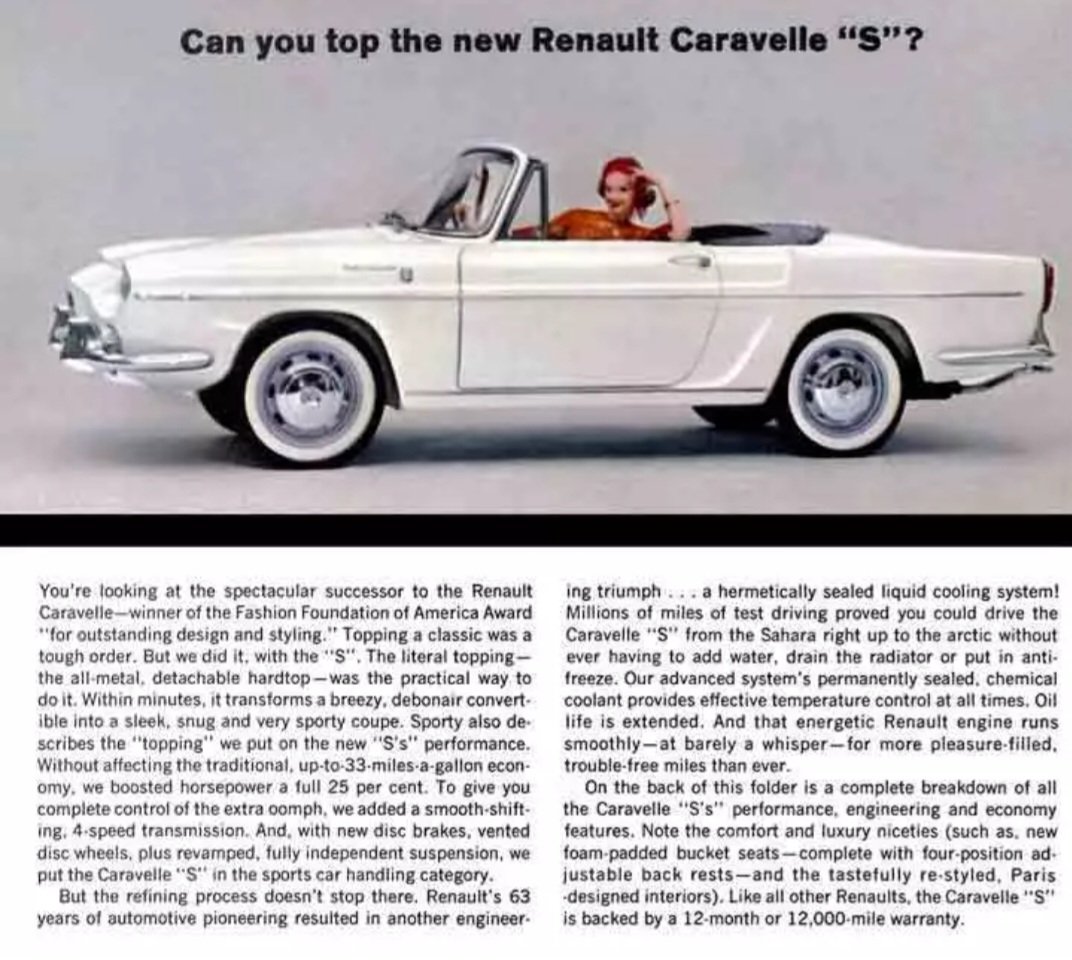 You may be the only person this side of the Atlantic who knows what a Renault Caravelle is. I had 3 1/2 ( half was the rear of one turned into a trailer.)