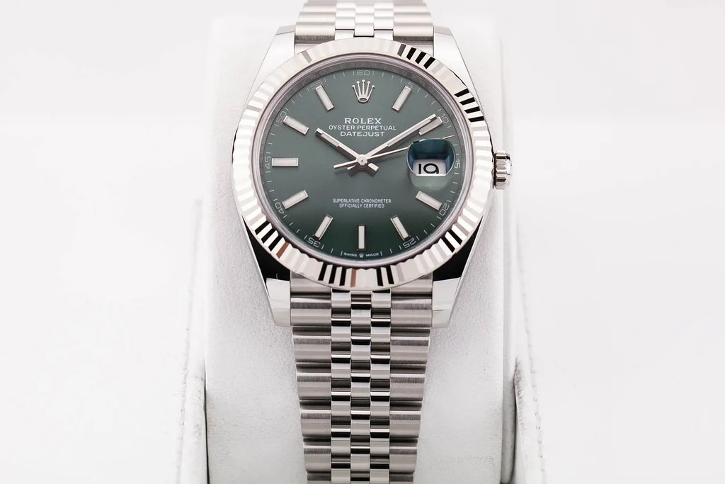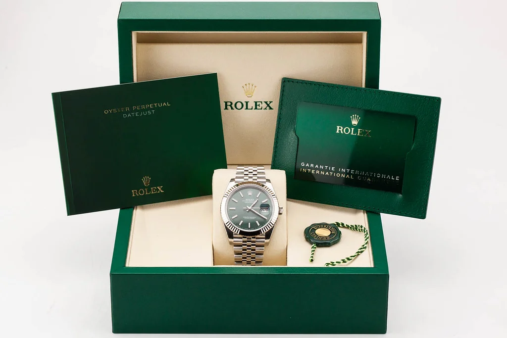 ·Up for sale is a brand new Rolex Datejust 41 with Mint Green Stick Dial with Fluted Dial on Jubilee Bracelet, reference # 126334. It comes complete with all newly redesigned boxes, papers, booklets, hang tag, and Rolex Warranty Card dated September 2025.