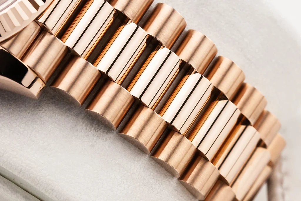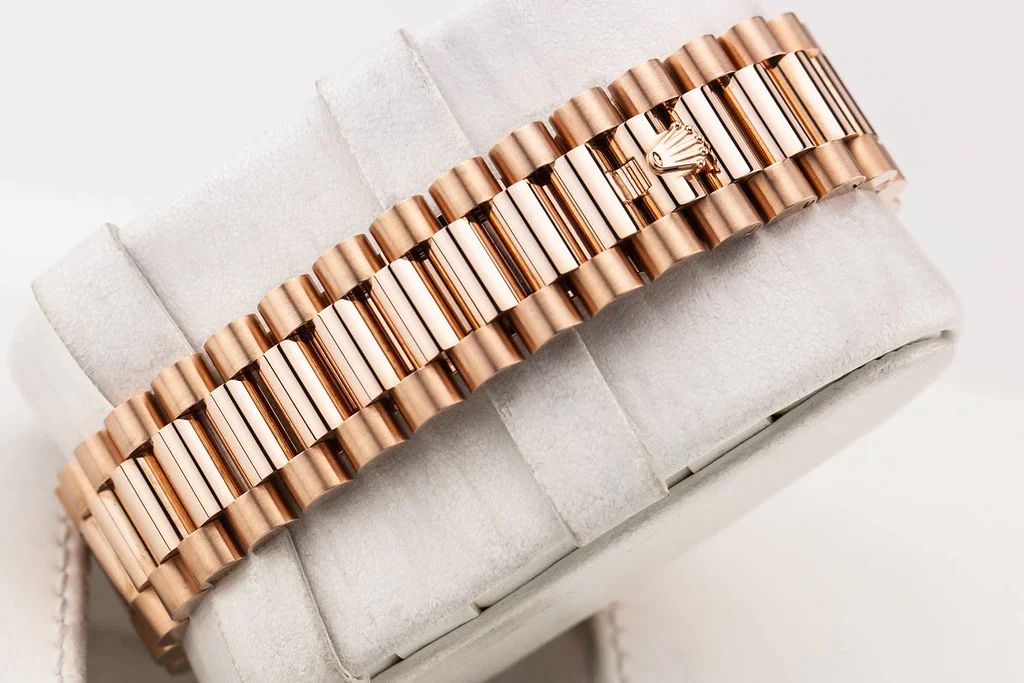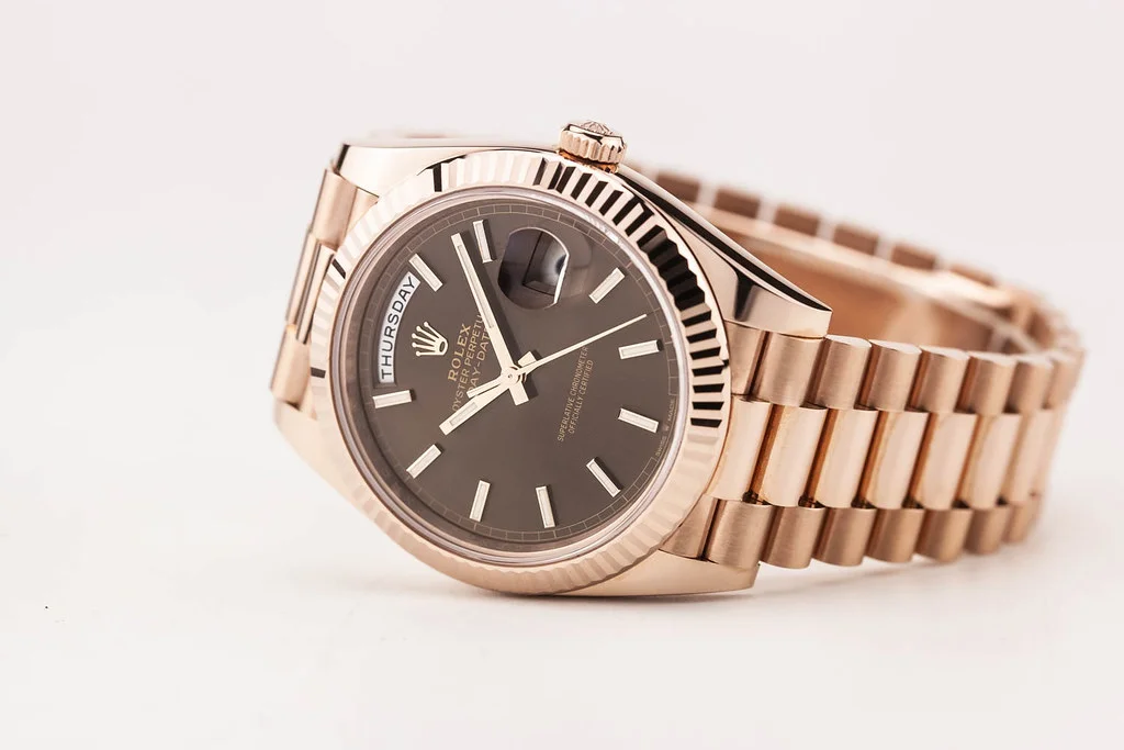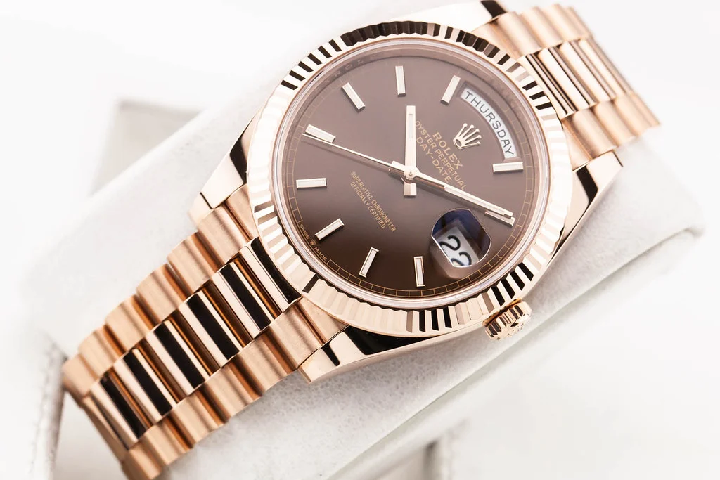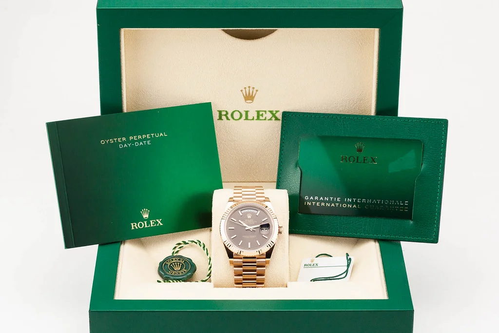 ·Up for sale is a brand new / unworn condition Rolex Day-Date 40mm Everose Gold Chocolate Brown Dial with Fluted Bezel on President Bracelet, reference # 228235 It comes complete with all boxes, papers, booklets, hang tags, and Rolex Warranty Card dated February 2025.