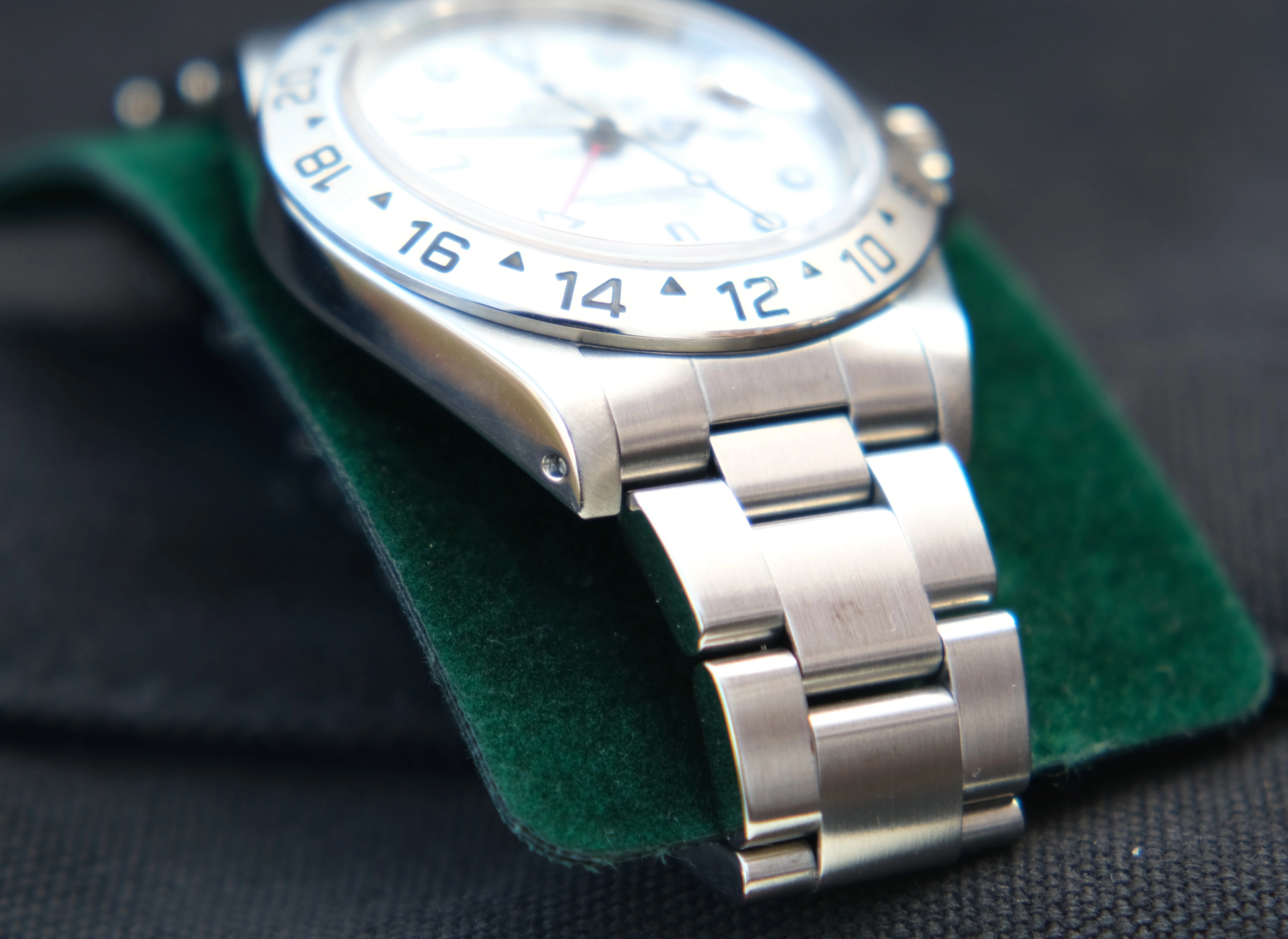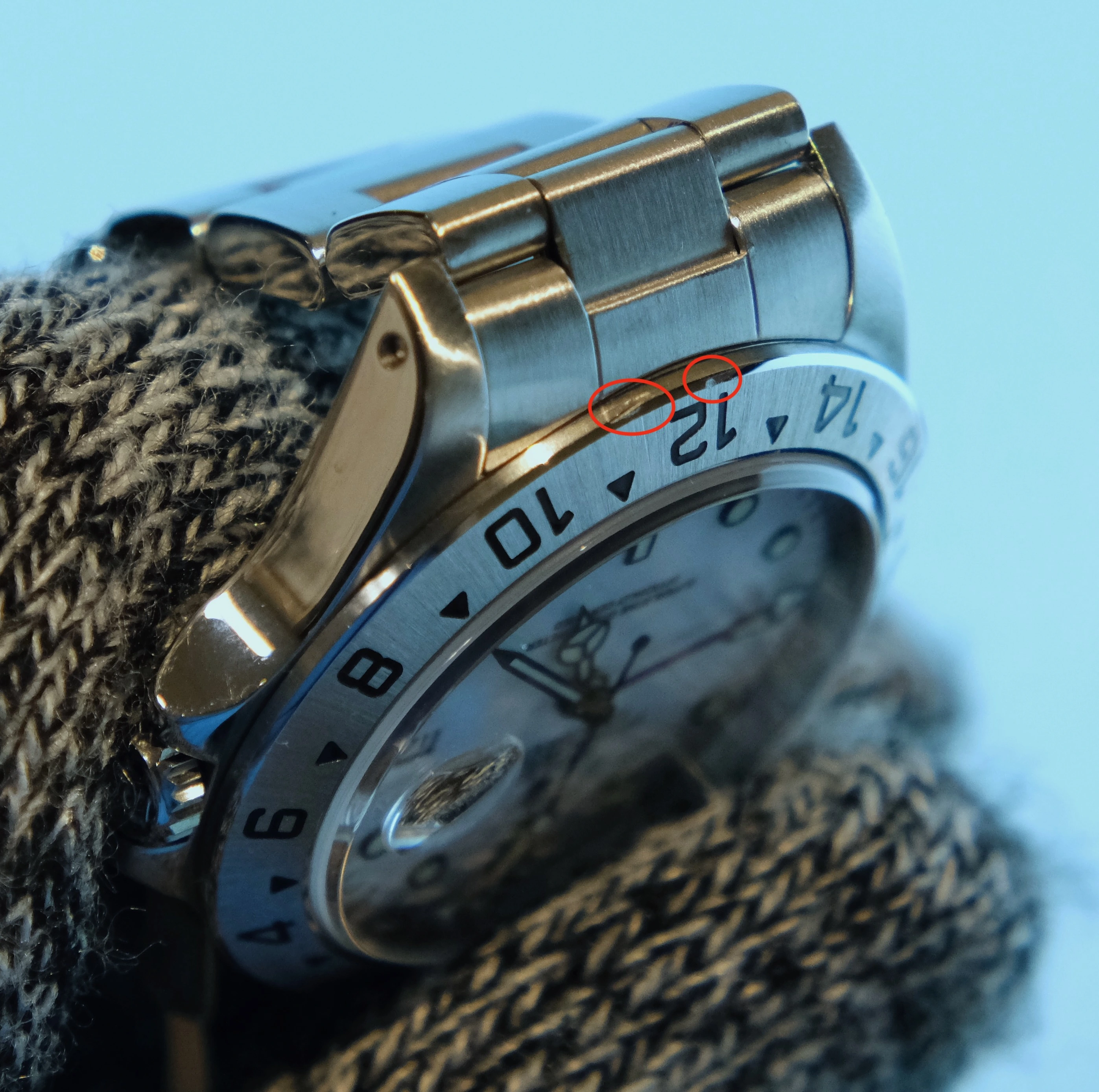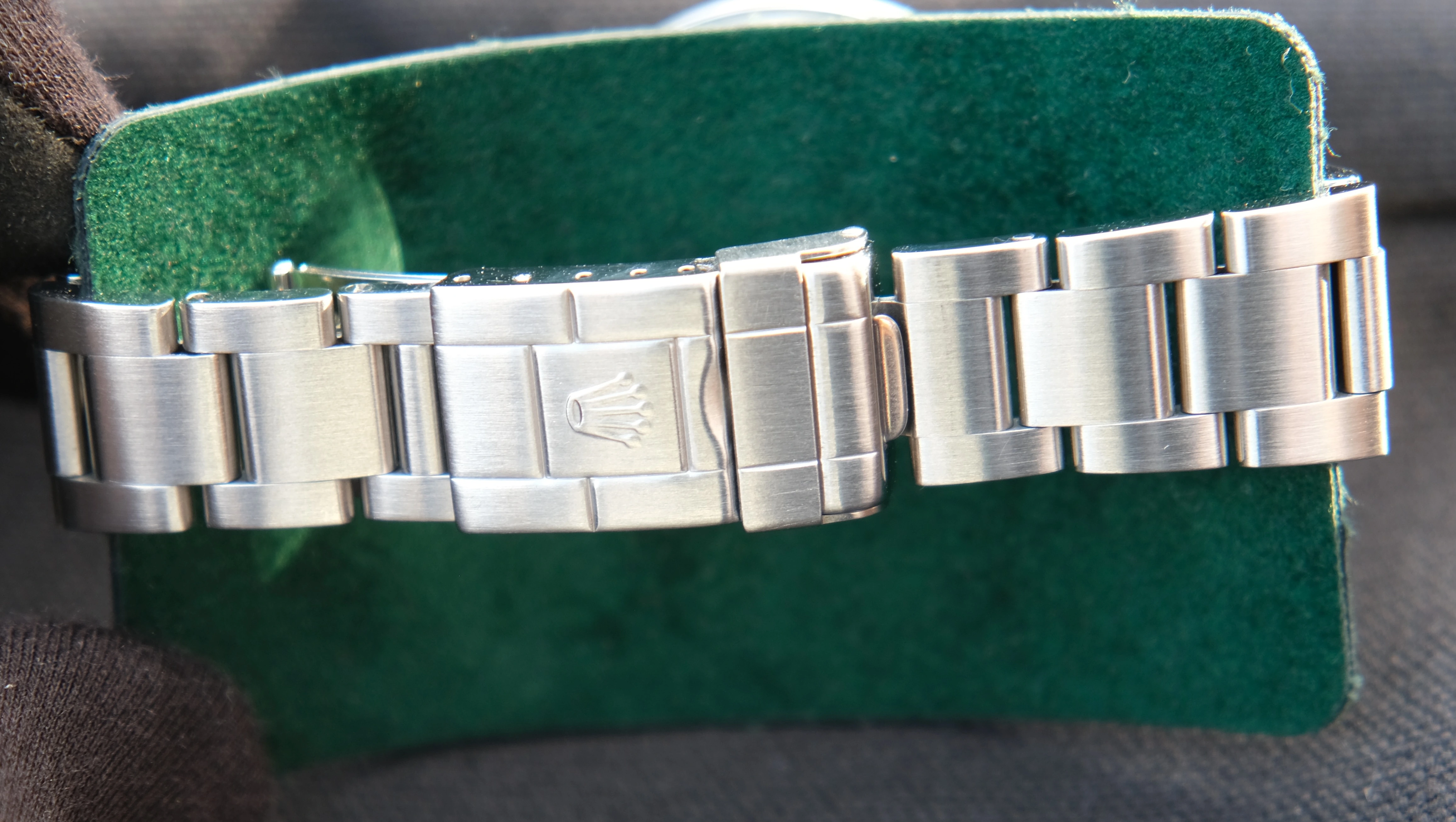 The watch is in overall good condition with light scratches on the case, bezel, and bracelet. The scratches a very superficial and could be removed with the lightest of polishes should one choose to do so. The most noticable scratches (as demonstrated in the pictures below) are one the undersides of the lugs (from strap changes), on the top of the lug at 7 o'clock, and on the edge of the bezel near the 12 hour marker on the 24 hour scale. There are no signs of wear on the crystal that I can see. As the pictures show, the lugs are still thick and the spring bars do not come close to poking through the drilled lug holes. Although I will not guarantee accuracy (though Rolex does until May of 2026), the watch averages +1 sec/day on my wrist.