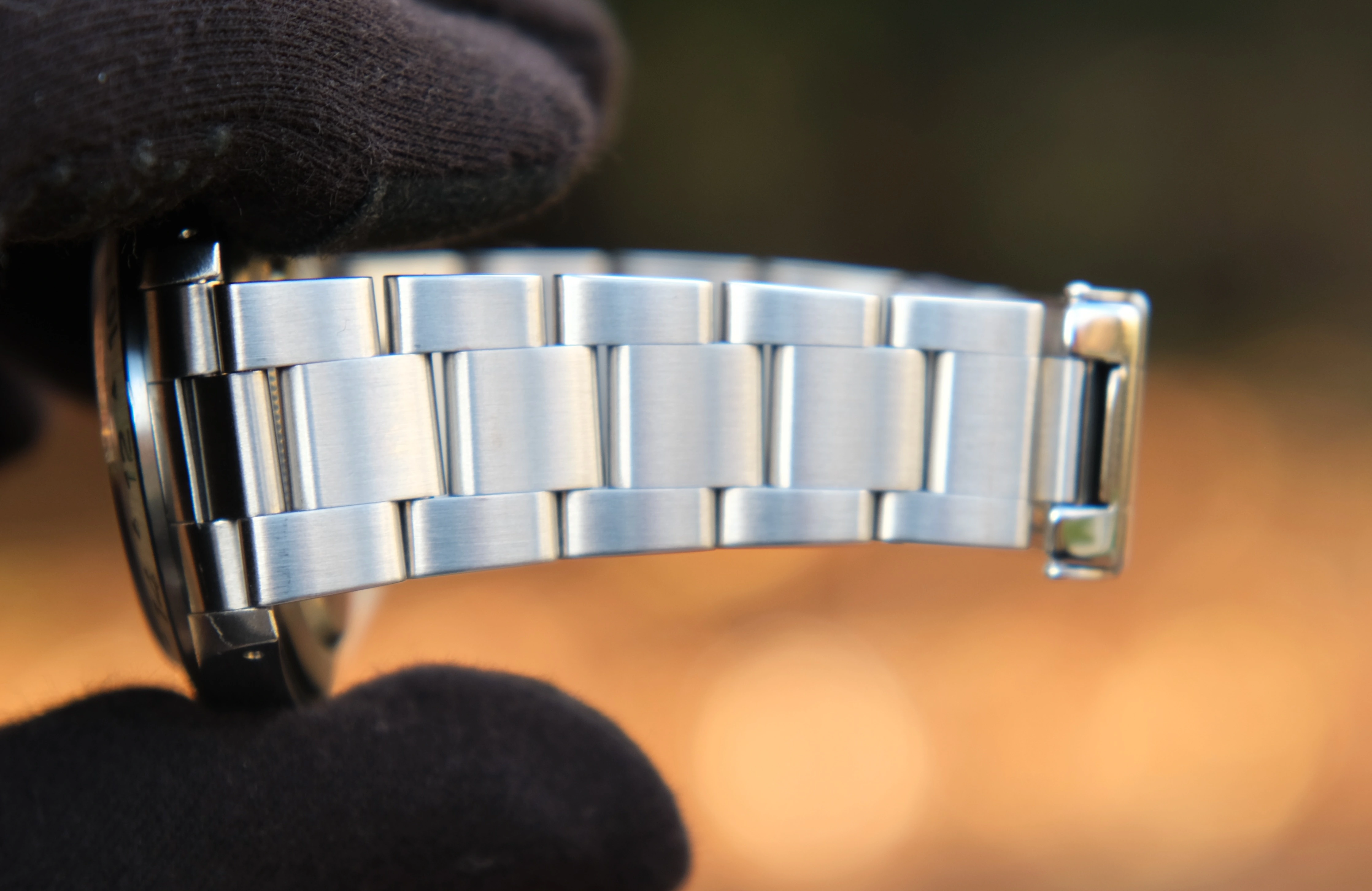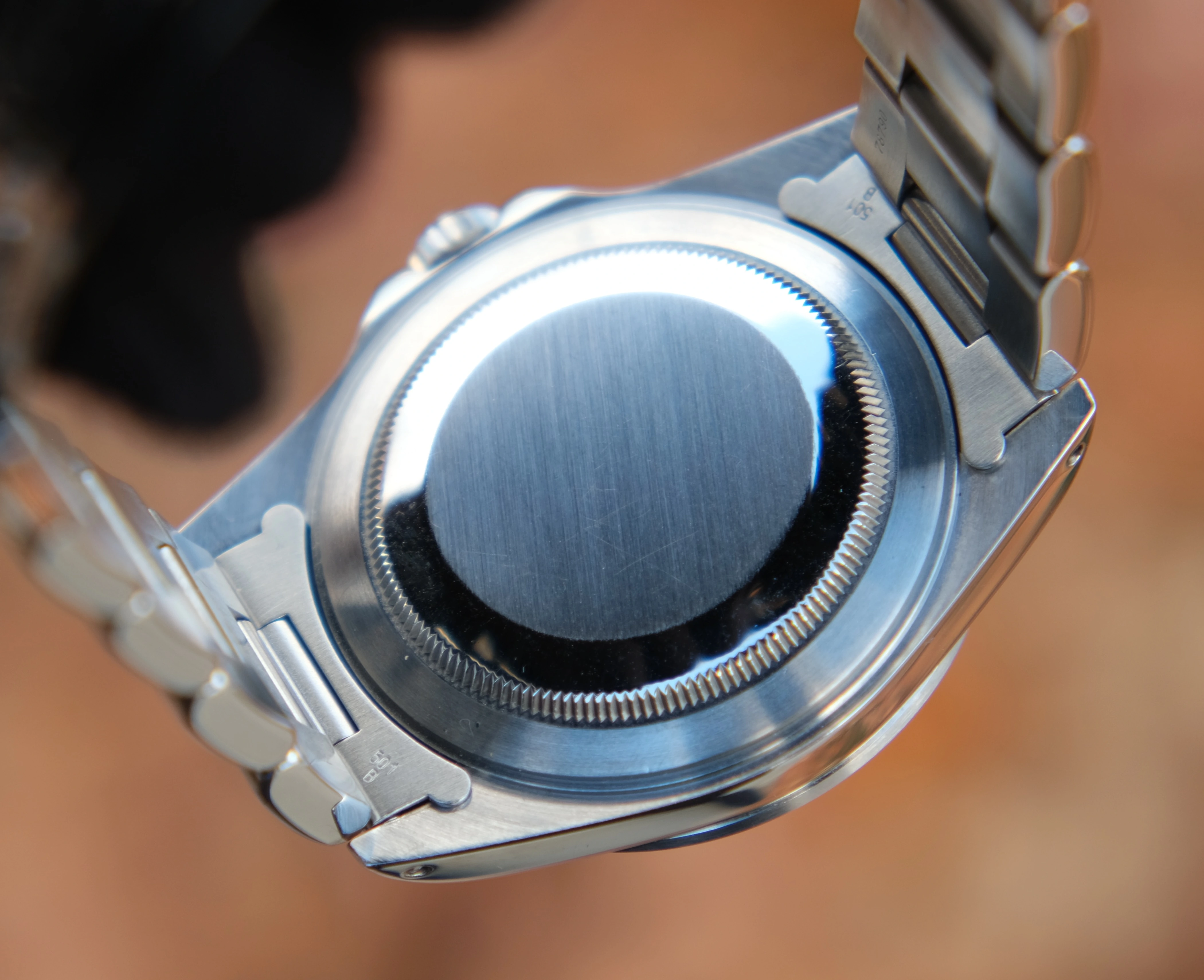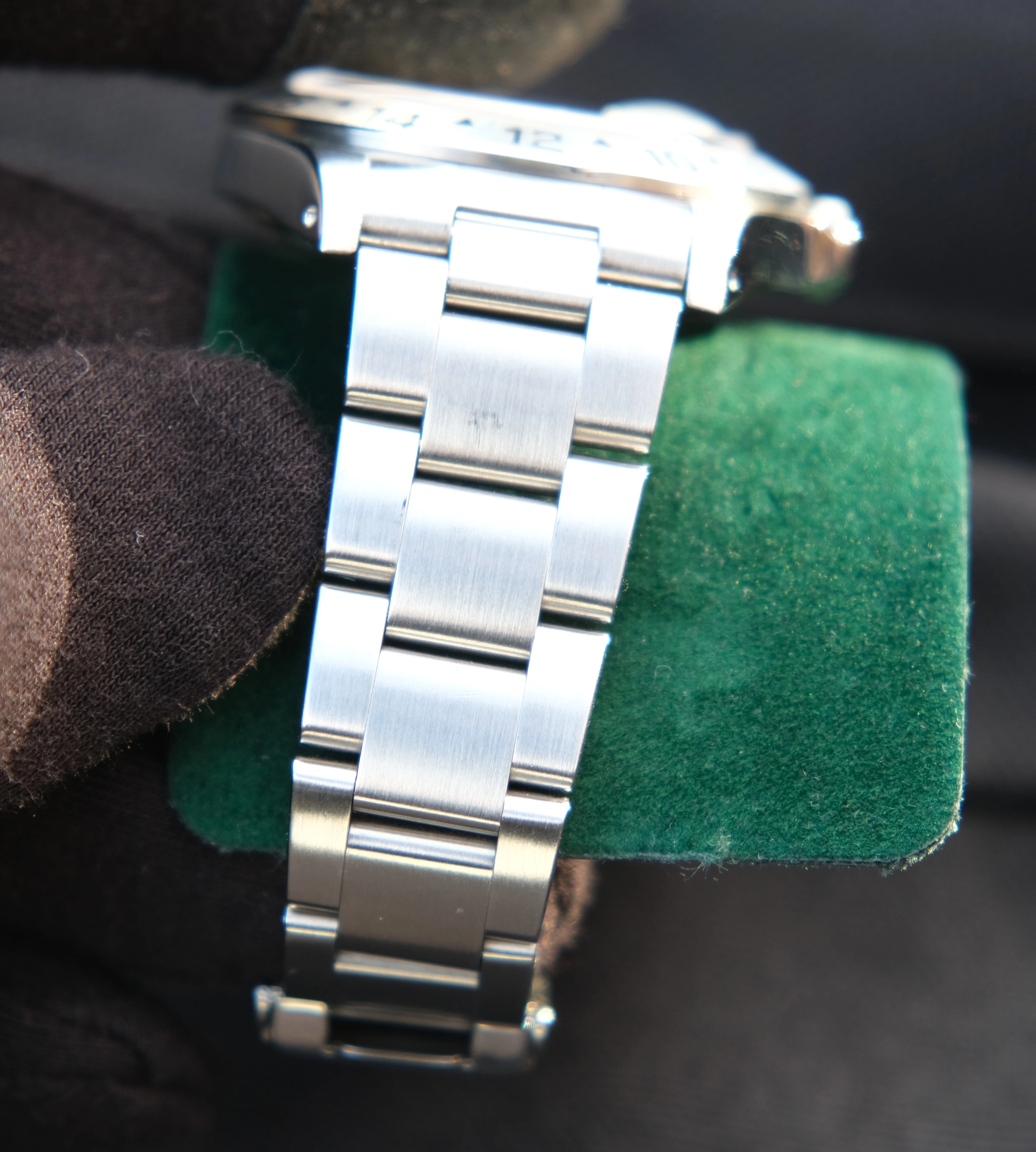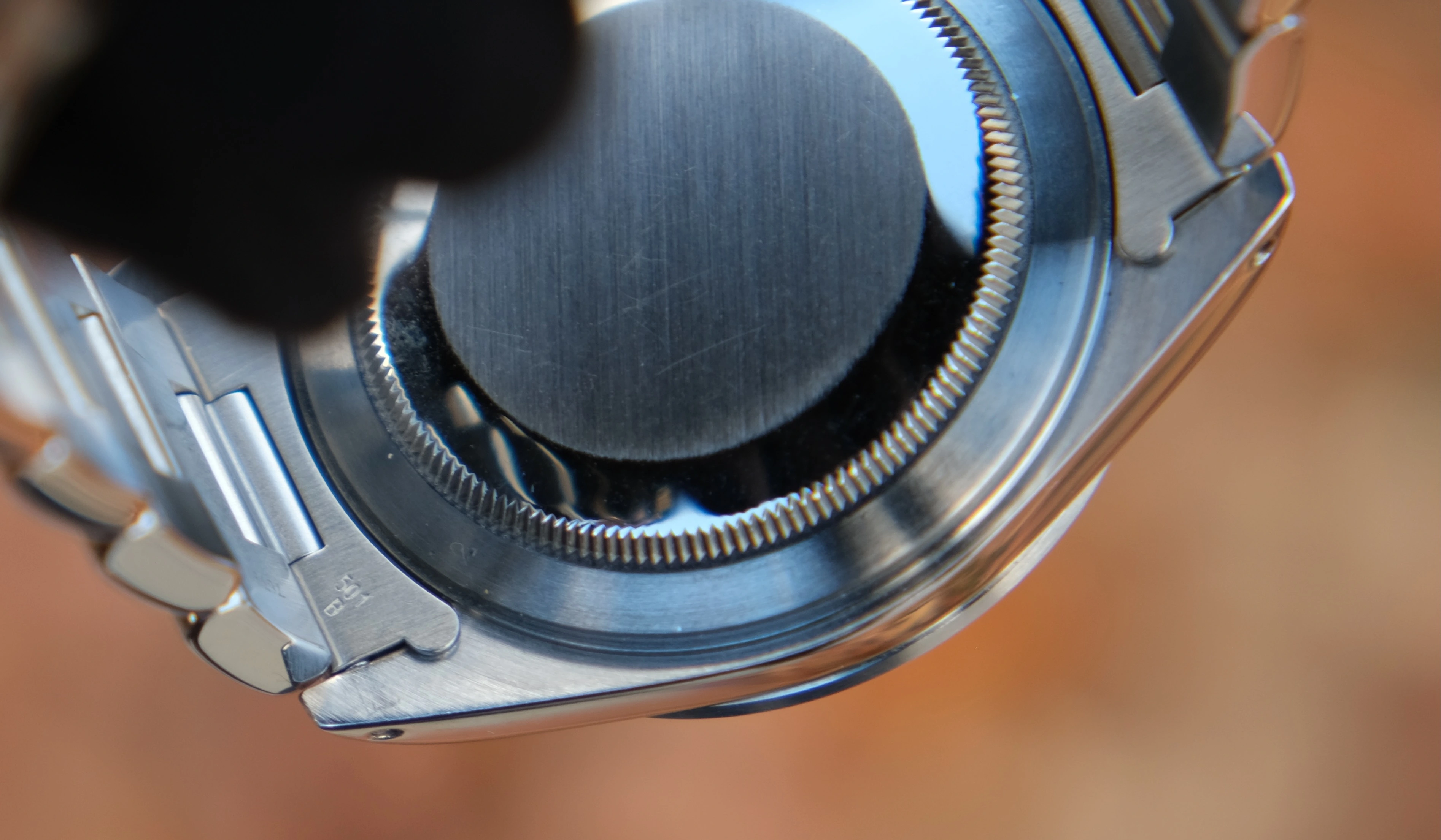 The watch is in overall good condition with light scratches on the case, bezel, and bracelet. The scratches a very superficial and could be removed with the lightest of polishes should one choose to do so. The most noticable scratches (as demonstrated in the pictures below) are one the undersides of the lugs (from strap changes), on the top of the lug at 7 o'clock, and on the edge of the bezel near the 12 hour marker on the 24 hour scale. There are no signs of wear on the crystal that I can see. As the pictures show, the lugs are still thick and the spring bars do not come close to poking through the drilled lug holes. Although I will not guarantee accuracy (though Rolex does until May of 2026), the watch averages +1 sec/day on my wrist.