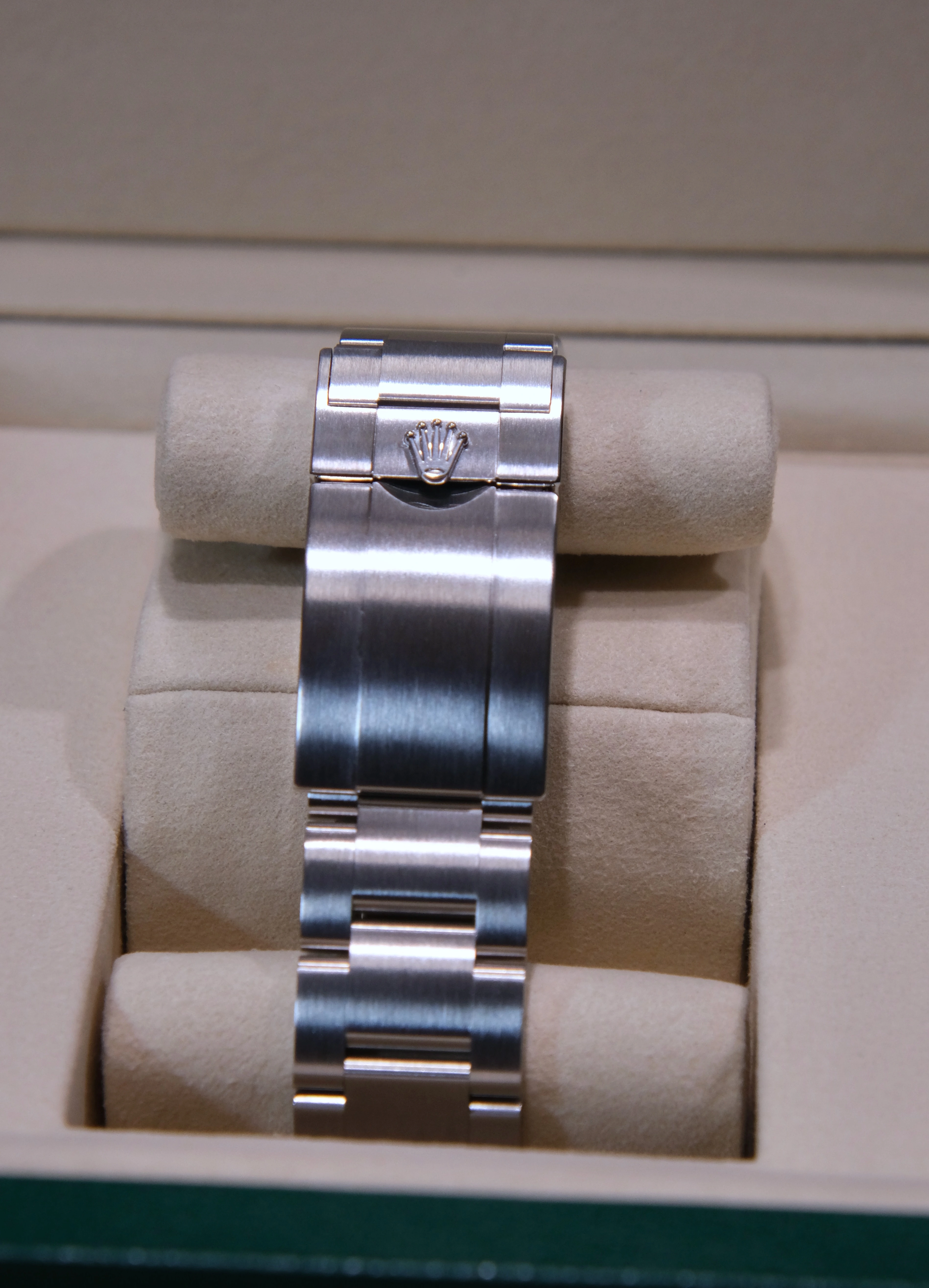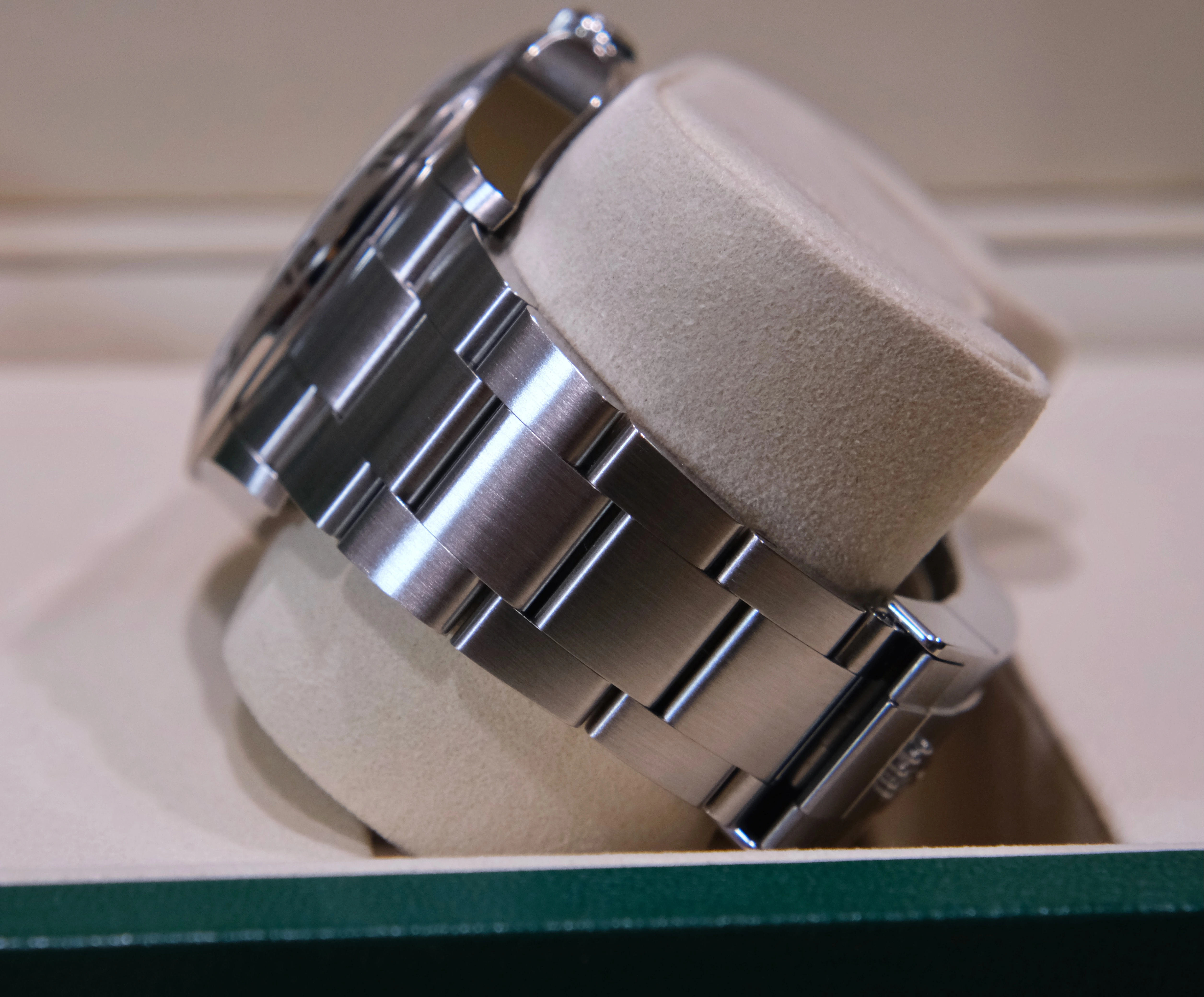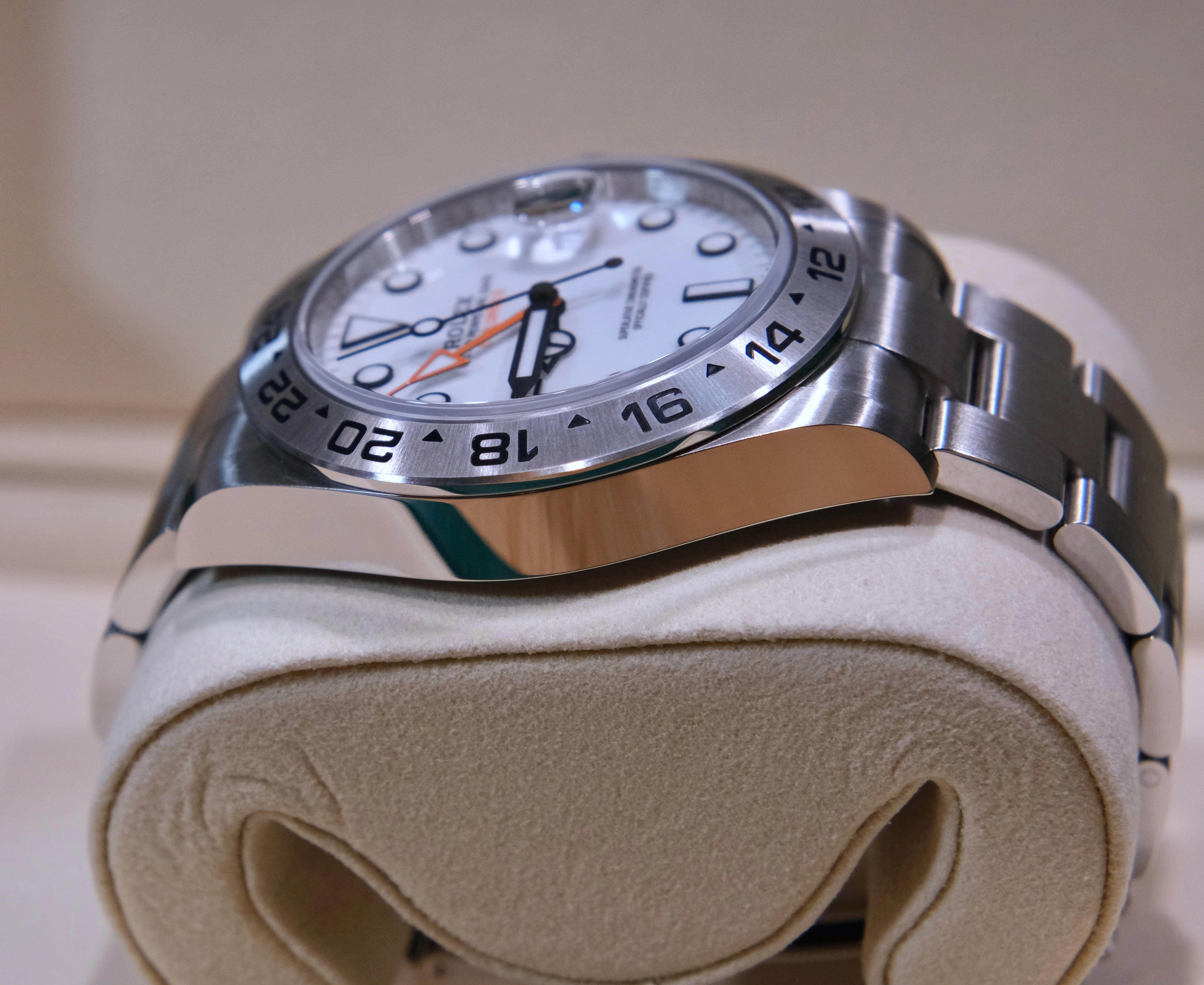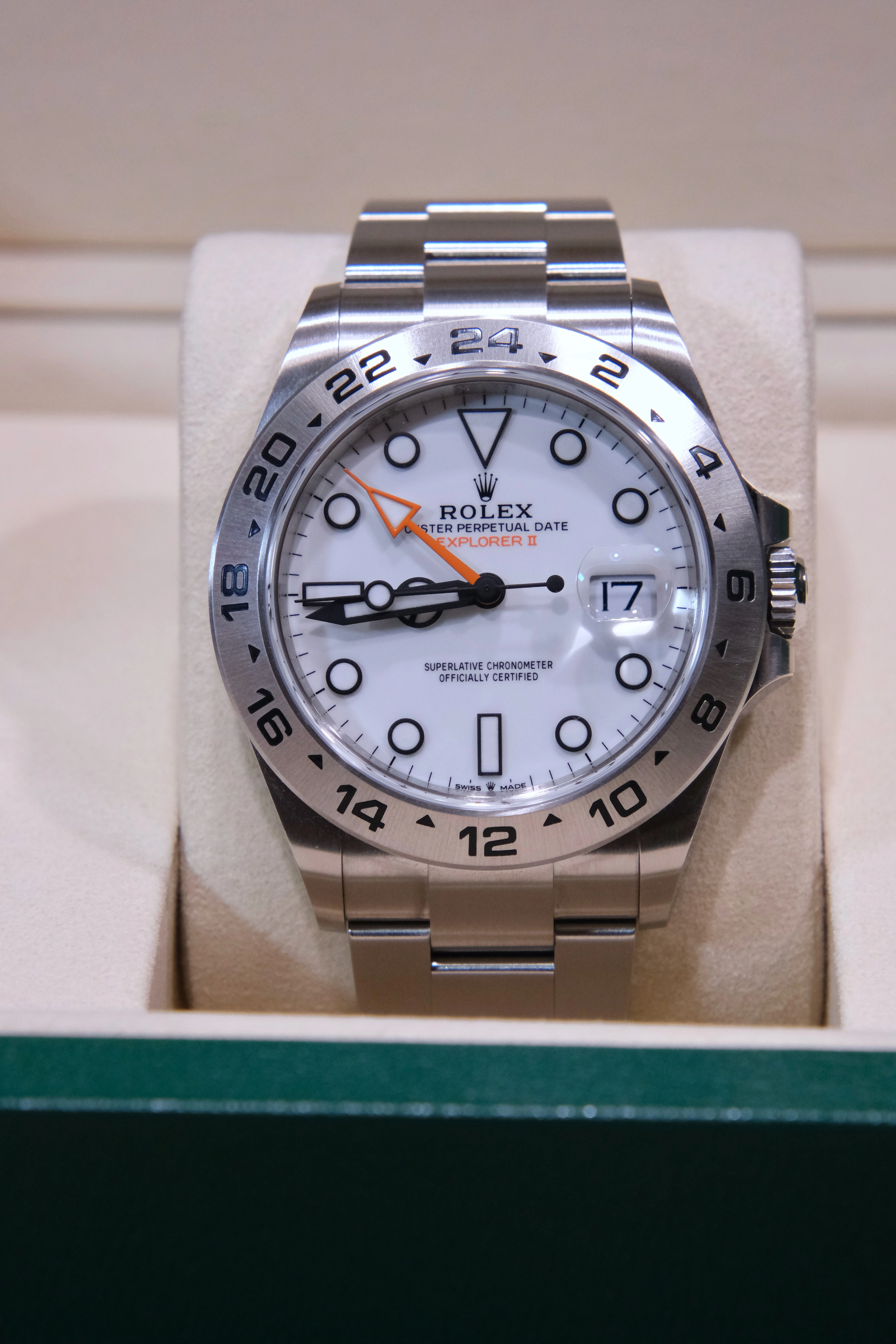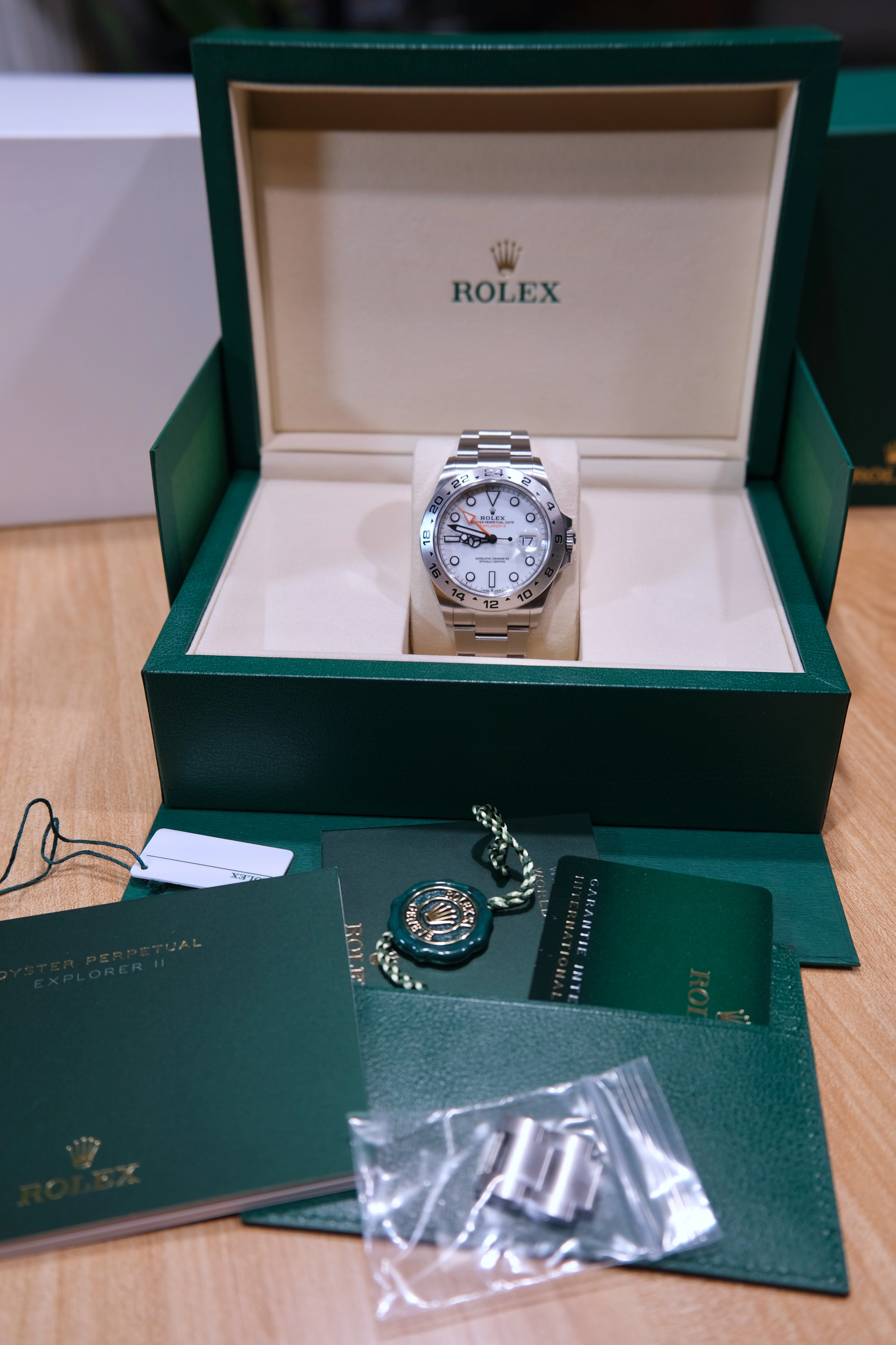 This Explorer II (ref. 226570) was purchased earlier this month from an authorized Rolex dealer. It is in excellent condition and I can find no blemishes. It comes full set with inner and outer cardboard boxes, newer style green Rolex watch box, manual, warranty booklet, warranty card, white hang tag, chronometer tag, and two removed links (the bracelet is currently sized for my 6.7" wrist).