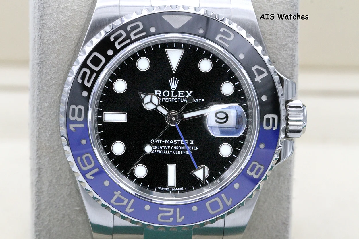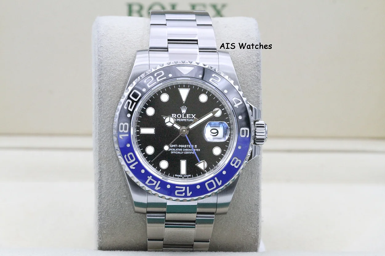 Up for sale is a Discontinued Rolex GMT Master II 116710 BLNR Black Blue Batman Ceramic Bezel Box & Papers. The timepiece is in excellent condition.