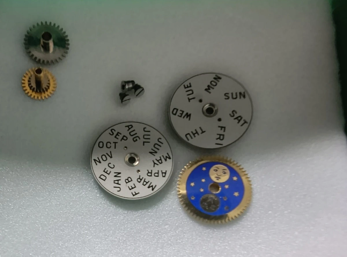 Ca. ~75 yrs old new old stock service parts for the 8171 Rolex Moonphase. Materials from an old watchmaking estate, to my surprise.