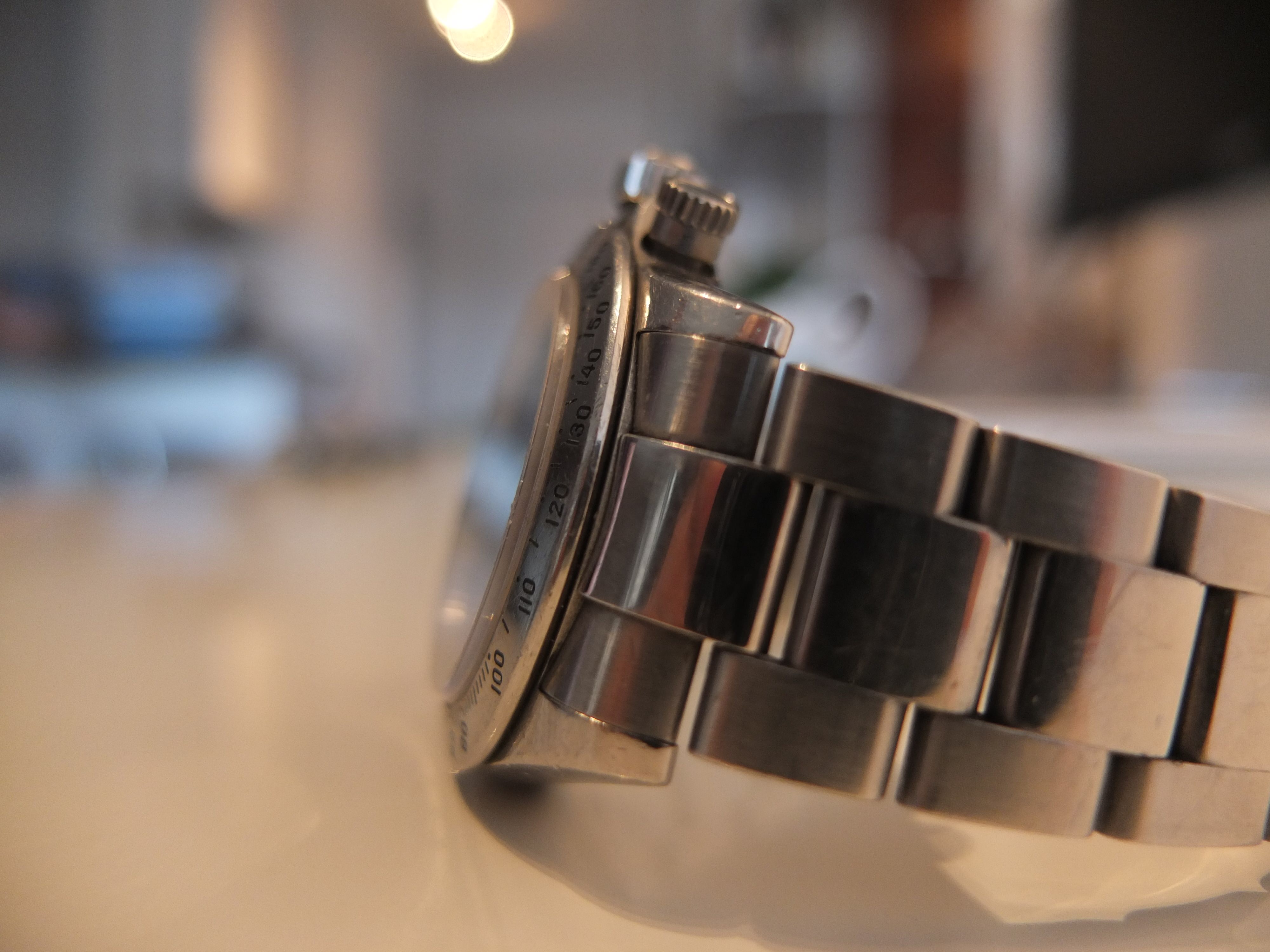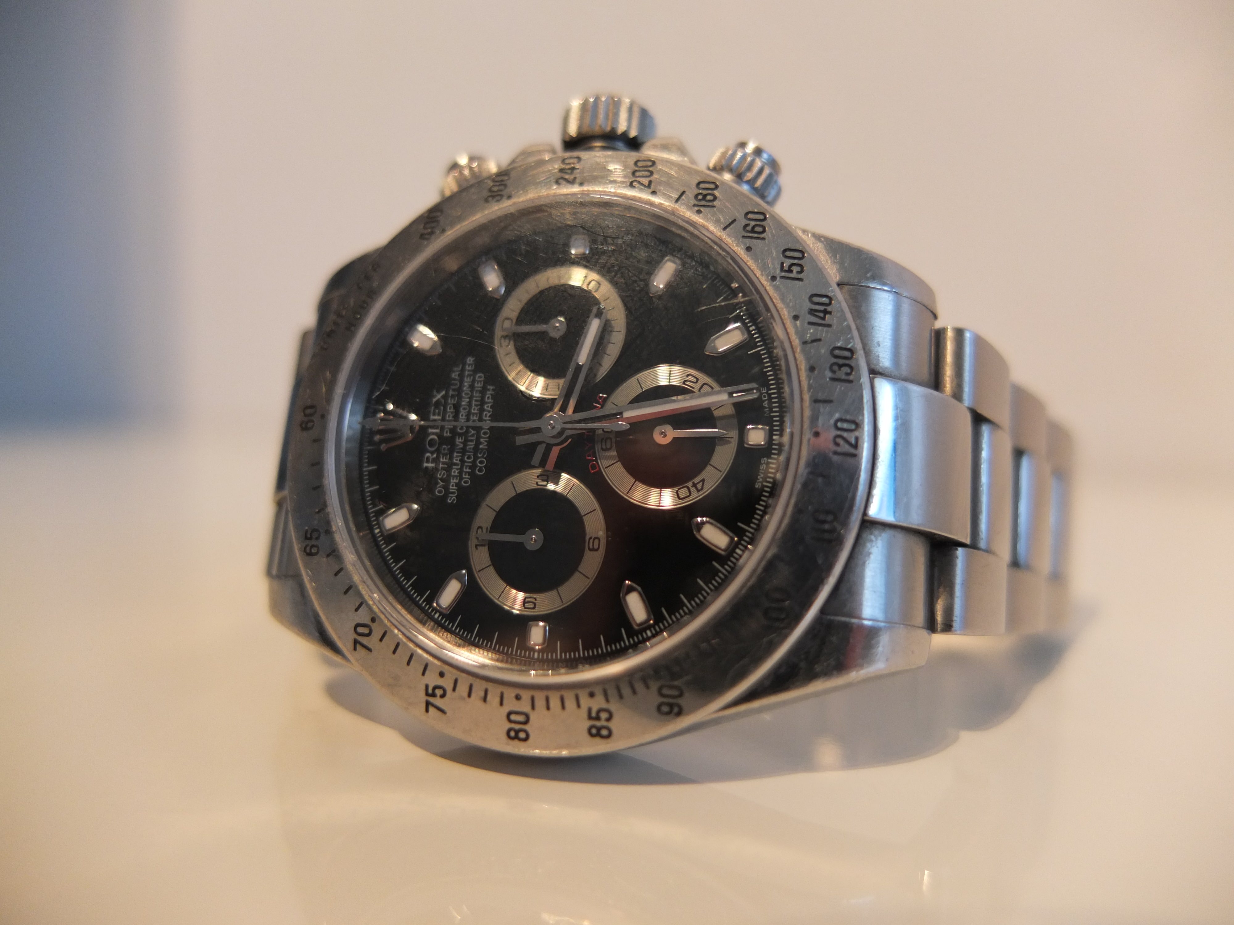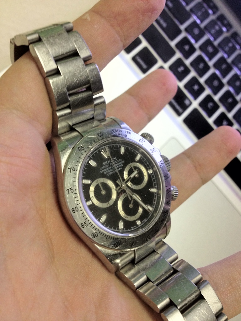 Well finally the Daytona's movement is shot, even when fully wound it just stops until you give it a hard shake (tapping isn't enough) so its going off for its first ever service at RSC, but since so many of these SS Daytonas are safe queens, or kept with their plastic on, I figured I'd take a few shots to show you guys what a Rolex Daytona looks like when its used as a true tool watch, as its intended.