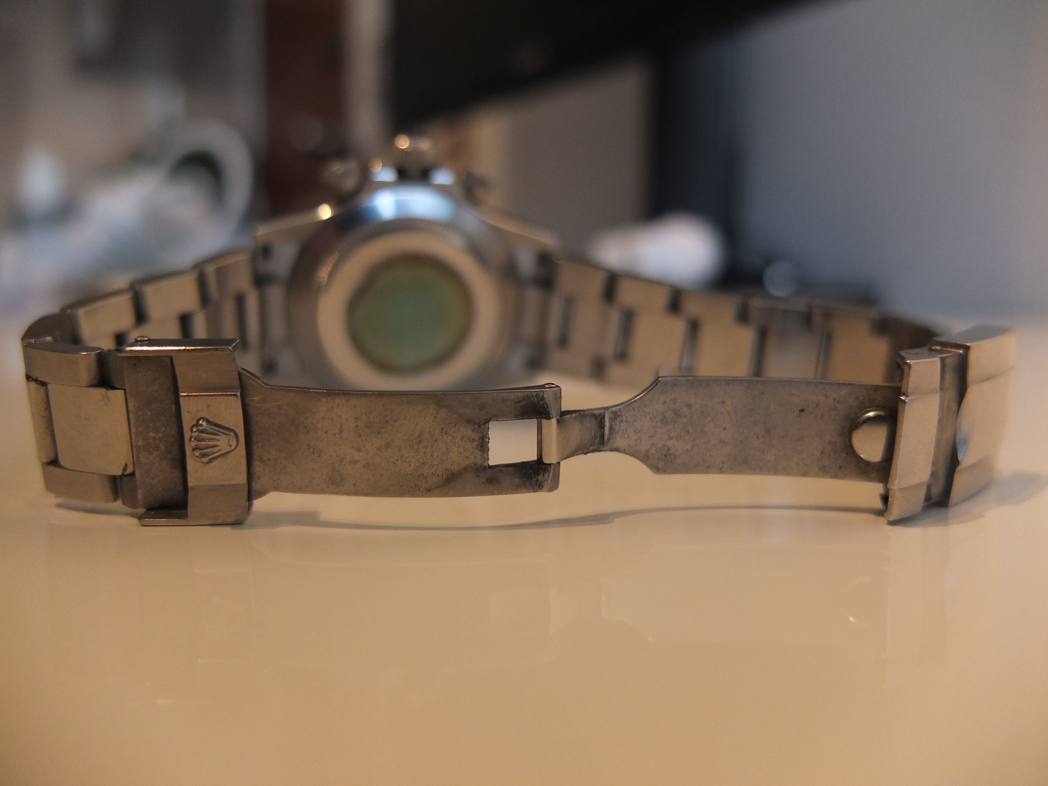In addition to the movement failing, the clasp no longer stays shut, the bracelet has severe stretch, everything is caked with scum, corrosion and cigarette ash, the crystal is chipped and scratched in multiple places, bezel dented, the polished center links (and the whole bracelet looks like its been dragged over concrete.)