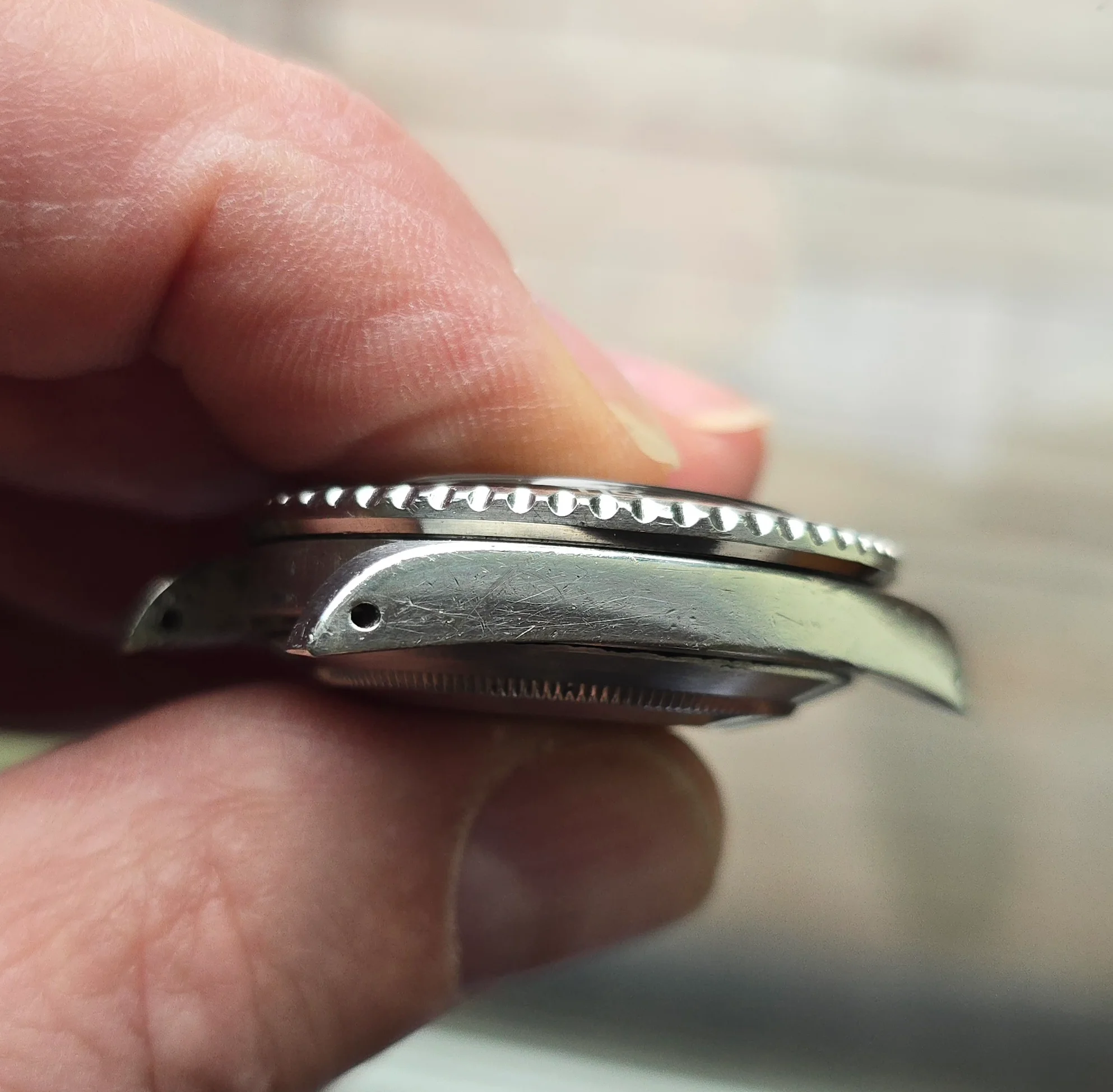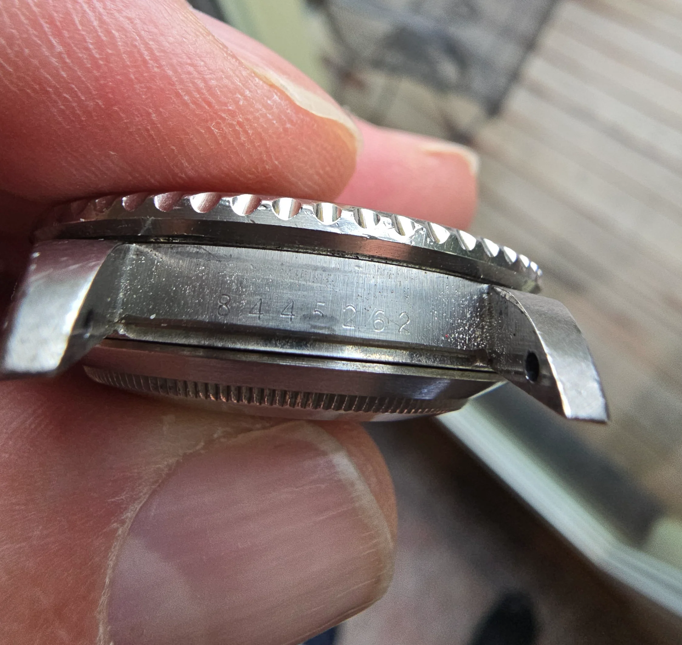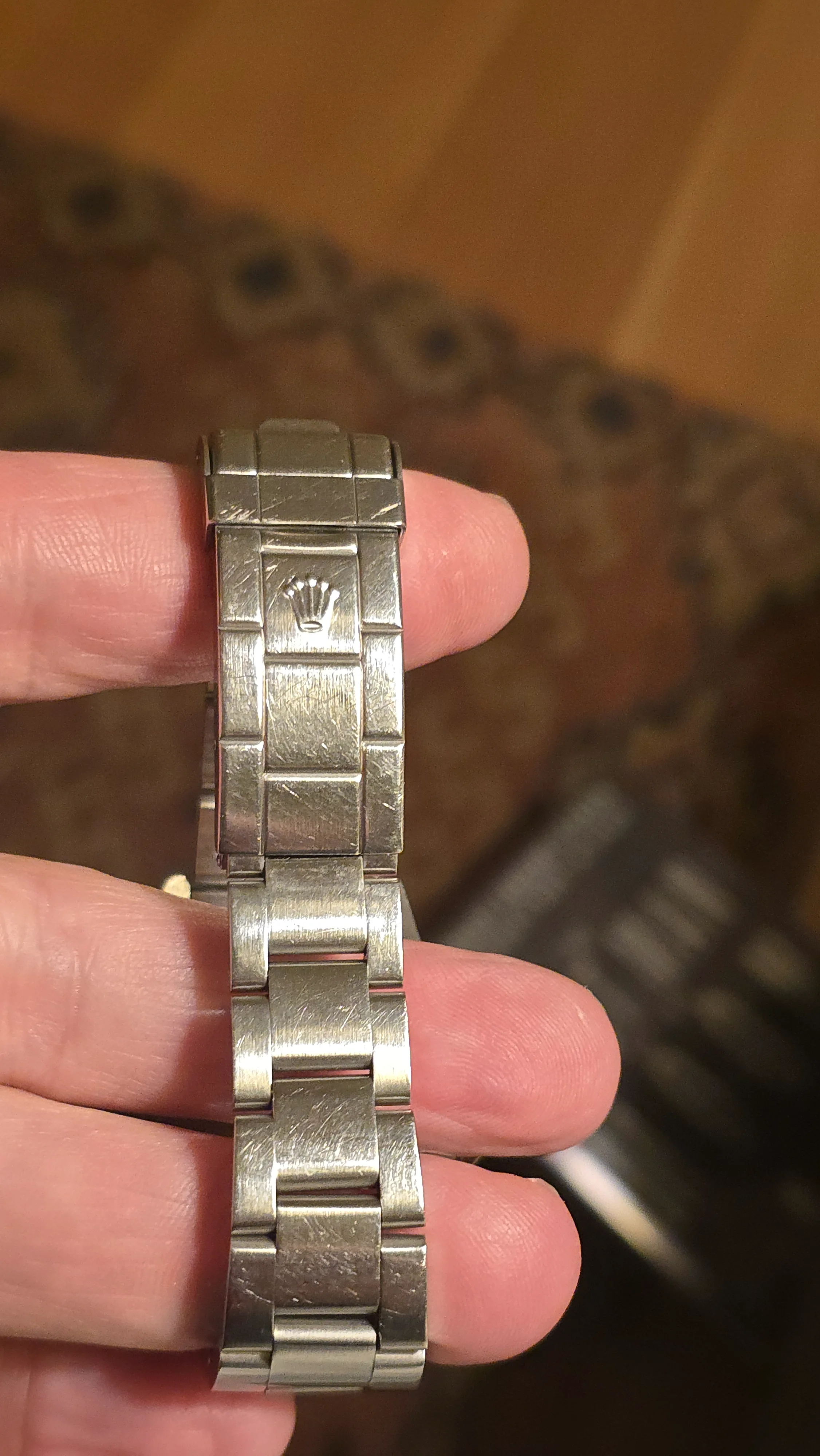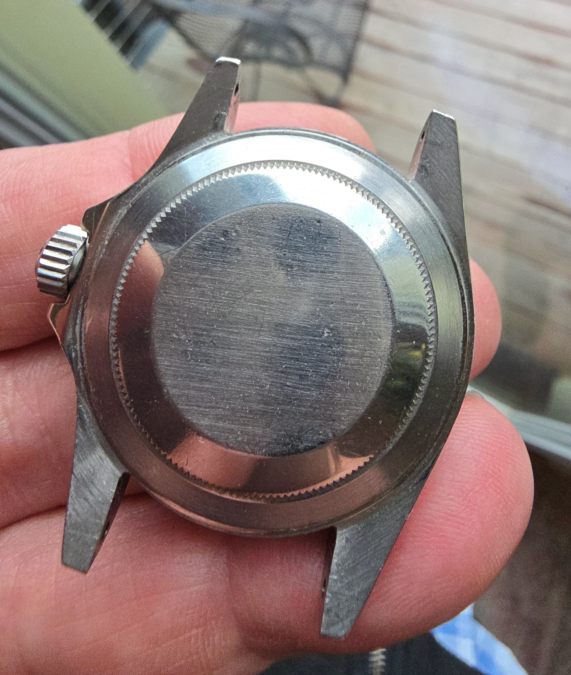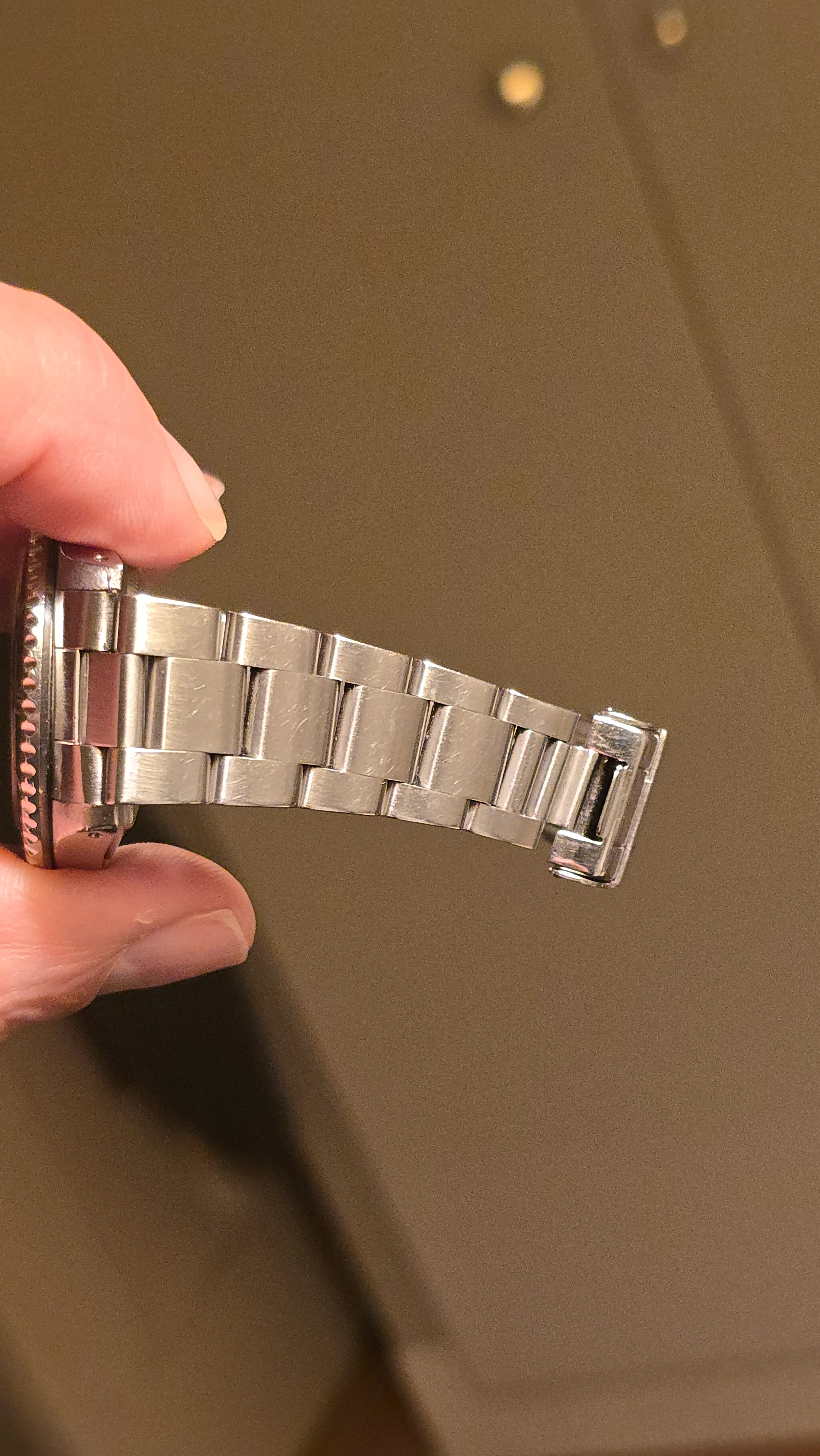 There are a lot of positives about this watch, which are clear in the photos. Here are the negatives. Note that a pin in the bracelet near the clasp is very worn. There's a photo of it. Also, the case looks worn but not polished up, which is good. But there's some pitting between the lugs. Also the rear of two lugs looks like they have polished swirls. There is also a funny brush mark on the edge of the case back in one spot (see photos). This is reflected in the price. The dealer who sold me the watch had it serviced but there is no warranty passed on. The movement photo is pre-service.