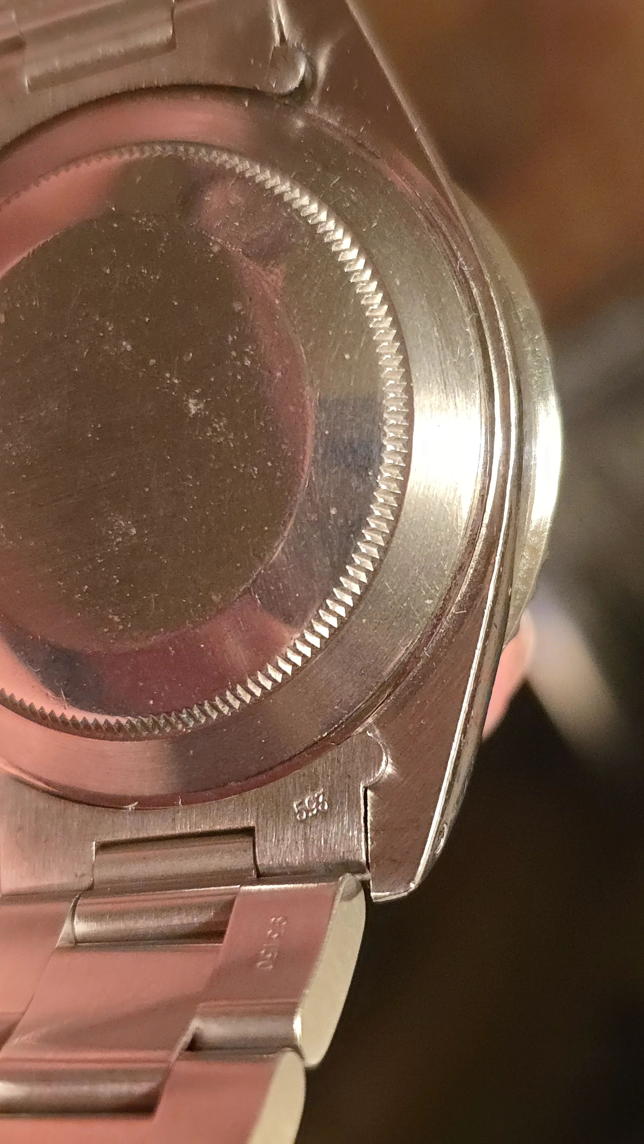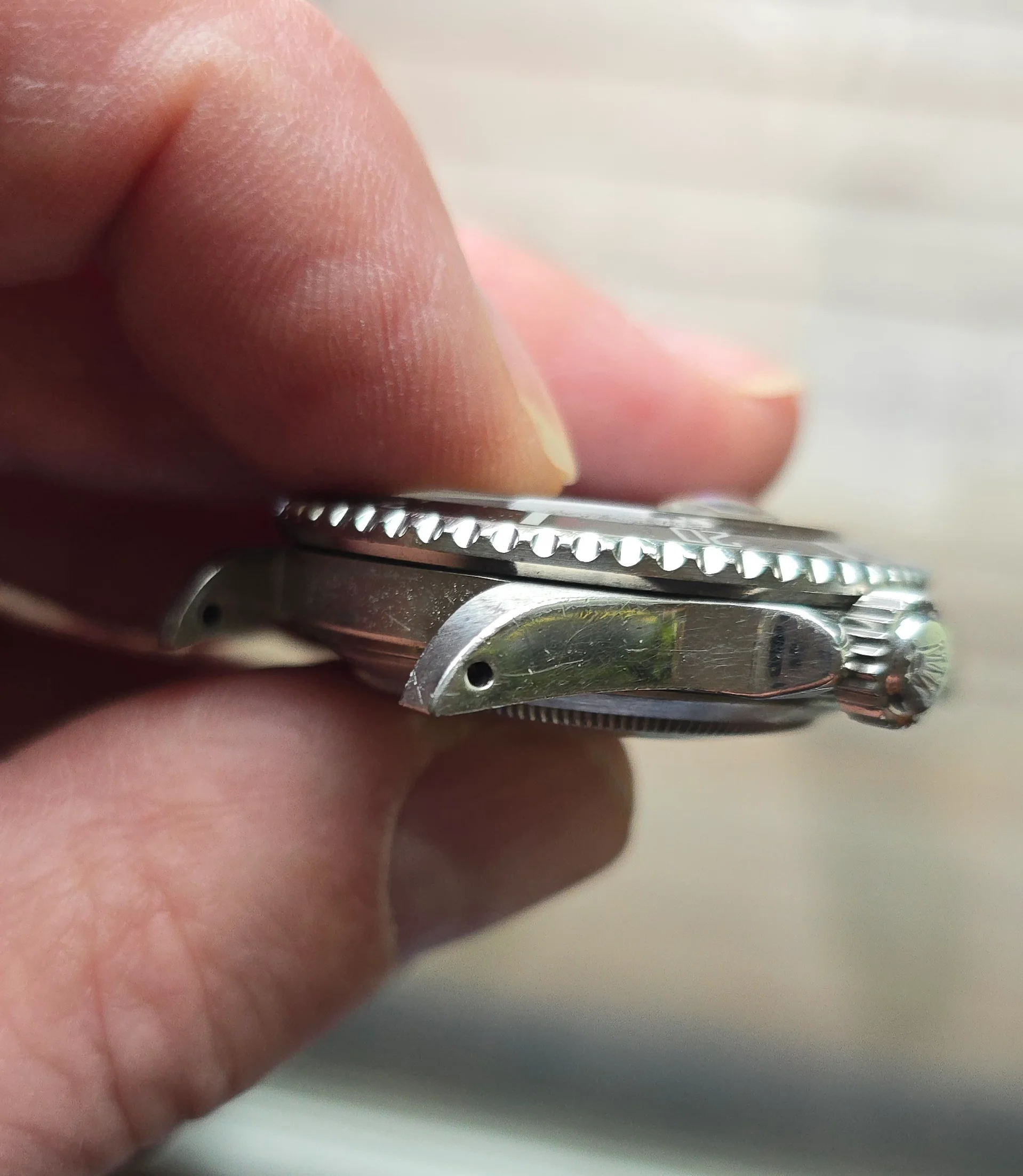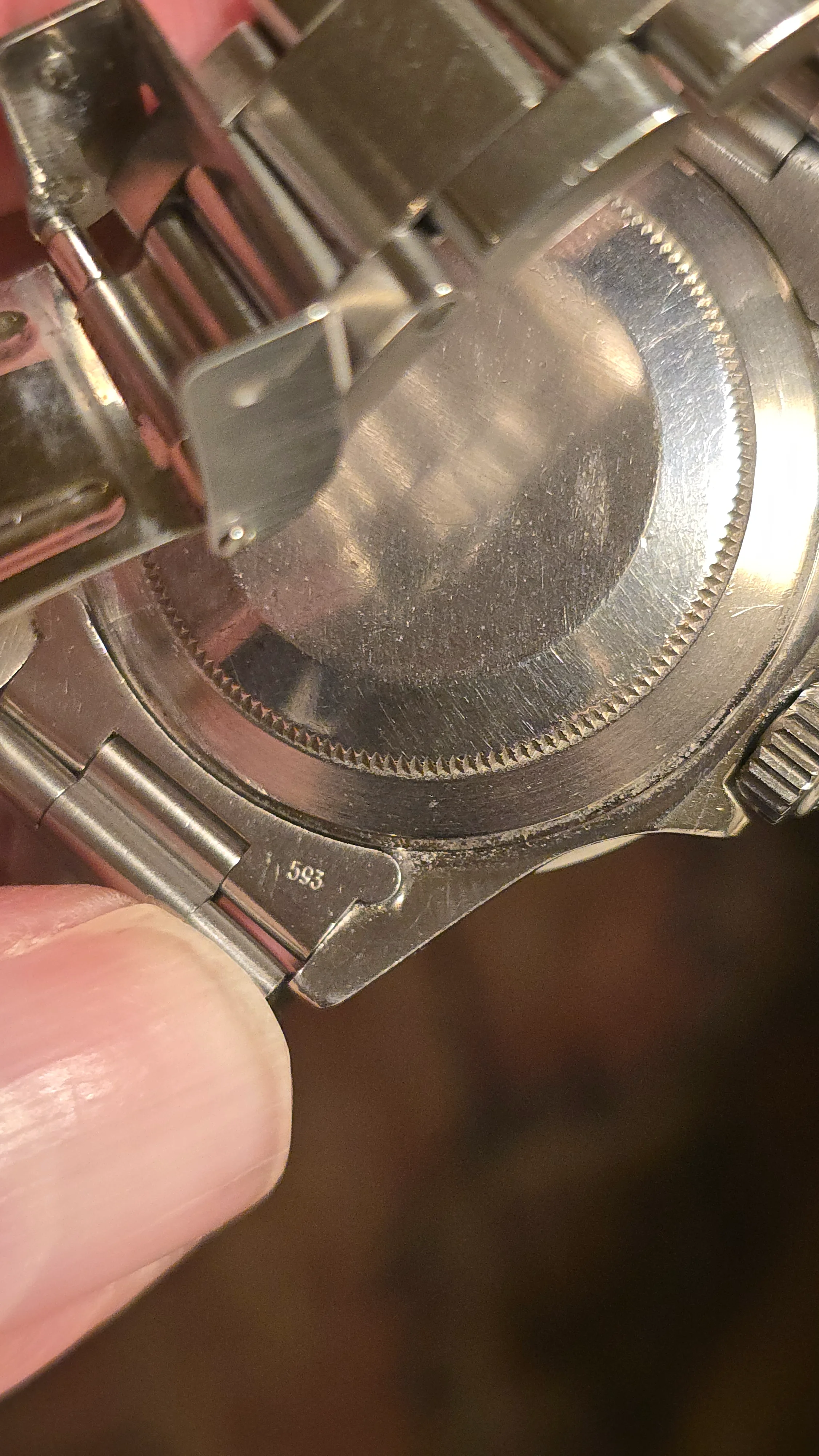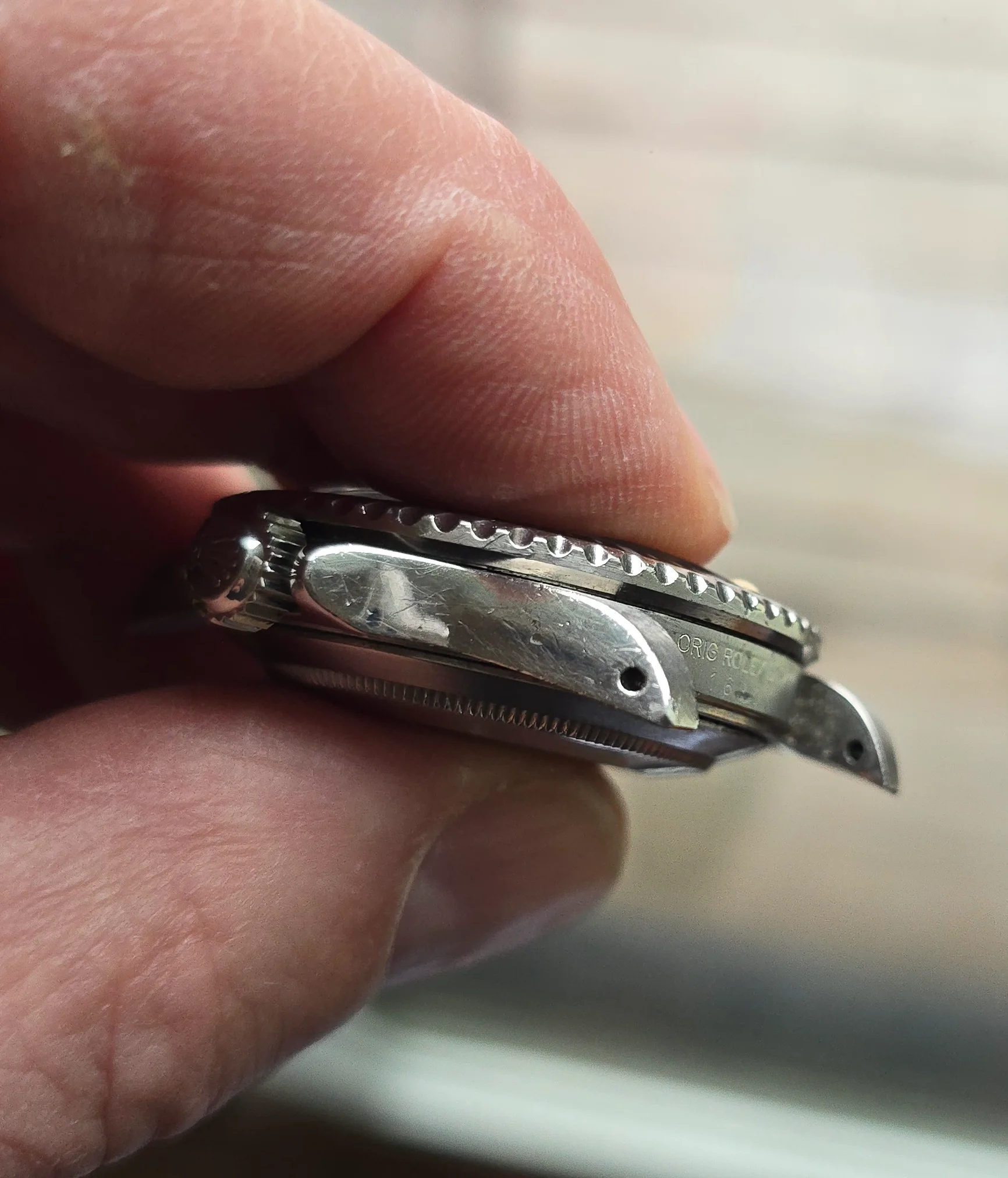 There are a lot of positives about this watch, which are clear in the photos. Here are the negatives. Note that a pin in the bracelet near the clasp is very worn. There's a photo of it. Also, the case looks worn but not polished up, which is good. But there's some pitting between the lugs. Also the rear of two lugs looks like they have polished swirls. There is also a funny brush mark on the edge of the case back in one spot (see photos). This is reflected in the price. The dealer who sold me the watch had it serviced but there is no warranty passed on. The movement photo is pre-service.