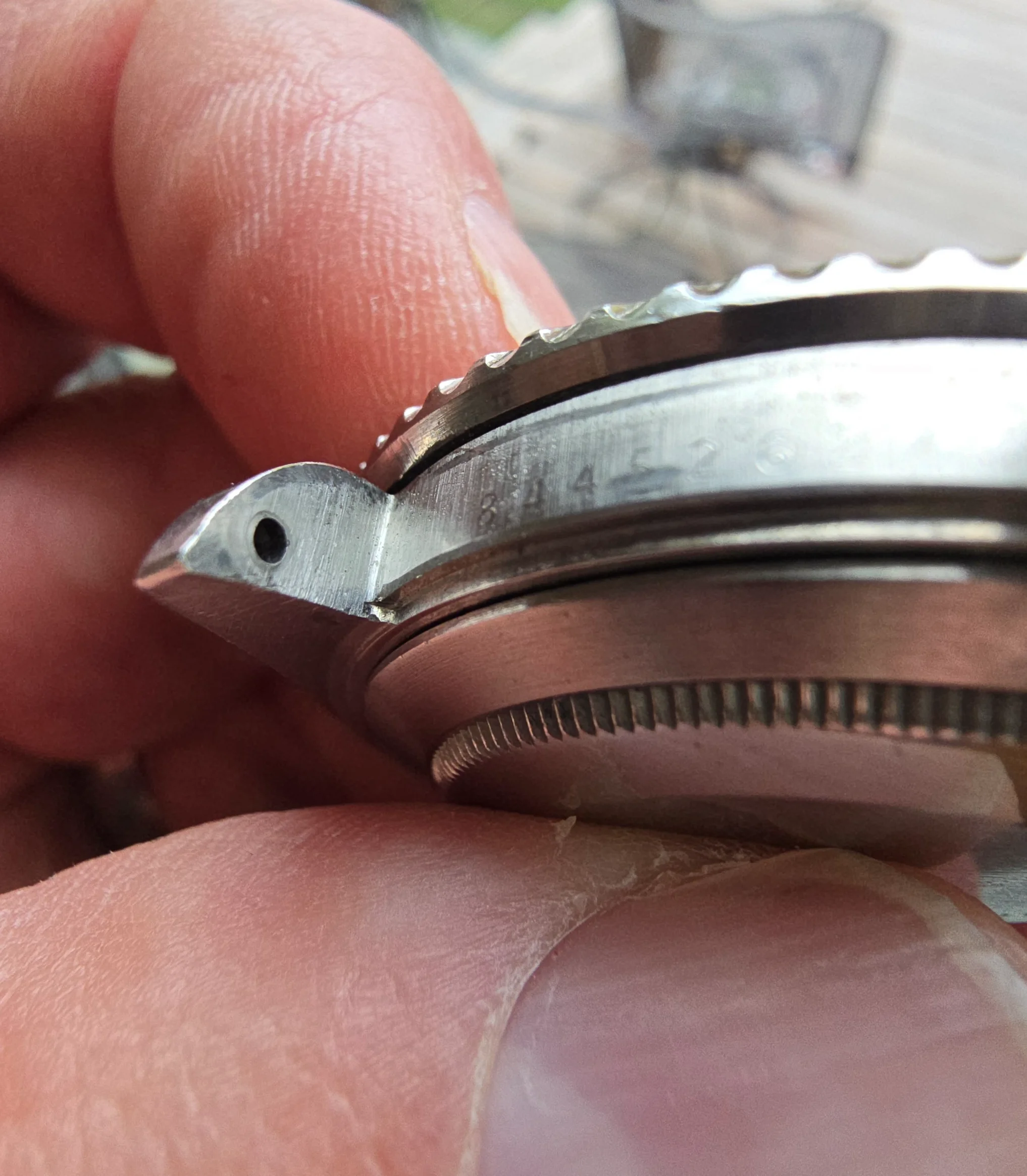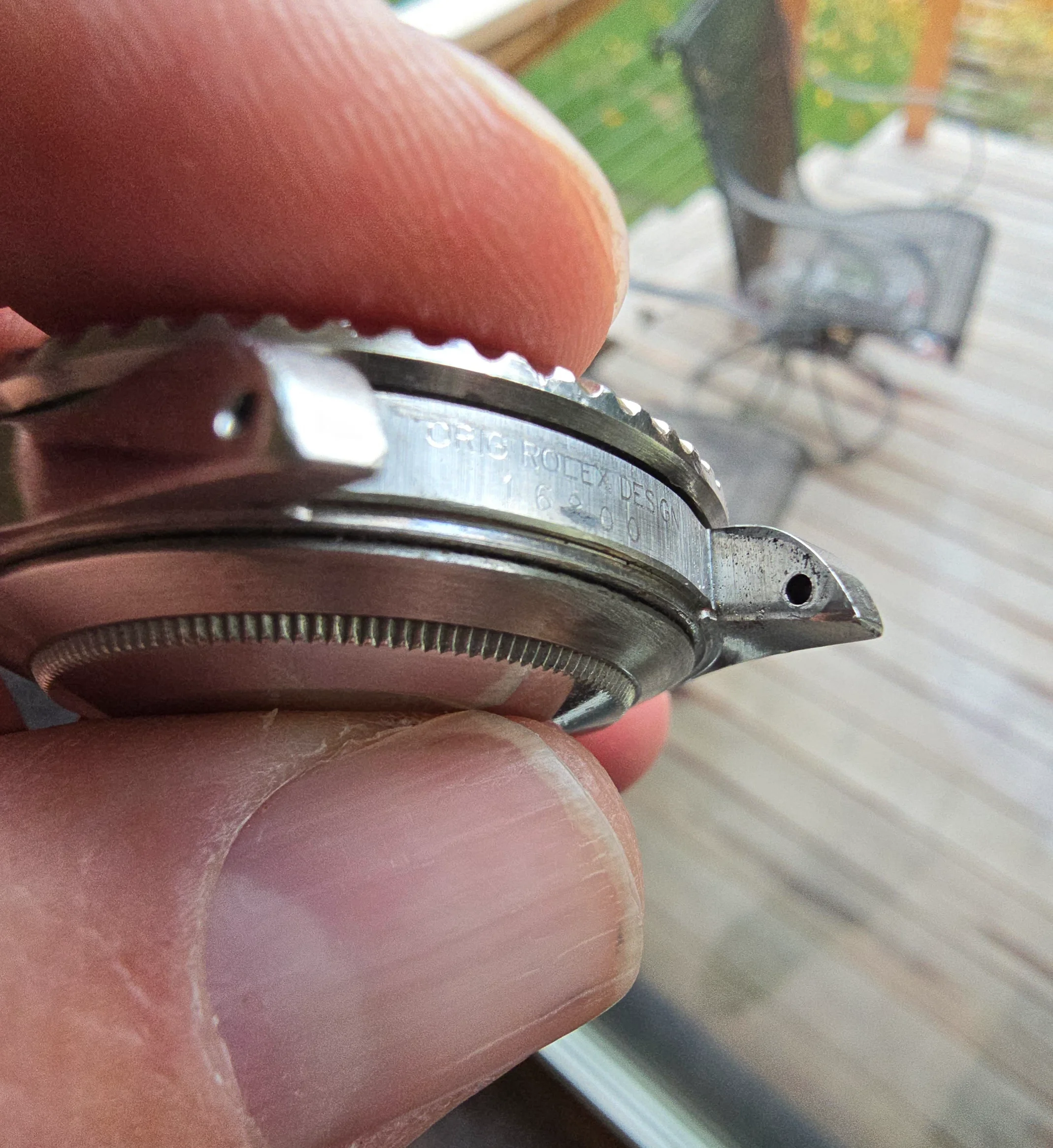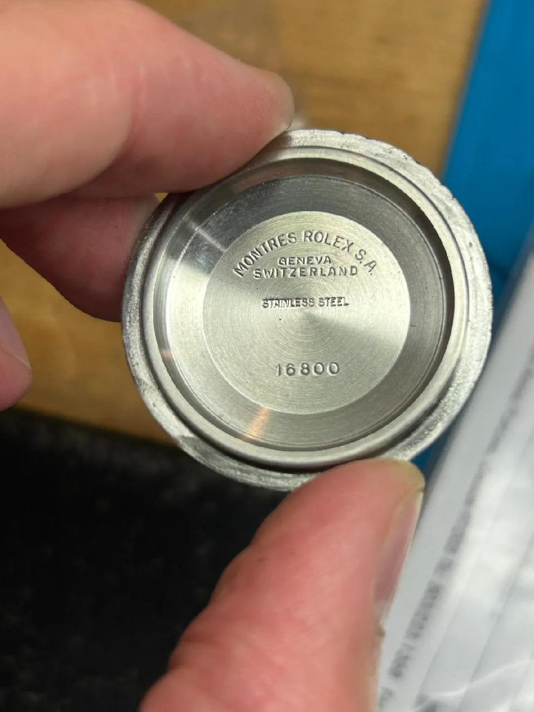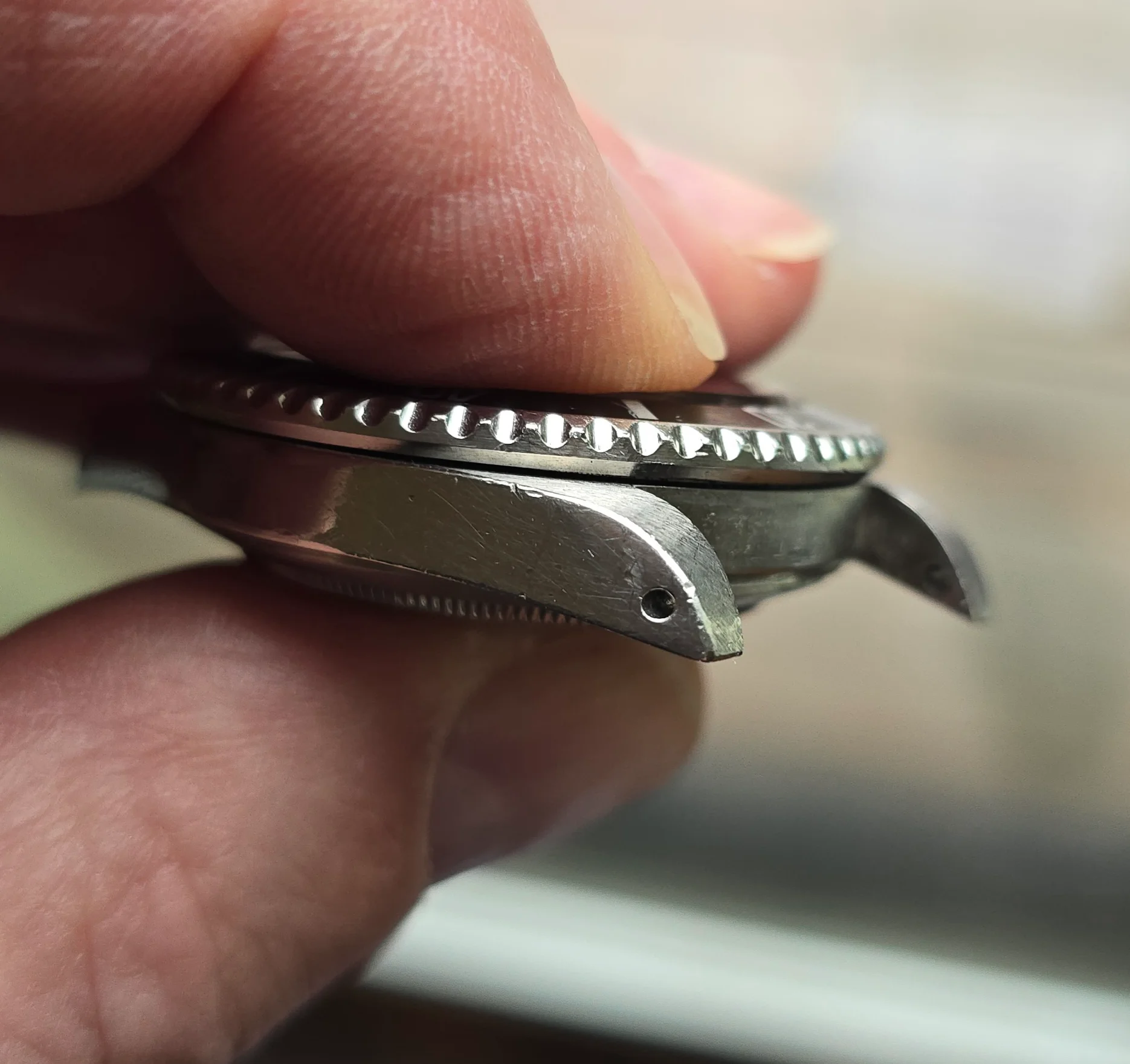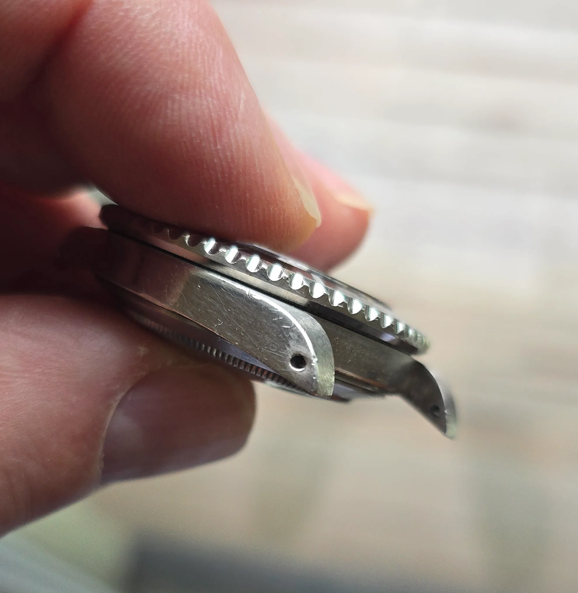 There are a lot of positives about this watch, which are clear in the photos. Here are the negatives. Note that a pin in the bracelet near the clasp is very worn. There's a photo of it. Also, the case looks worn but not polished up, which is good. But there's some pitting between the lugs. Also the rear of two lugs looks like they have polished swirls. There is also a funny brush mark on the edge of the case back in one spot (see photos). This is reflected in the price. The dealer who sold me the watch had it serviced but there is no warranty passed on. The movement photo is pre-service.