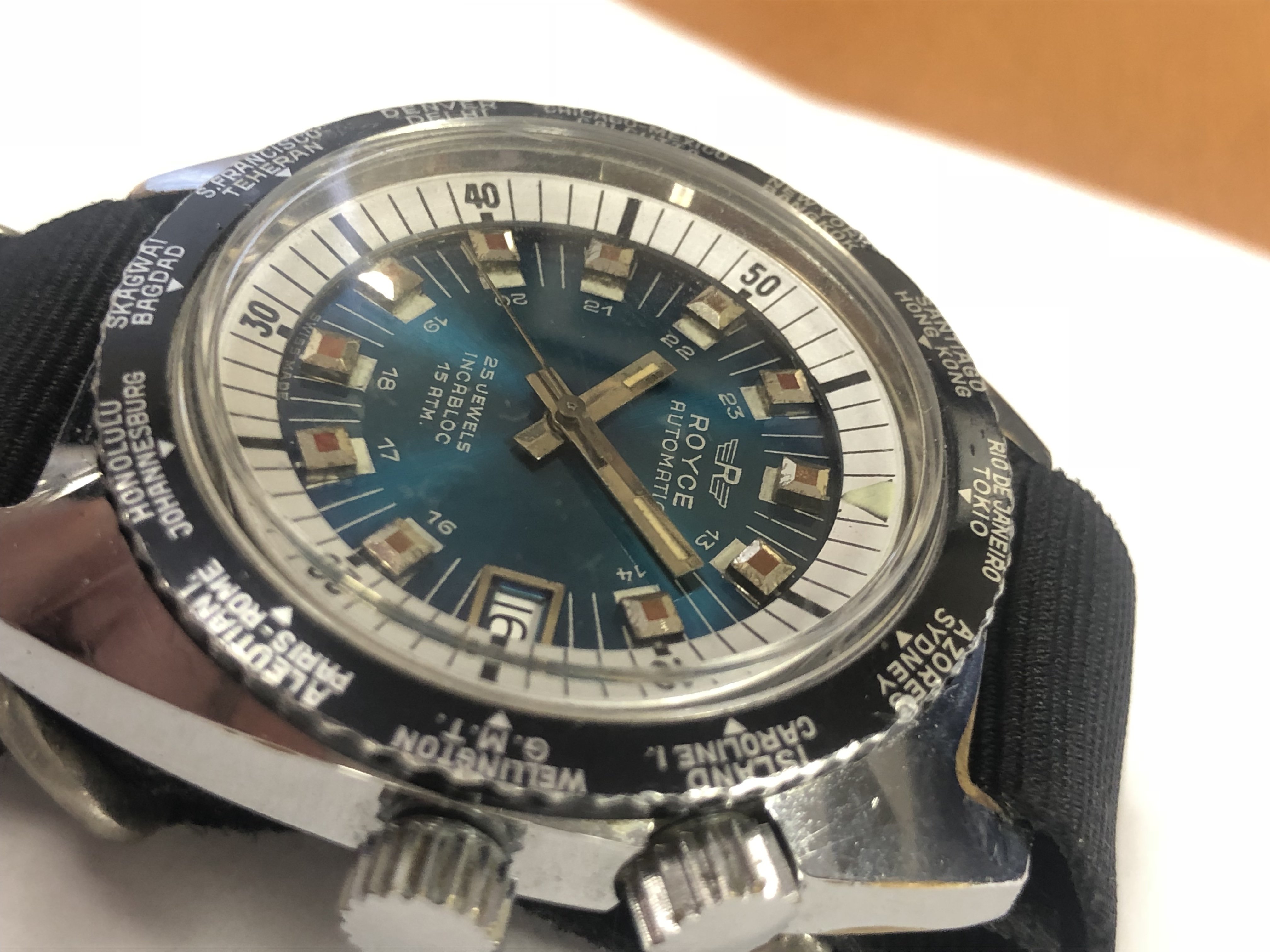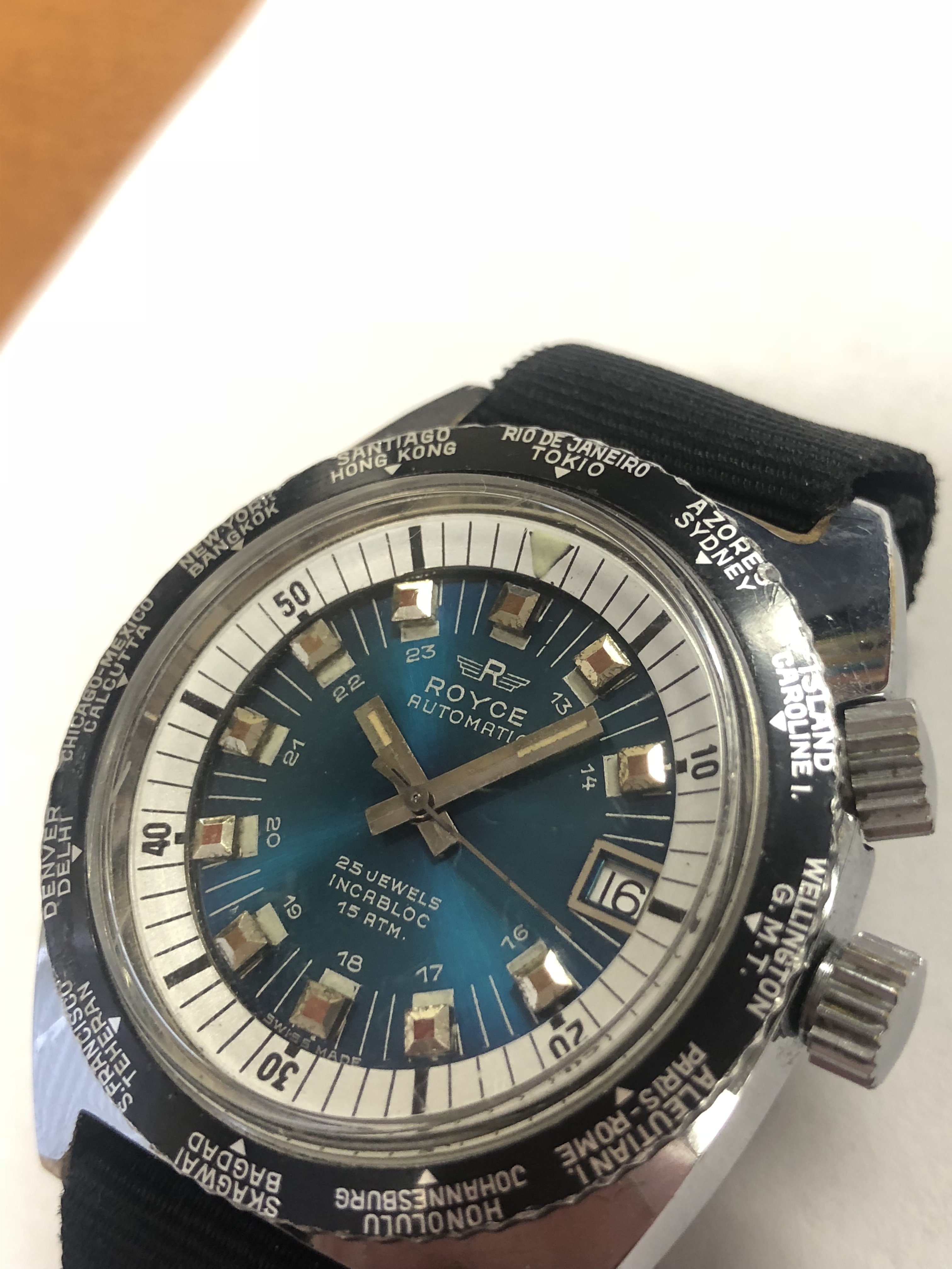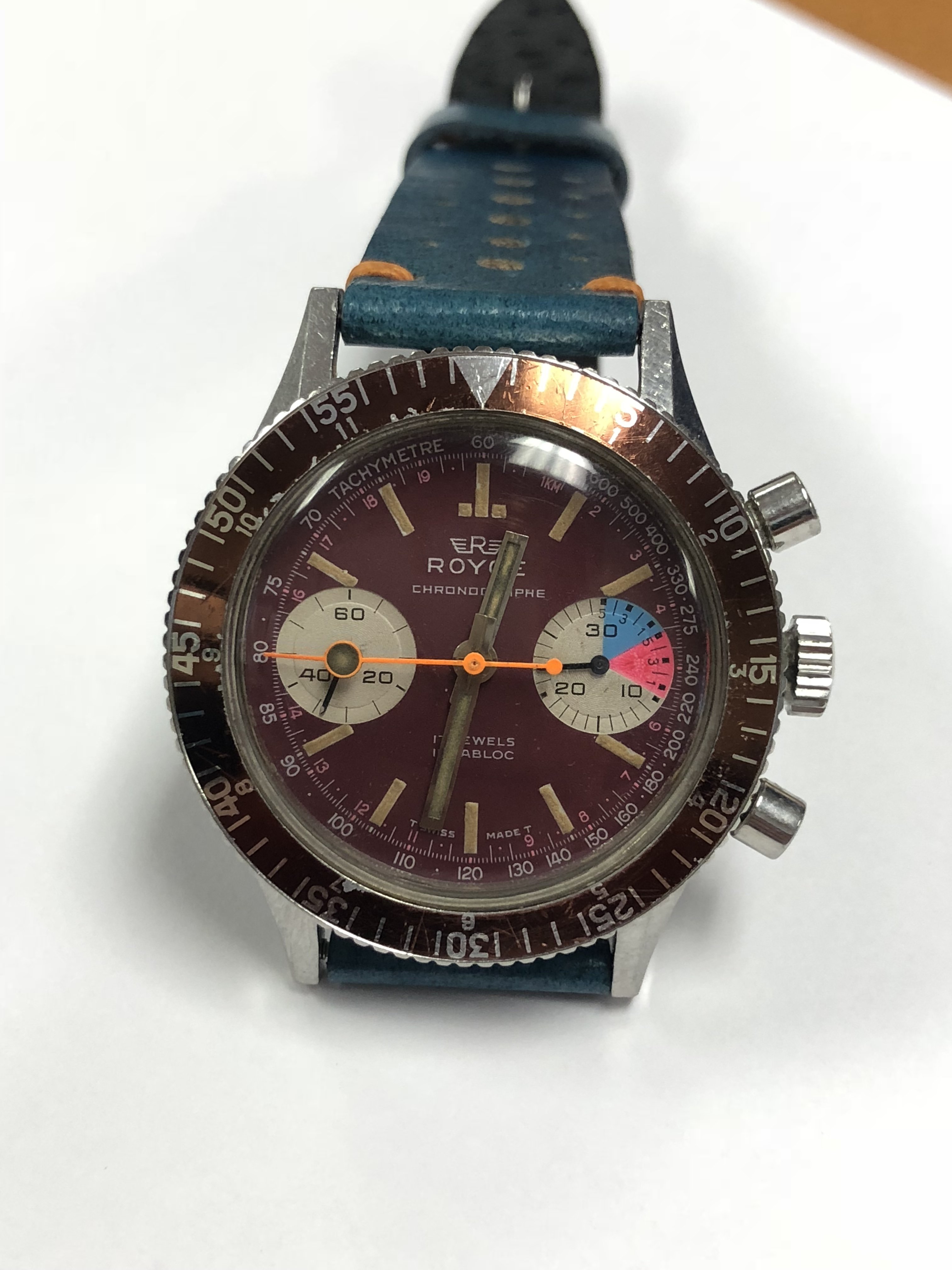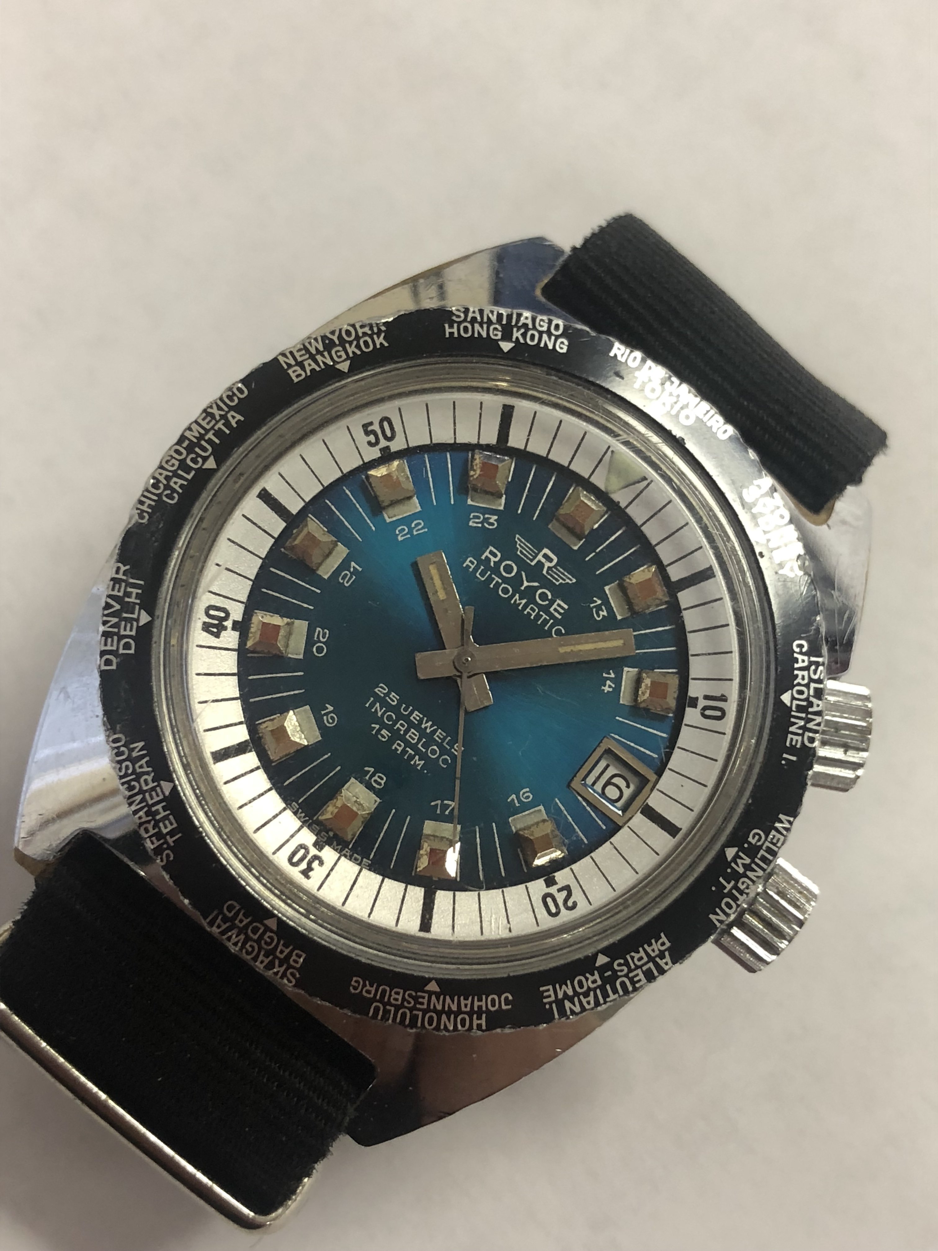 ·Just thought why not start a thread to focus on Royce and Eska watches--which has always been my focus in collecting. I often get asked why Royce, or why Eska--to this I have no answer other than why not. Eska was founded in 1922 by Sylvan Kocher in Grenchen--Eska stands for the phonetic pronunciation of his initials "S.K." (pretty witty eh?) Generally Eska/Royce watches can be snagged at affordable prices, and the brand has quote the portfolio.. stretching from insane Eska cloisonne dialed watches, Eska Split-second chronograph, Eska Jump Hour, etc. Royce dialed watches are also the brainchild of Walter Kocher, and was used to sell primarily, or at first anyways in the US market through New York--aka the export brand. Royce watches are all over the place in design/movement/tool watch etc. They have some awesome chronographs and a couple real special diver's. One sought after watch that some may actually recognize is the Eska "Amphibian 600," from the 1960's as Roy Rogers was known and photographed wearing one; it sports a Huge and unusual acrylic bezel, automatic watch. The most likely well known Royce watch is the Automatic Professional Marine, monster of a watch with the crown being up @ 12:00 and recessed- with a screw back case and hooded flexible lugs! These watches were mainly used by French NAVY oddly enough, and were made for professional divers--they are HUGE,coming in 46 across × 62.5 mm lug to lug. Since i have covered probably the two most notable Eska and Royce watches, let me reiterate that there are hundreds of other just as cool and often affordable models out there! I have been collecting both brands for 4-5 years and have seen quite a variation of lovely vintage looking watches. The Royce brand name/logo is currently officially owned by Tutima Glashütte/SA. I will share some of my collection going forward in the days and weeks to come, anyone else out there fancy Royce or Eska? Maybe i am not the only one.
