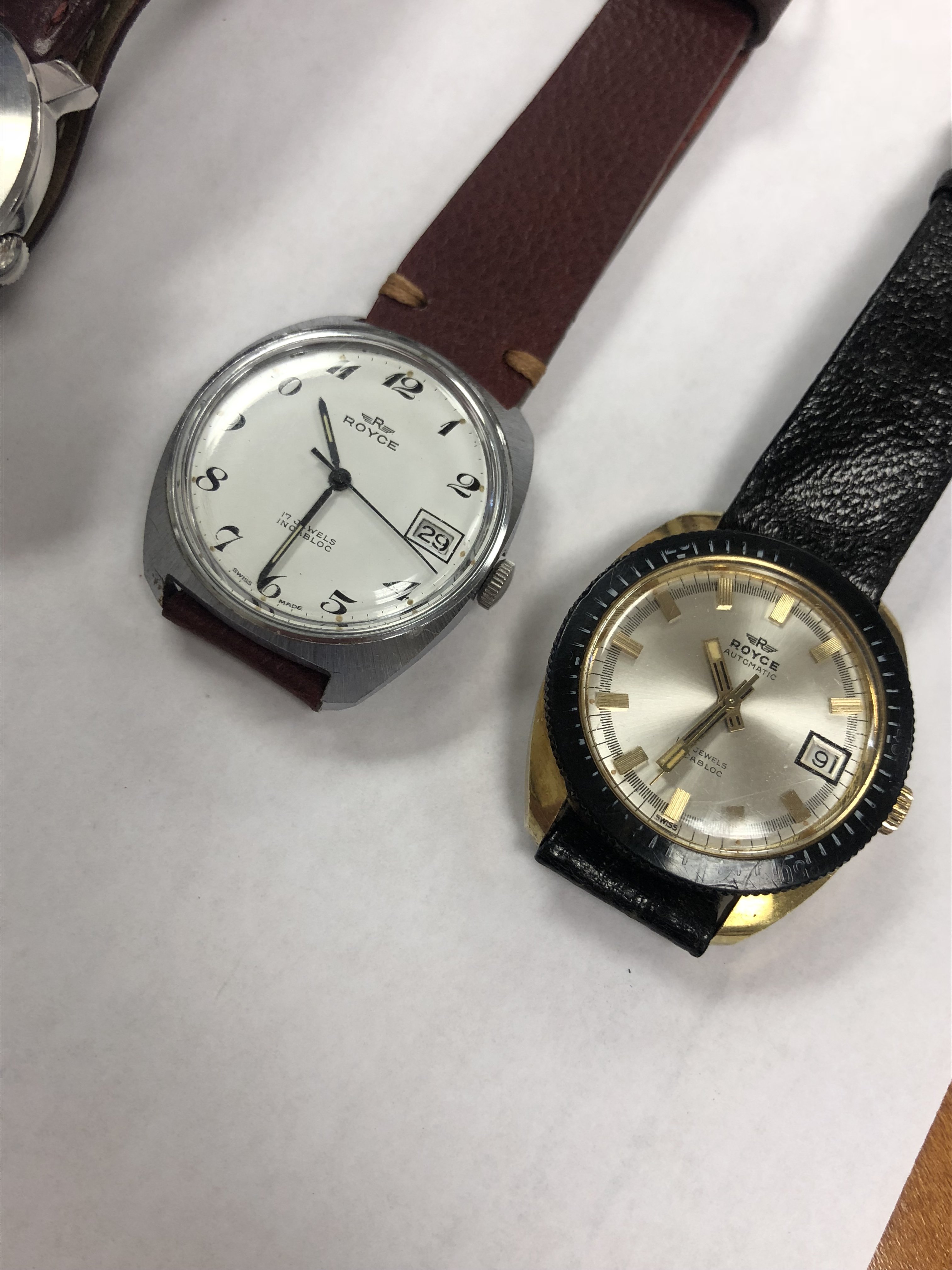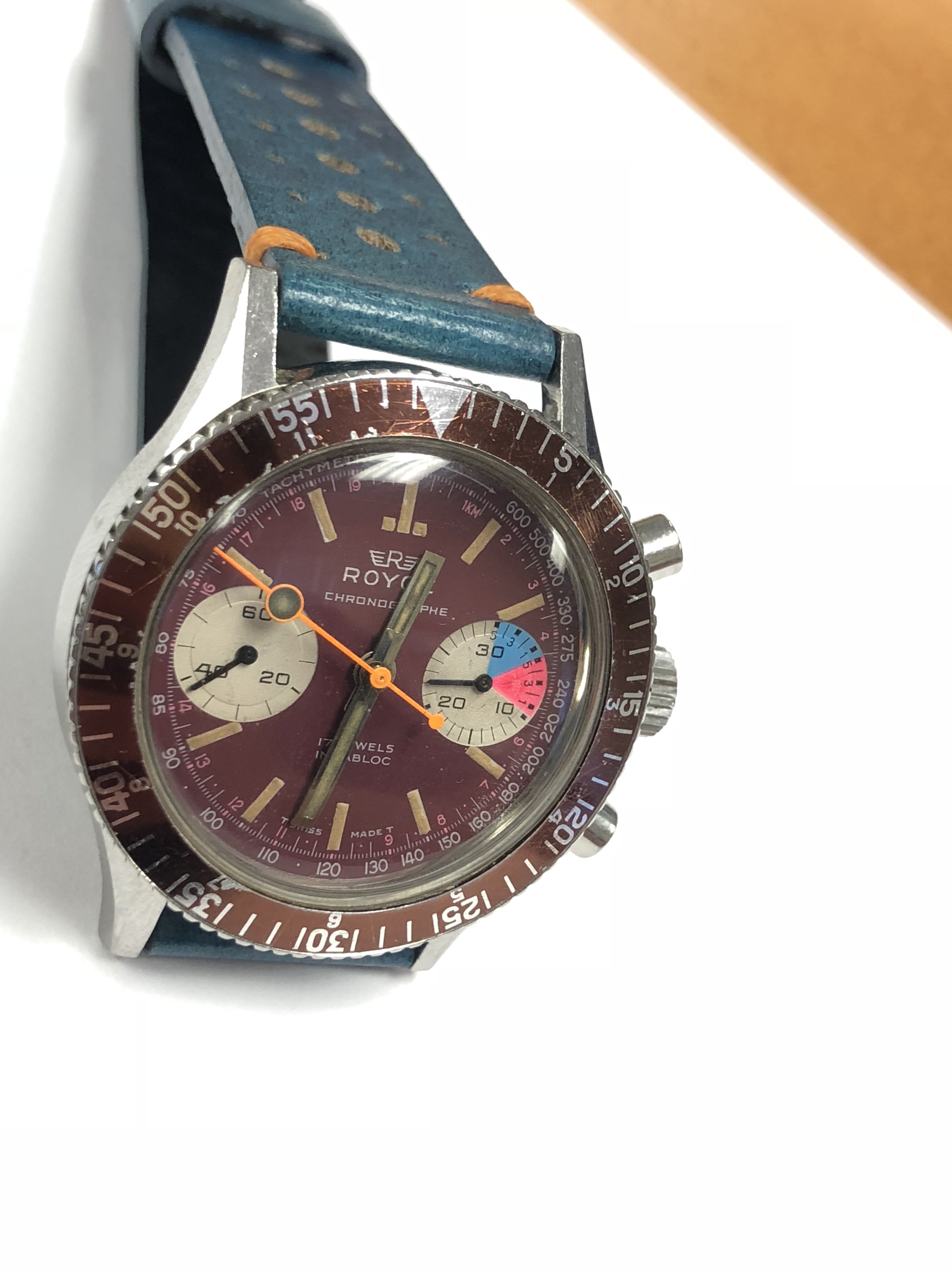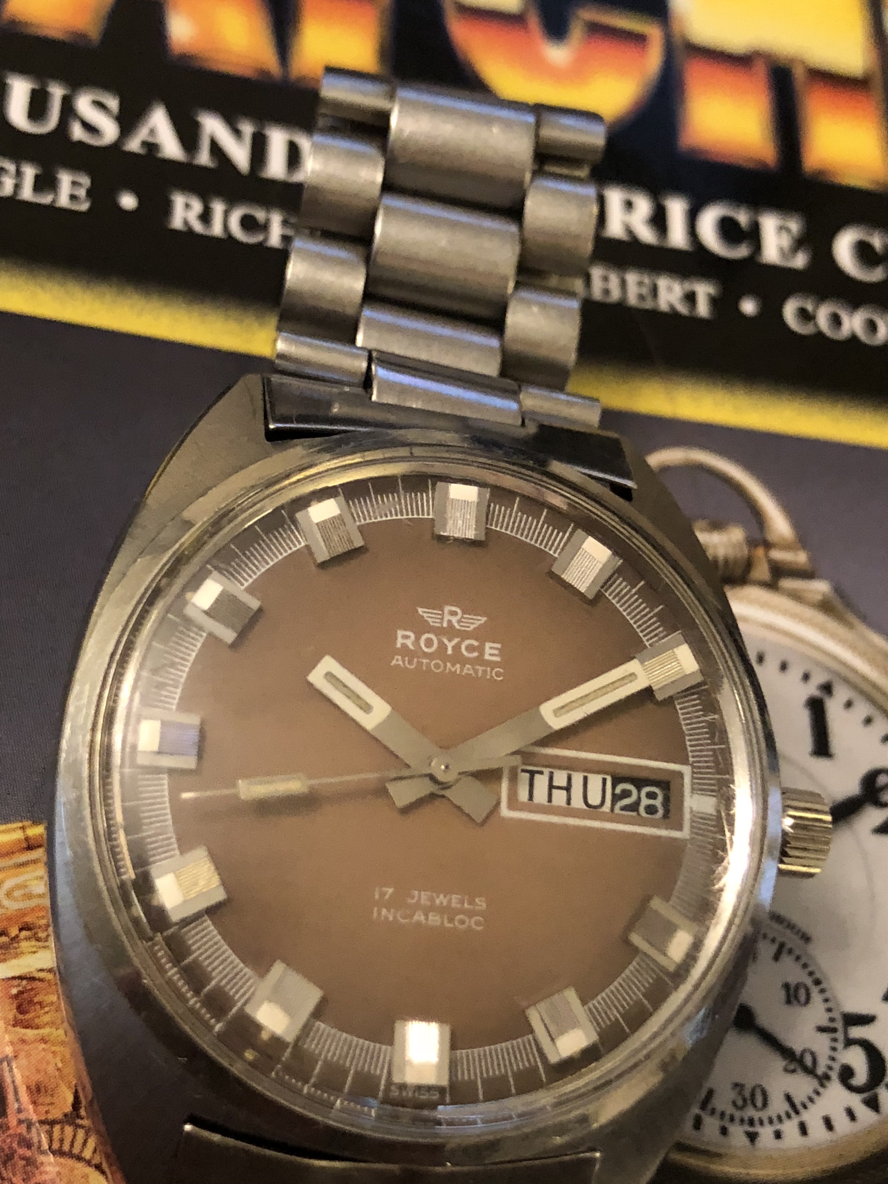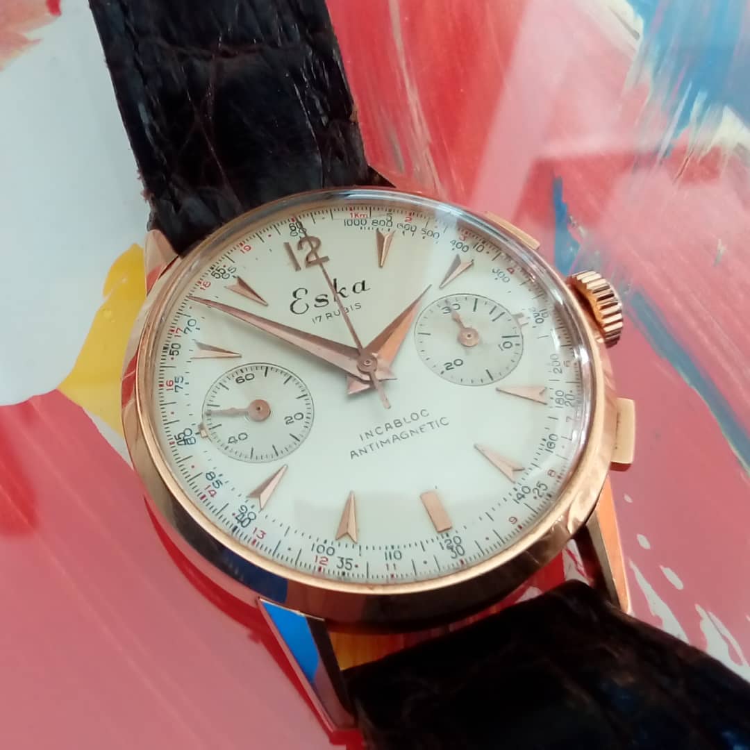 ·Just thought why not start a thread to focus on Royce and Eska watches--which has always been my focus in collecting. I often get asked why Royce, or why Eska--to this I have no answer other than why not. Eska was founded in 1922 by Sylvan Kocher in Grenchen--Eska stands for the phonetic pronunciation of his initials "S.K." (pretty witty eh?) Generally Eska/Royce watches can be snagged at affordable prices, and the brand has quote the portfolio.. stretching from insane Eska cloisonne dialed watches, Eska Split-second chronograph, Eska Jump Hour, etc. Royce dialed watches are also the brainchild of Walter Kocher, and was used to sell primarily, or at first anyways in the US market through New York--aka the export brand. Royce watches are all over the place in design/movement/tool watch etc. They have some awesome chronographs and a couple real special diver's. One sought after watch that some may actually recognize is the Eska "Amphibian 600," from the 1960's as Roy Rogers was known and photographed wearing one; it sports a Huge and unusual acrylic bezel, automatic watch. The most likely well known Royce watch is the Automatic Professional Marine, monster of a watch with the crown being up @ 12:00 and recessed- with a screw back case and hooded flexible lugs! These watches were mainly used by French NAVY oddly enough, and were made for professional divers--they are HUGE,coming in 46 across × 62.5 mm lug to lug. Since i have covered probably the two most notable Eska and Royce watches, let me reiterate that there are hundreds of other just as cool and often affordable models out there! I have been collecting both brands for 4-5 years and have seen quite a variation of lovely vintage looking watches. The Royce brand name/logo is currently officially owned by Tutima Glashütte/SA. I will share some of my collection going forward in the days and weeks to come, anyone else out there fancy Royce or Eska? Maybe i am not the only one.