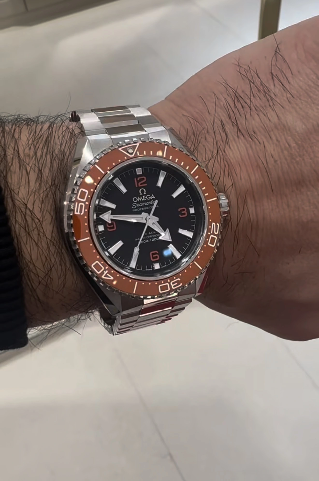 Orange bezel was underwhelming. First and second gen orange were striking while this one seems like a real orange that's starting to rot with a black hue. The shape at the lugs is completely new or something we haven't seen on Omega. No gloss on the dial. No date . No HEV. But a brilliant looking bracelet and clasp. Bracelet is flat link type with polished Center links. Felt comfortable. Didn't try the black but it looks way better than the orange bezel overall. Glossy bezel and all I think.