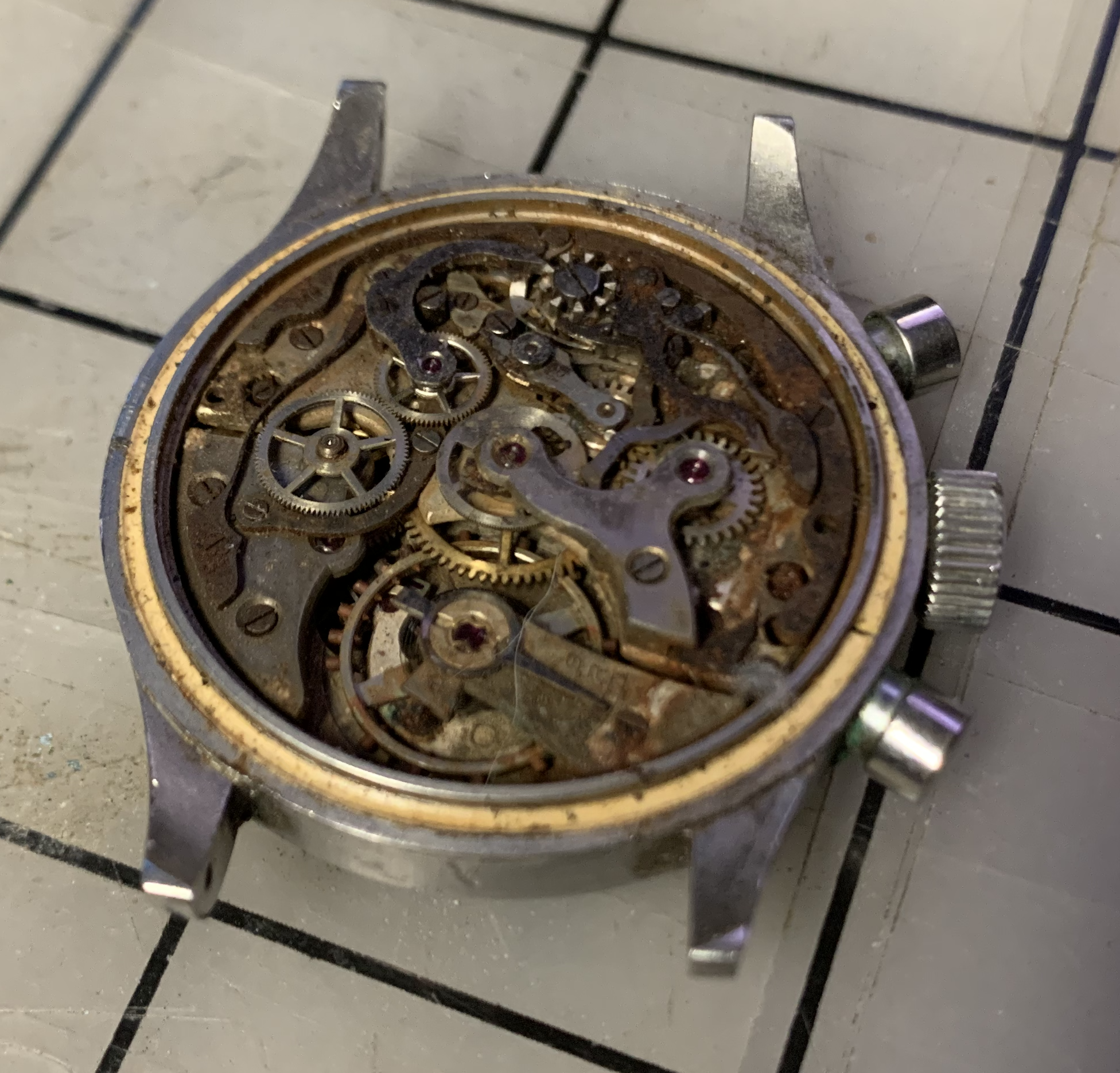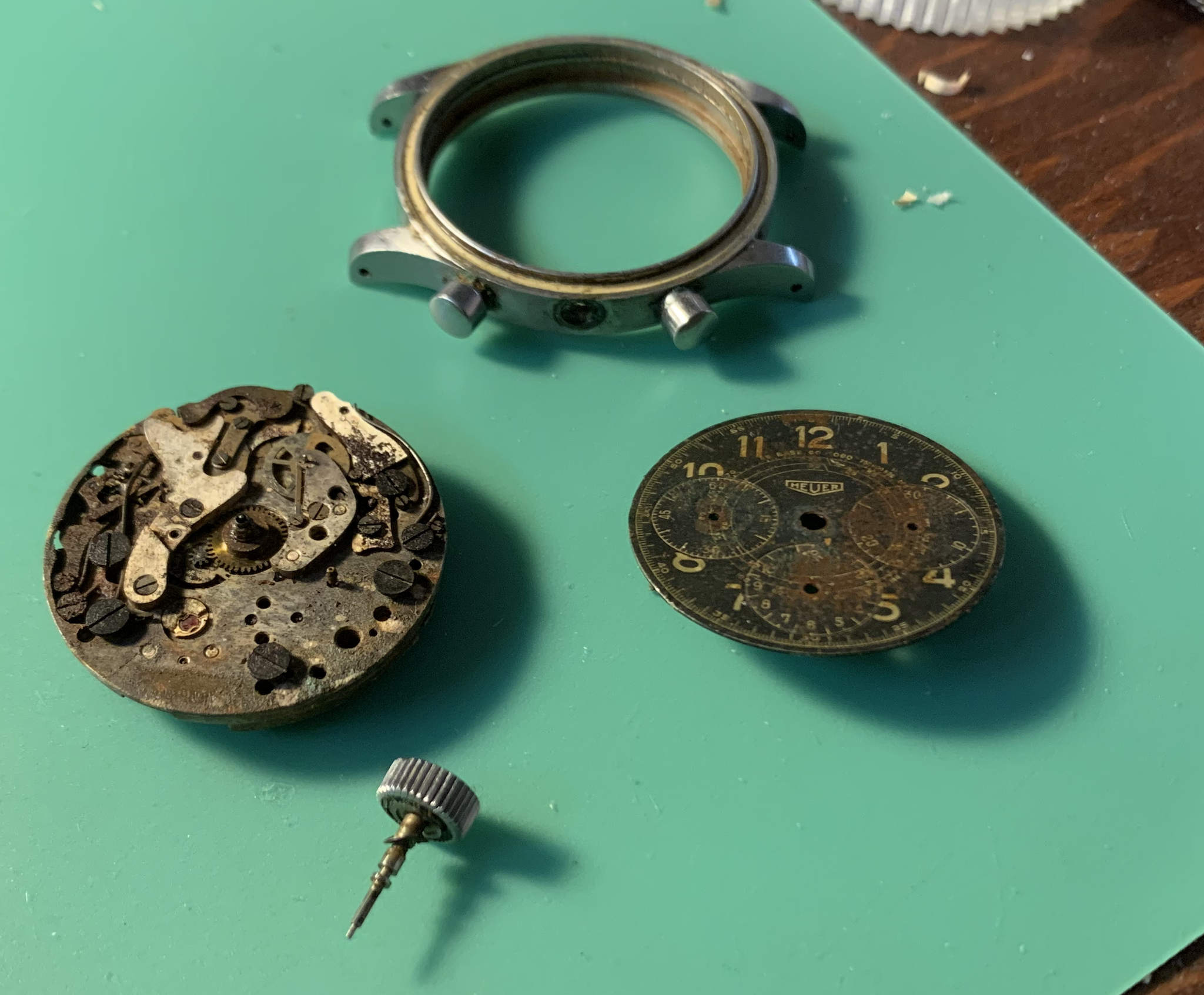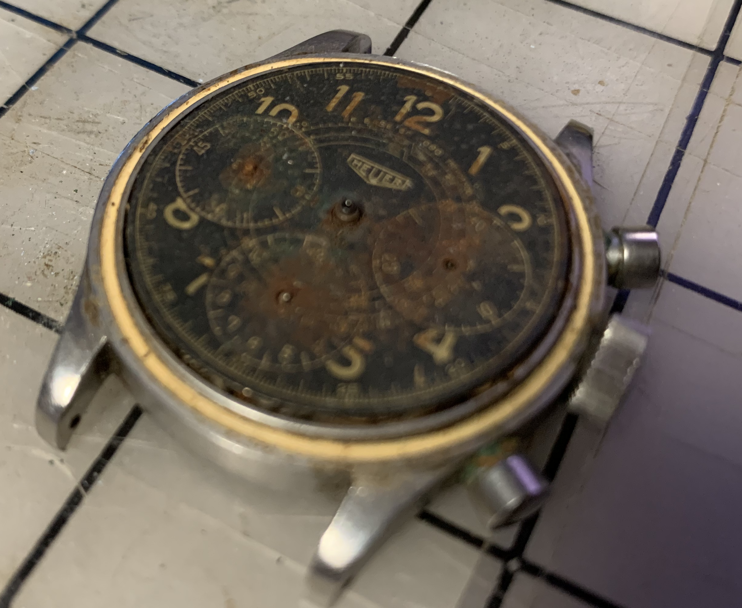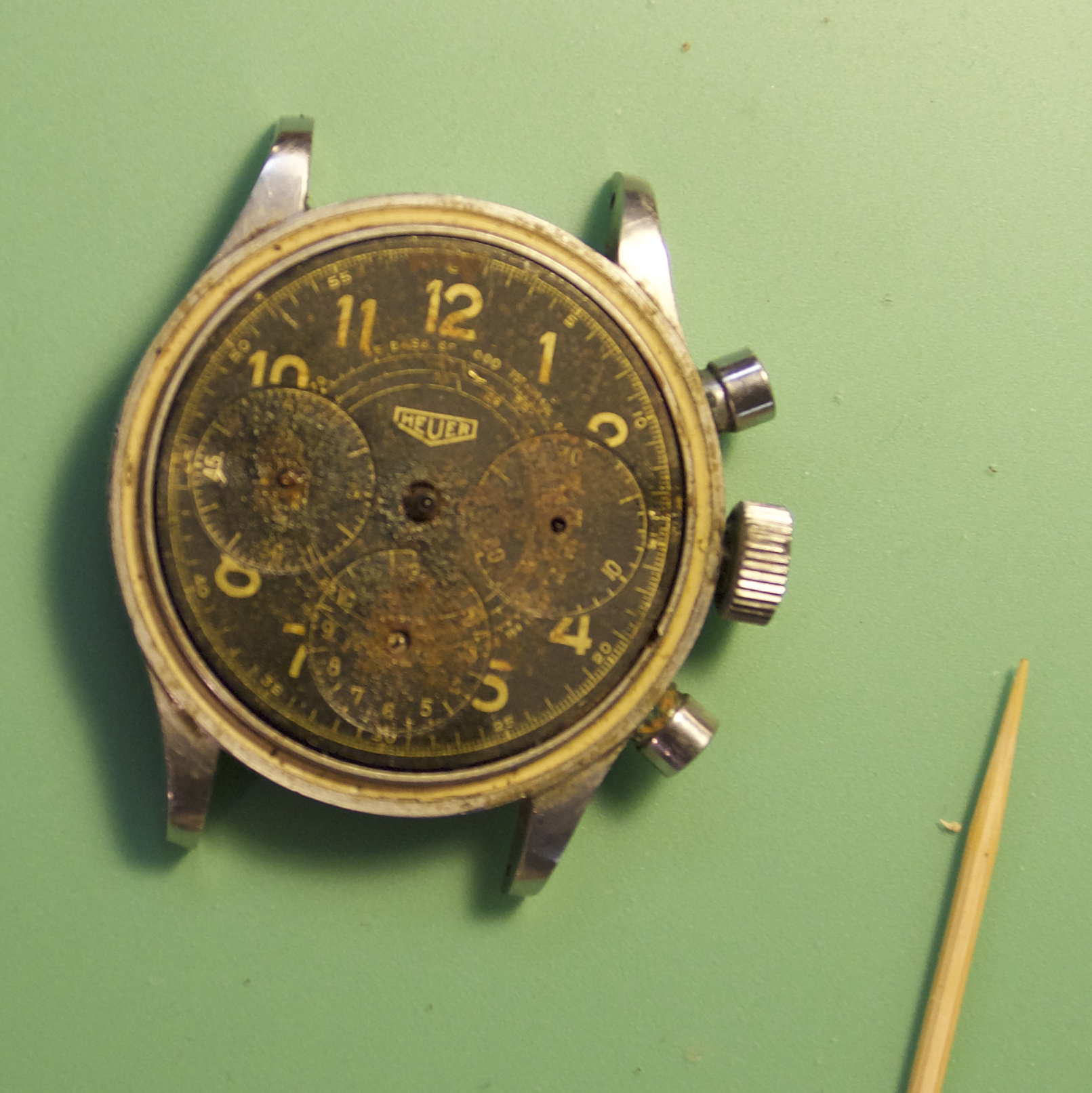 ·This was another priority watch. A HeUer before they merged with Tag. Not sure if there is a way to clean the rust off the dial. I am told tea works (tannic acid.) The trick would be not to remove any of the other markings. I am open to suggestions.