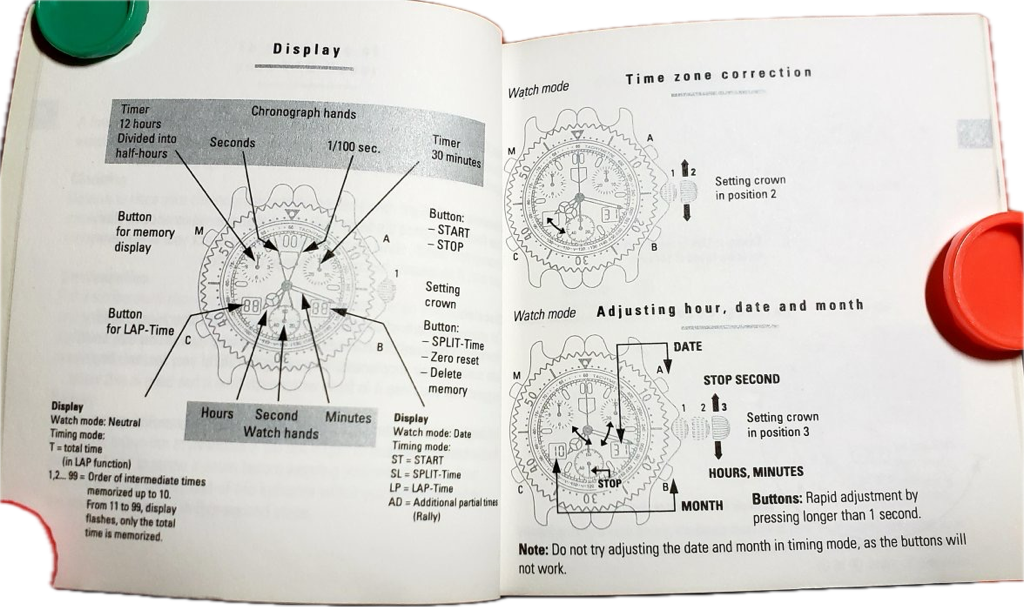 I have two. My Japanese version says 1/100sec SPORTS CHRONOGRAPHS, my other one (English, French, German, Italian, Spanish etc.) says CHRONOGRAPH 1/100TH SECOND (CAL. 251.251). Which is a little puzzling since the movement inside says ETA 251.252 (not 251.251).