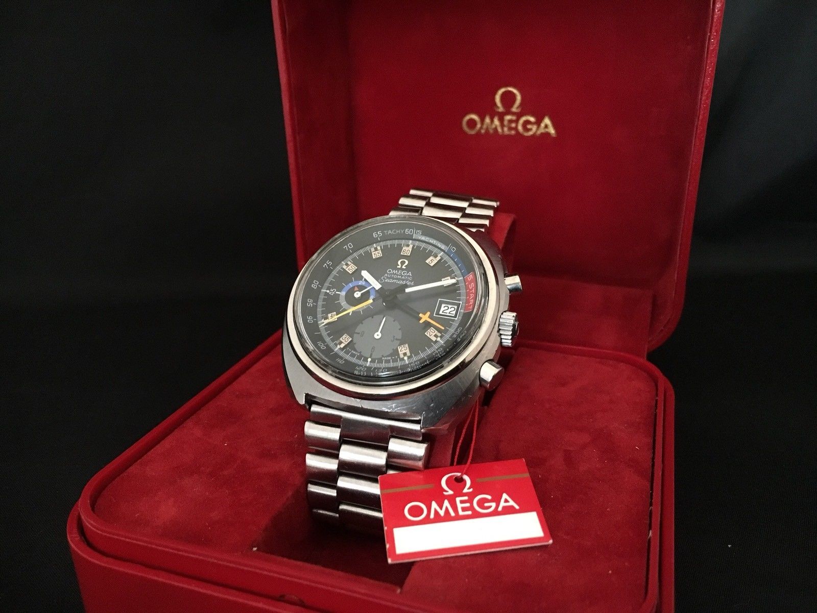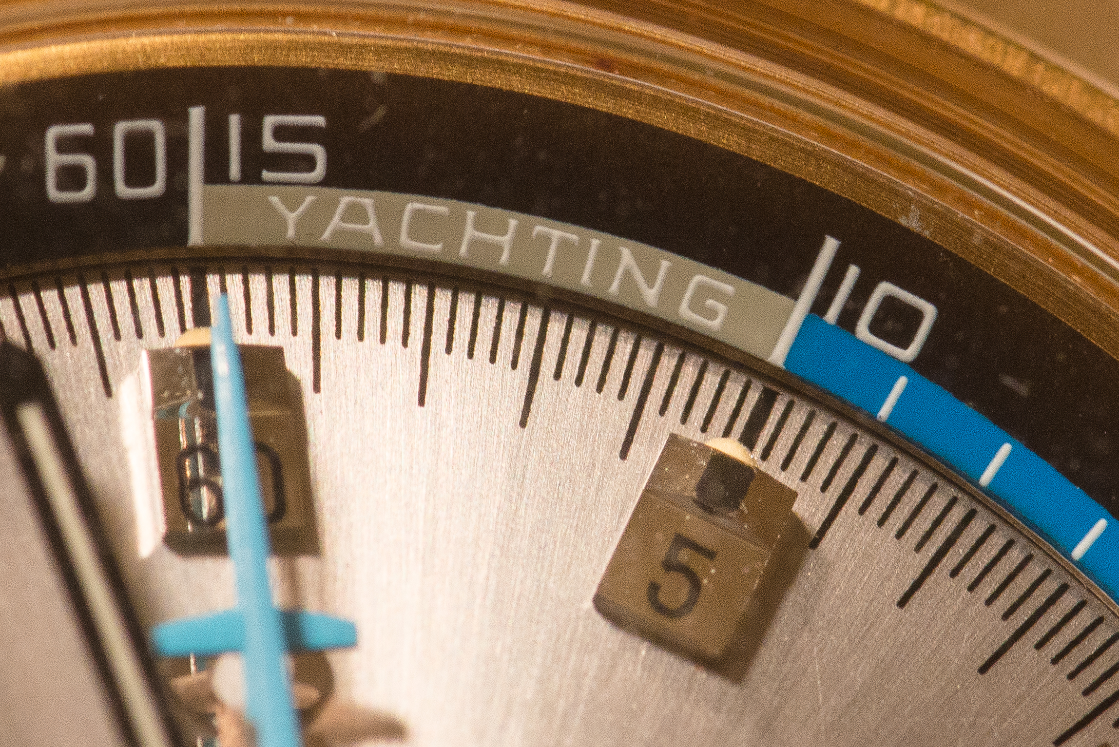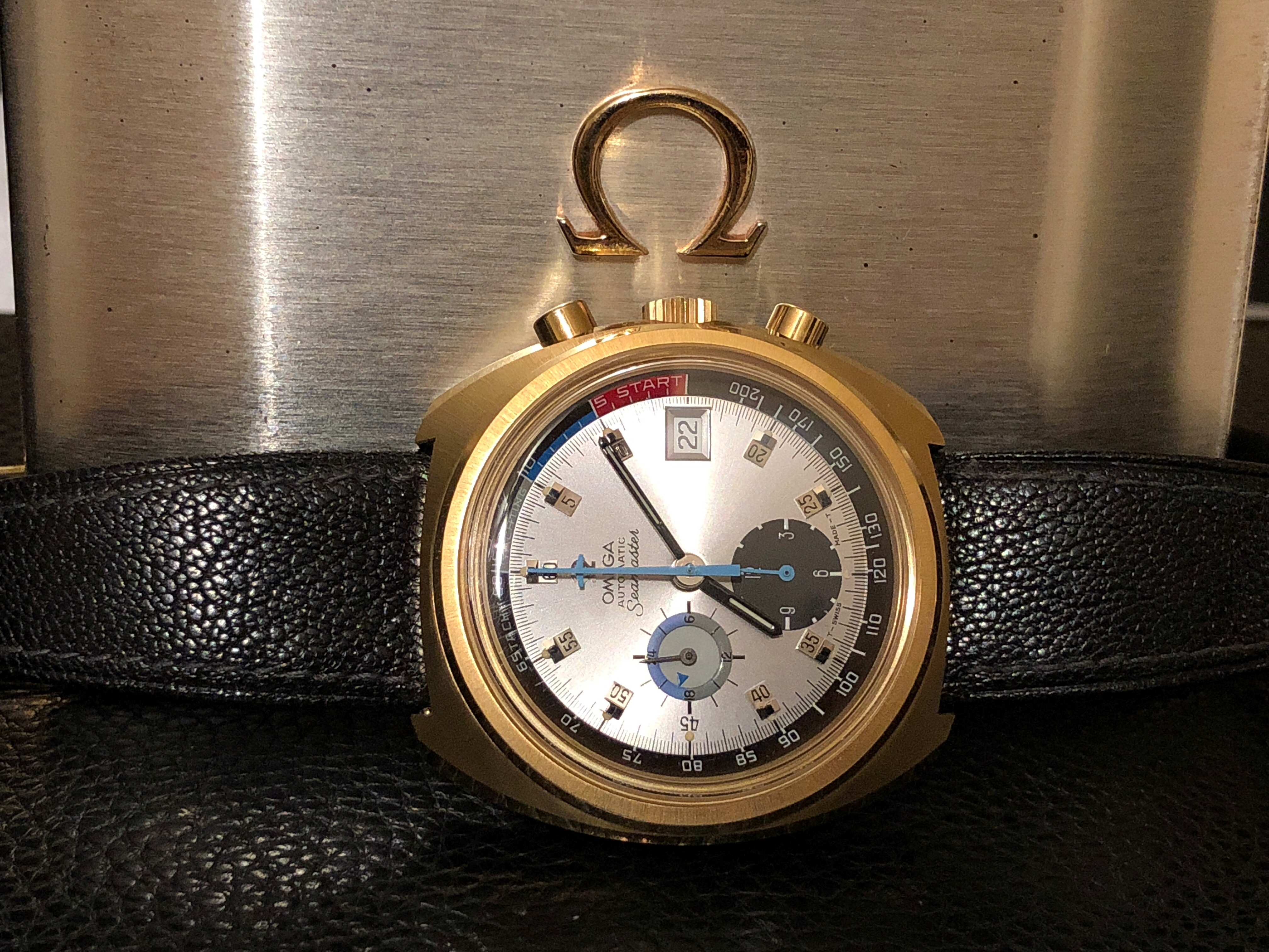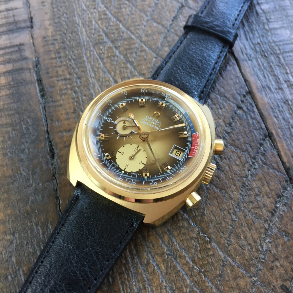 The focus of my collection has mostly been Omega chronographs from the 1960s and on. Up to now, they have been steel cased, with black or grey dials. This Yachting chronograph breaks that mold with a gold case (albeit plated) and a sunburst silver dial. There are touches of blue for the chronograph hands, and a splash of red marking the start of the yachting regatta. I have to say, this combination is truly stunning on the wrist. It definitely adds a bit of bling to an otherwise sober and conservative collection!