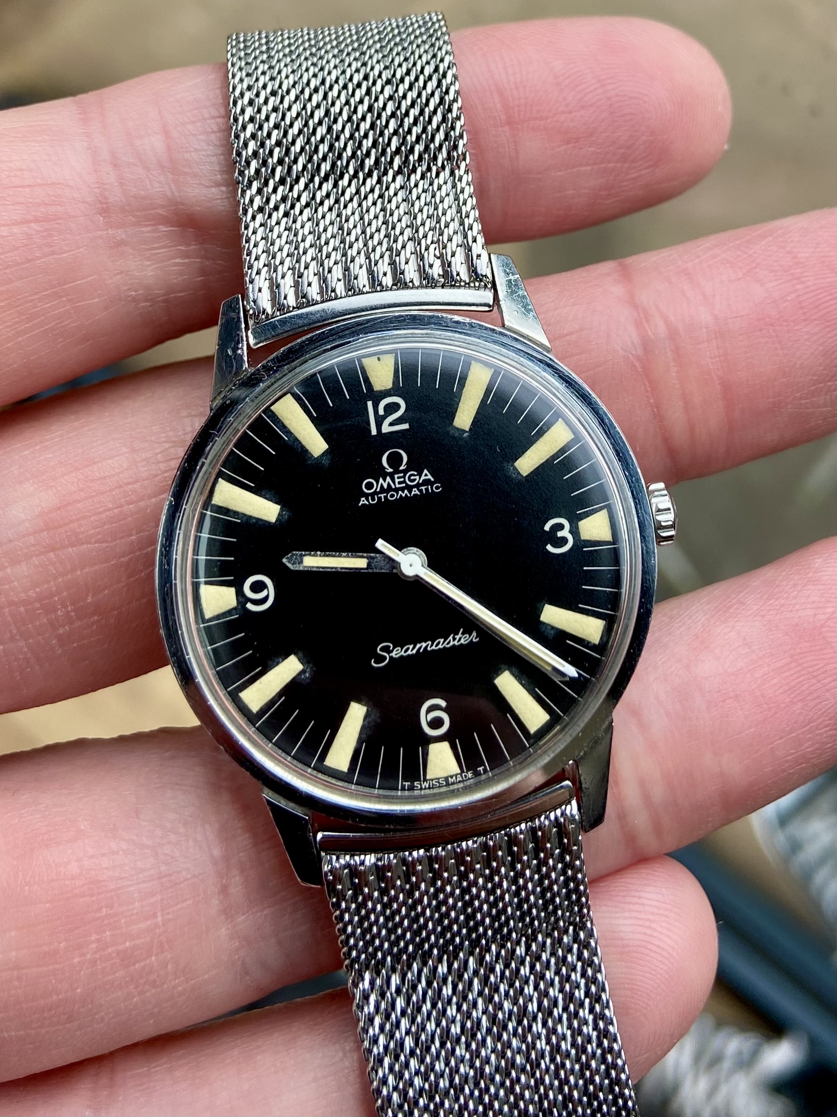 Finally, the watch complete with the freshly relumed hands and dial went to Mitka for a full clean and service of the cal 550. Interestingly, every example of this dial I’ve seen, bar one, has had the cal 550 for the US market, so I wonder if this was primarily a US market dial. Upon arrival, winding the crown was like stirring concrete and the watch was barely running. It arrived back this weekend and is now running like a dream. I’m undecided on what to pair the head with. A 7 row Beads of Rice will work well, as will a plain black calf strap. I’m also considering a blue strap. However, for the time being it’s on a vintage DS&S Milanese bracelet. If you made it this far, thanks for reading!