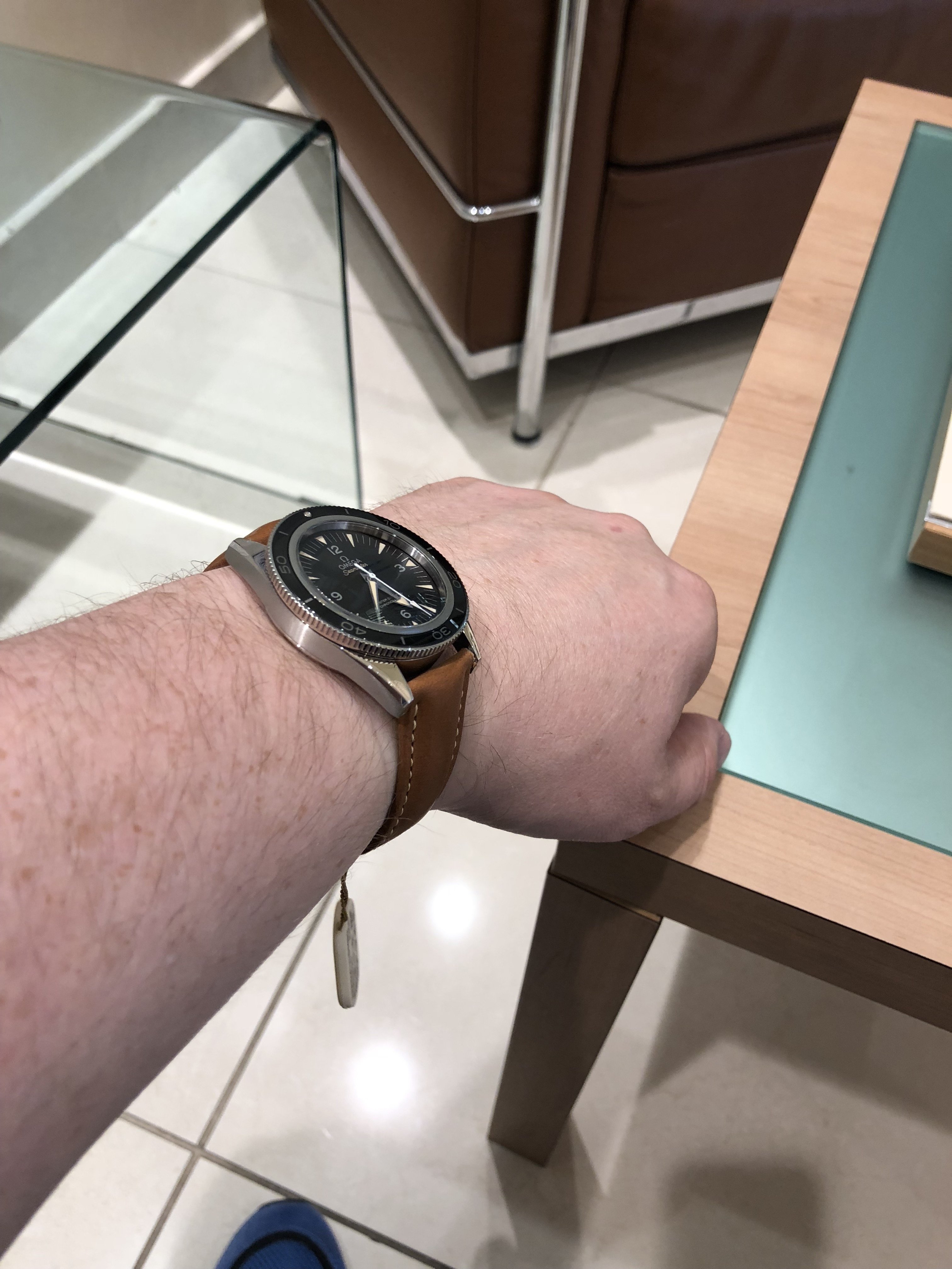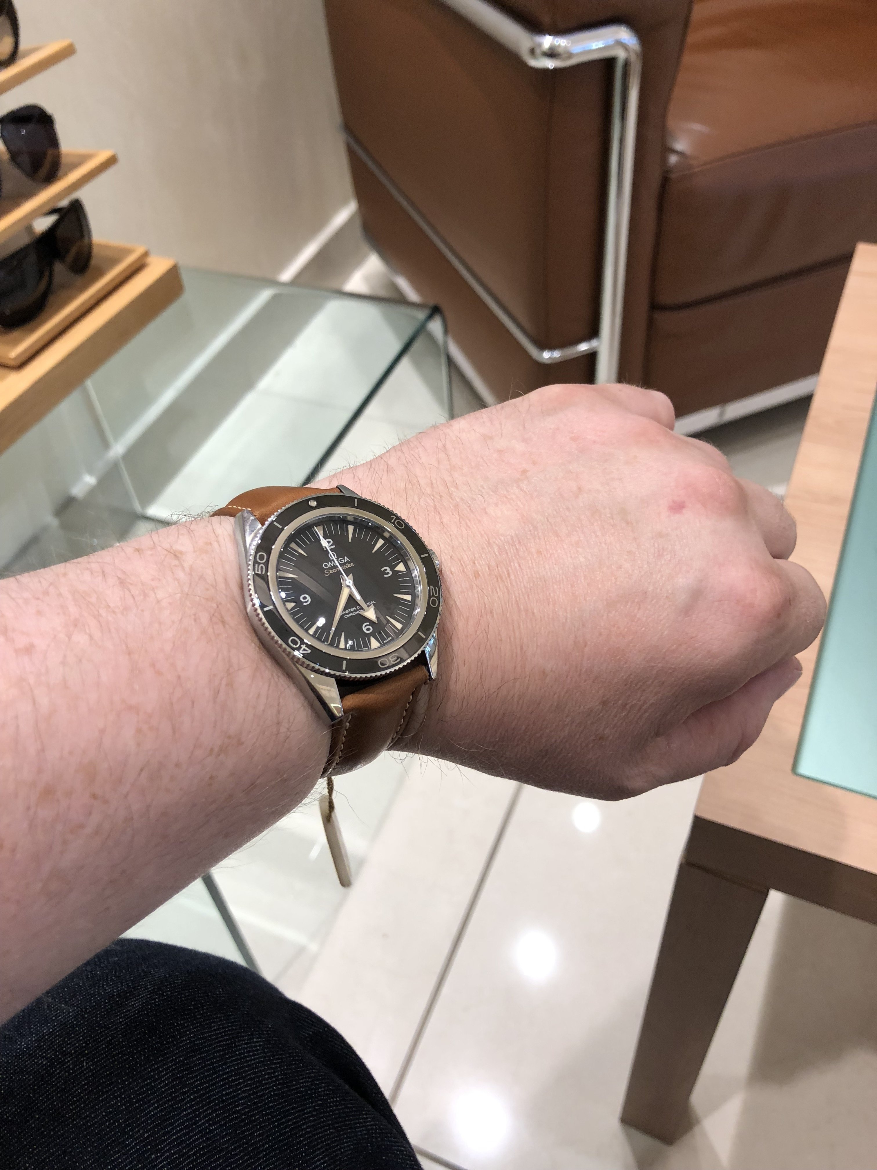 I think I like it. Was doubtful about all the text on the dial as I studied the press photos and real life photos of the watch. Would have much preferred the Seamaster text to be on the lower half of the dial but it still works. The brown /gold fonts allow for some contrast from all the other white text. Love the "sandwiched" dial with the lume wells looking faithful to the originals. The faux patina works for me and I appreciate that Omega has applied a grainy texture with the lume.