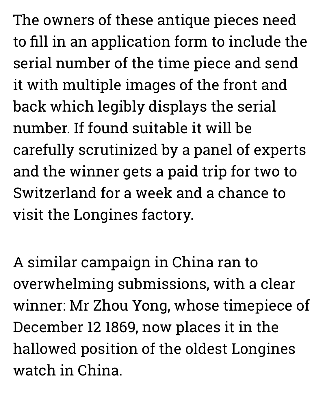 Here is were I learned about the double named watches. I saw information about contests that Longines had to find the oldest Longines in Japan, India, Britain, Ireland, Russian, China, and Taiwan. Seems contests run about every 5 years.