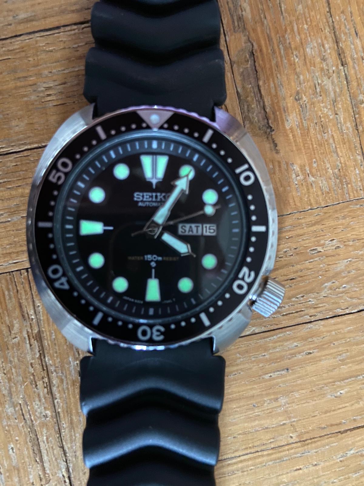 I've managed to aquire this 'Turtle' which I'm currently in the process of repairing. It came with a 'stuck' bezel, which turned out to be a cheap crystal replacement which was not fitted correctly, jamming up the bezel.