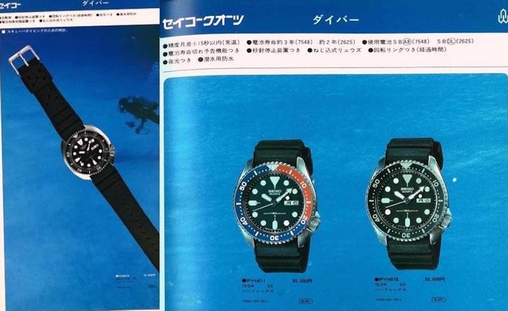 The right hand side of the photo features the black PYH018 (7548-7000) and pepsi PYH011 (7548-700B) 150m full size quartz divers. There is also the orange SAD017 (H558-500A) arnie model with a clear shot of the original strap design that has the decompression limits table on it.