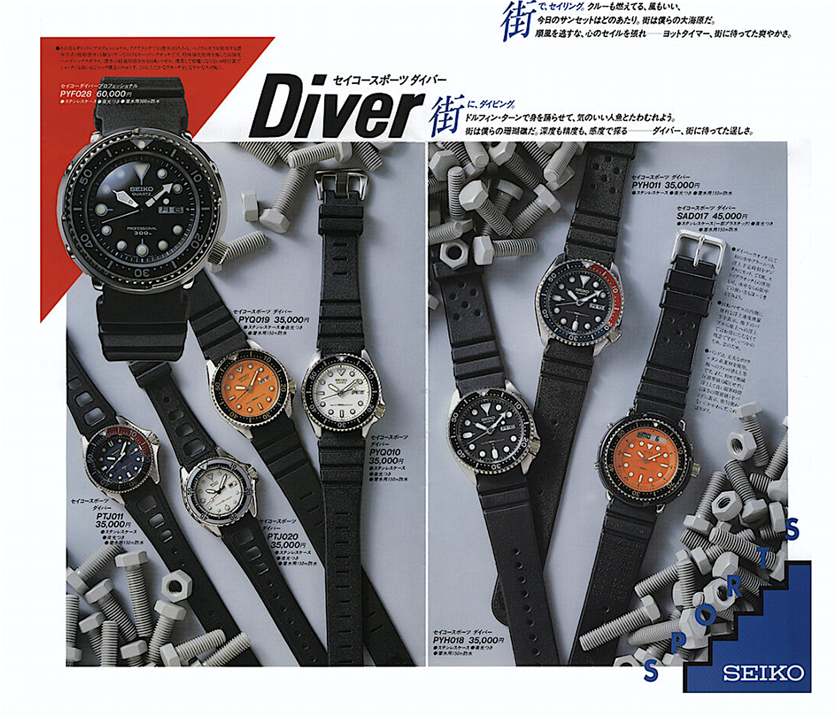 The PYF028 (7549-7010) 300m quartz tuna, orange dialled PYQ019 (6458-600A) and black dialled PYQ018 (6458-6000) midsize 150m divers, PTJ011 (2625-0010) and PTJ020 (2625-0170)compact 150m divers.