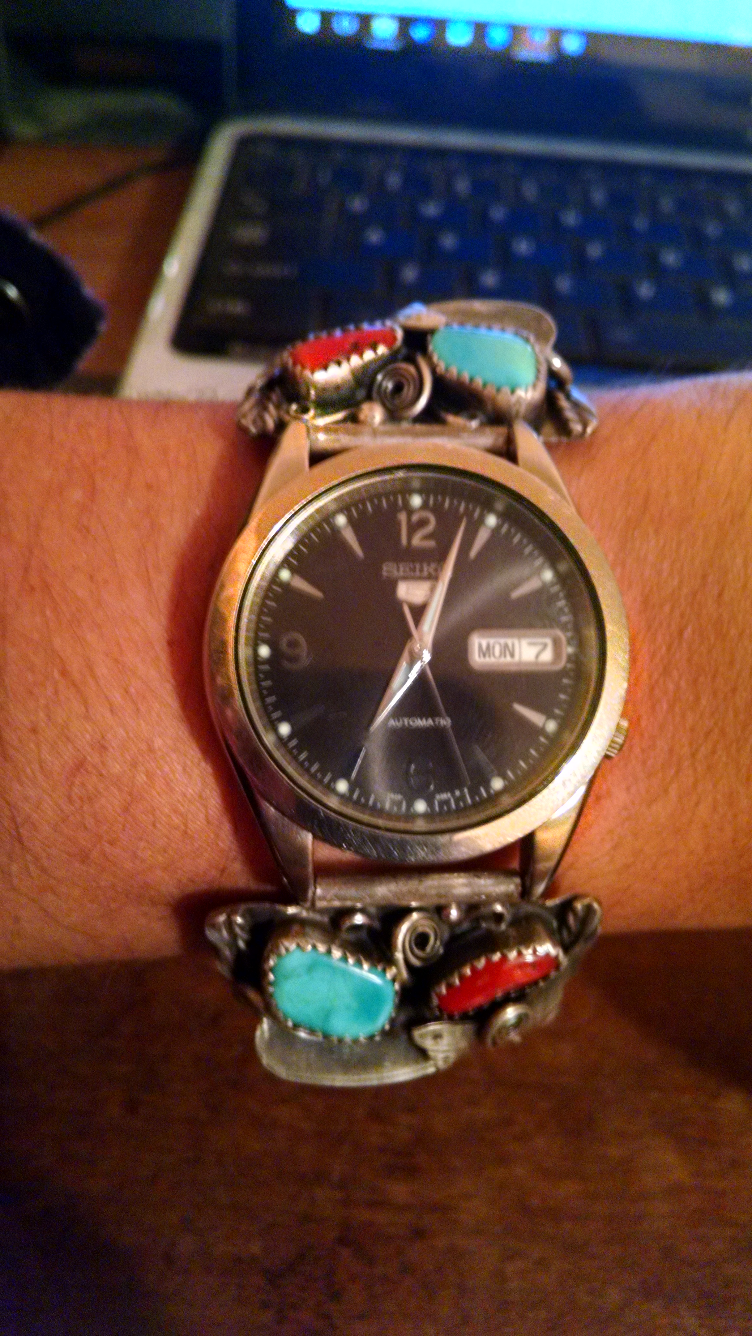 Once it is on the wrist and the band is not so overwhelming. I am going to get a piece of leather and make a strap for it soon and try wearing it for the day. This is what it looks like just laying on my wrist.