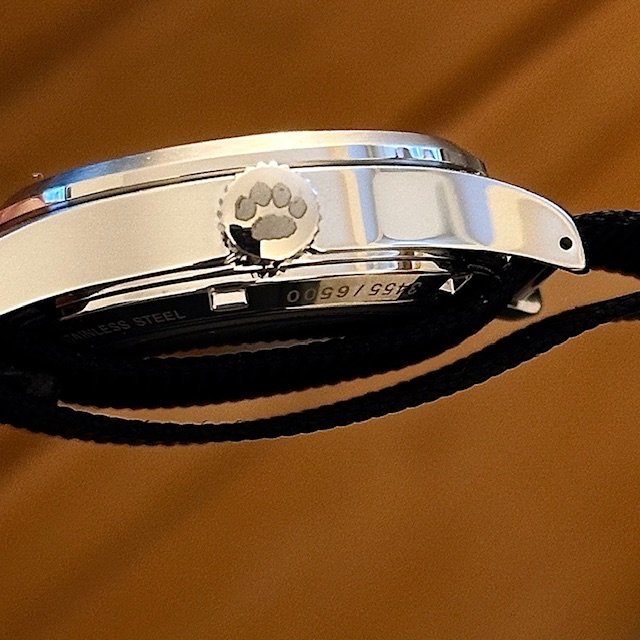It's nicely sized at 36mm and features a translucent, frosted glass caseback, and a uniquely "signed" crown.