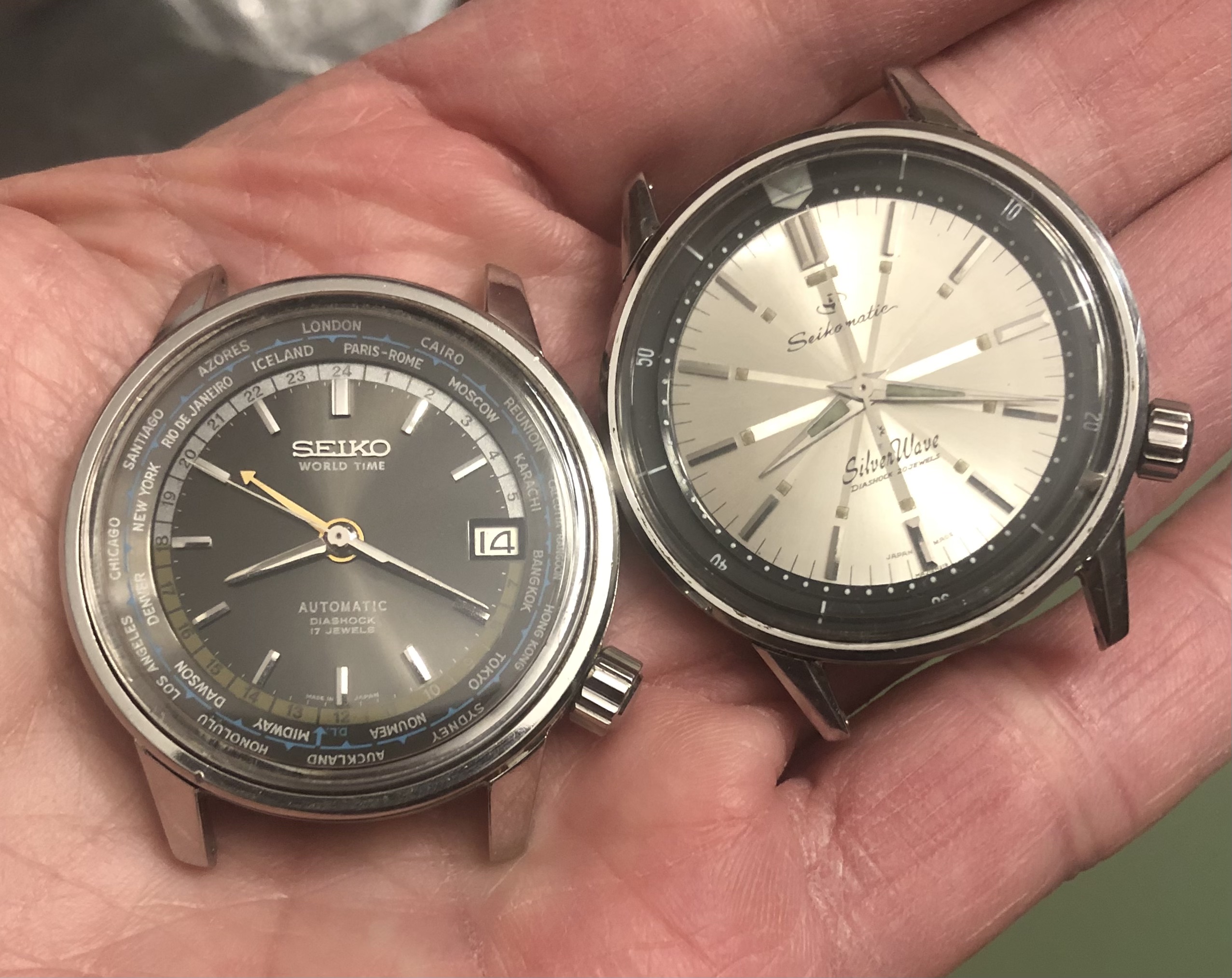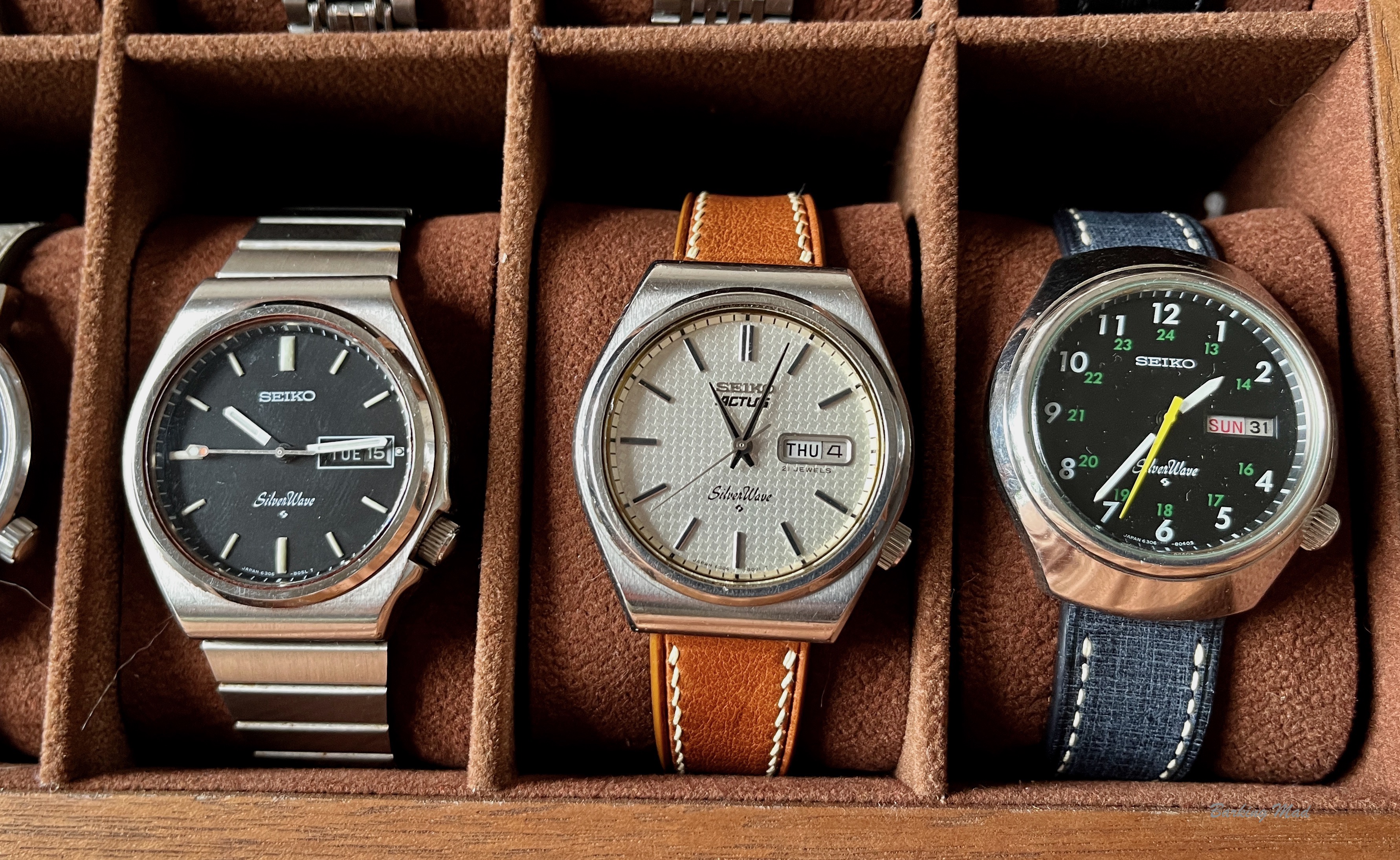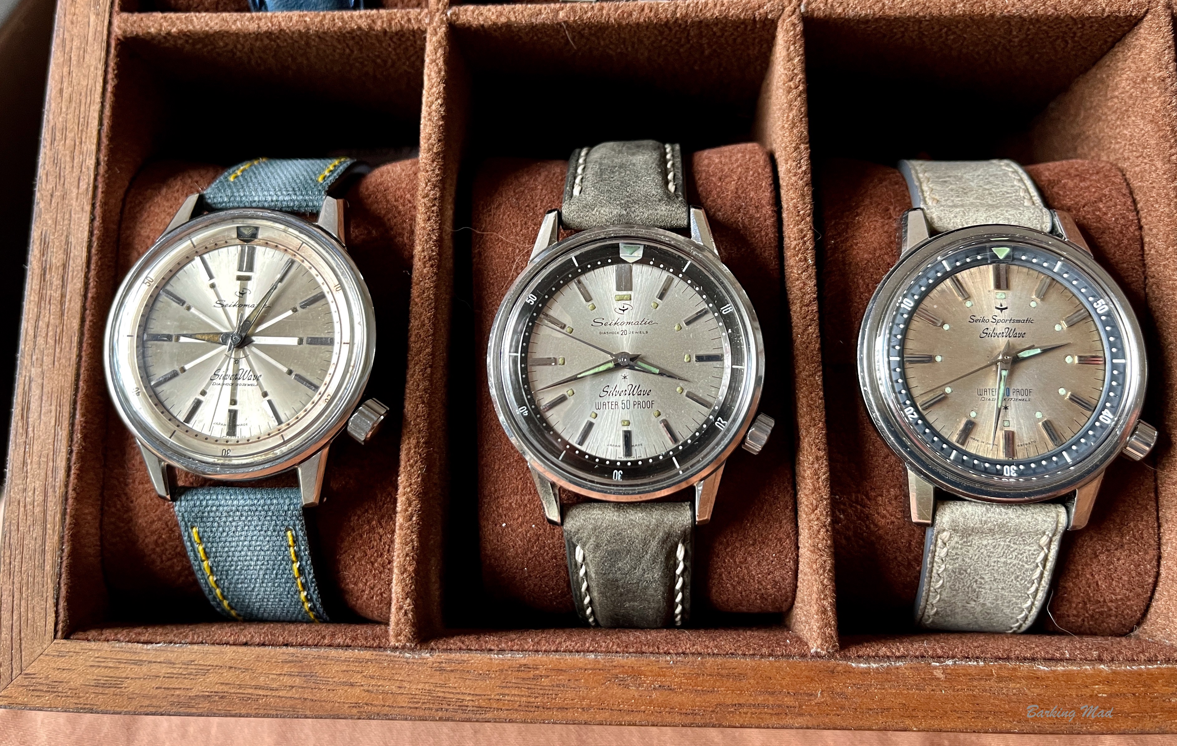 Through a few years of looking and much patience I have finally managed to accumulate all 6 variants in good condition. As more collectors are discovering Silverwaves, prices are going up. I paid nearly £1,000 for an almost perfect Seikomatic 50m.