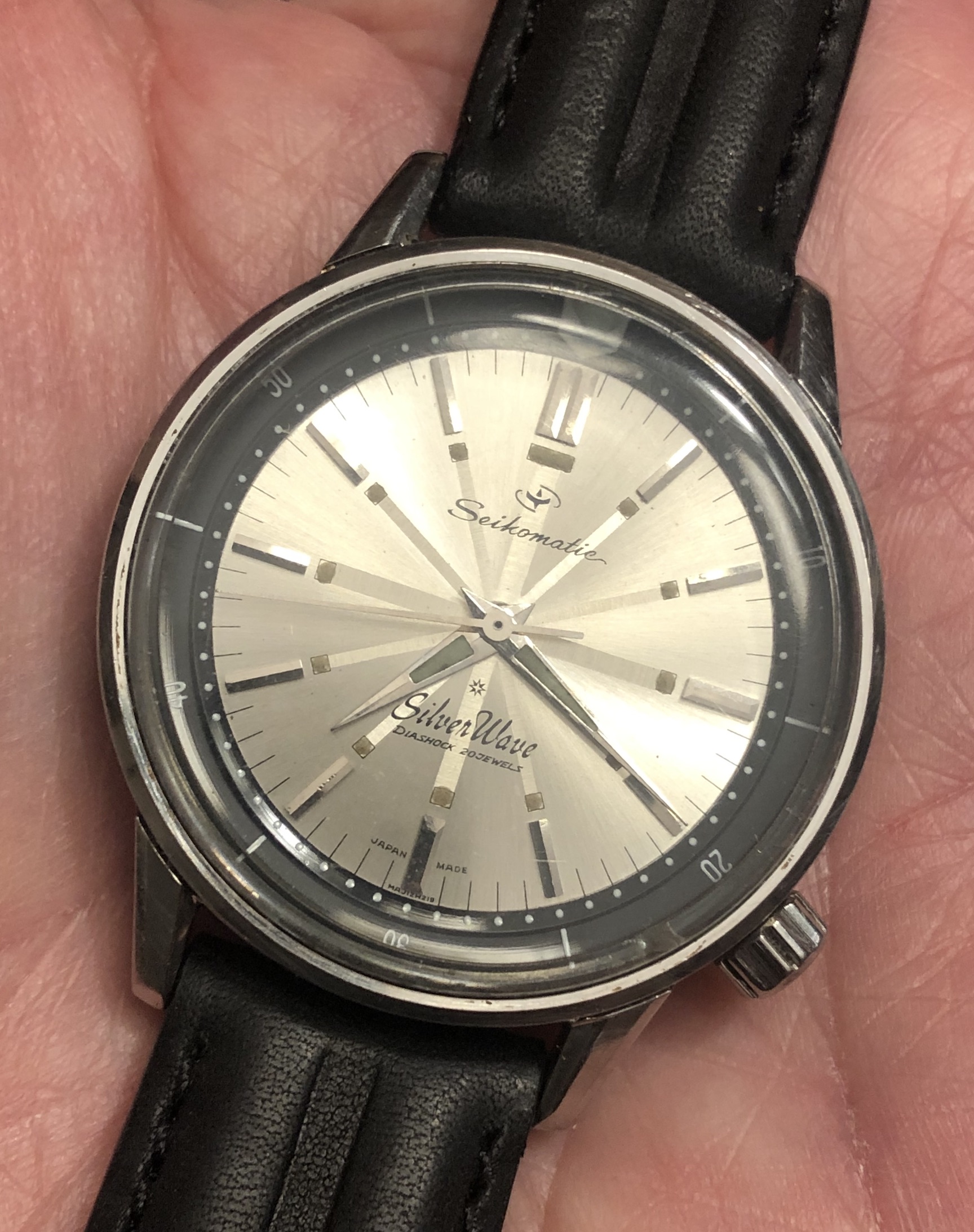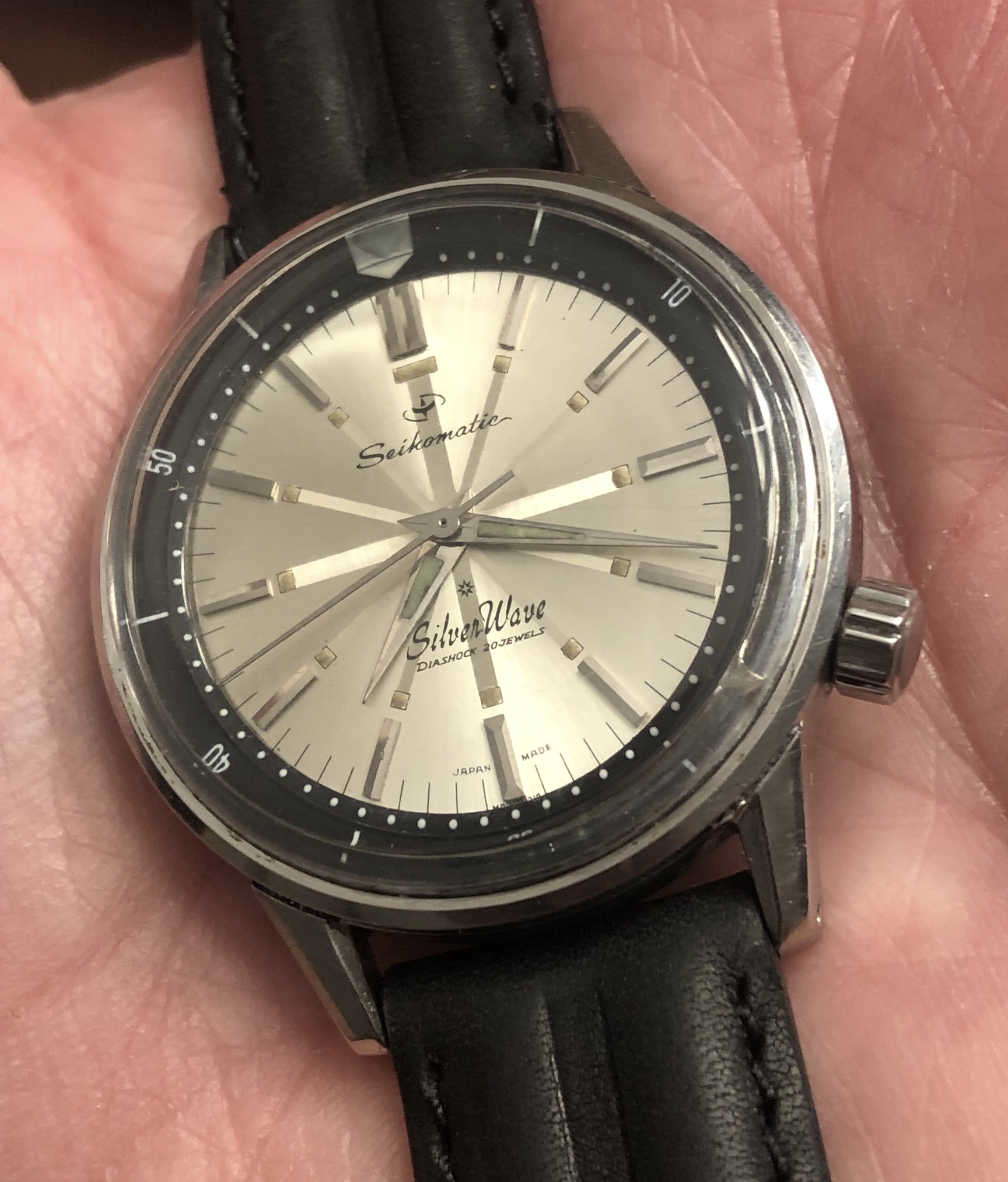 Seikomatic Silverwave 50m, Sunburst dial, Black rotating bezel