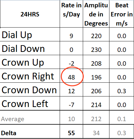 Most of the readings are what I expected for the age and condition of the movement, however, in one position it goes nuts, see below.