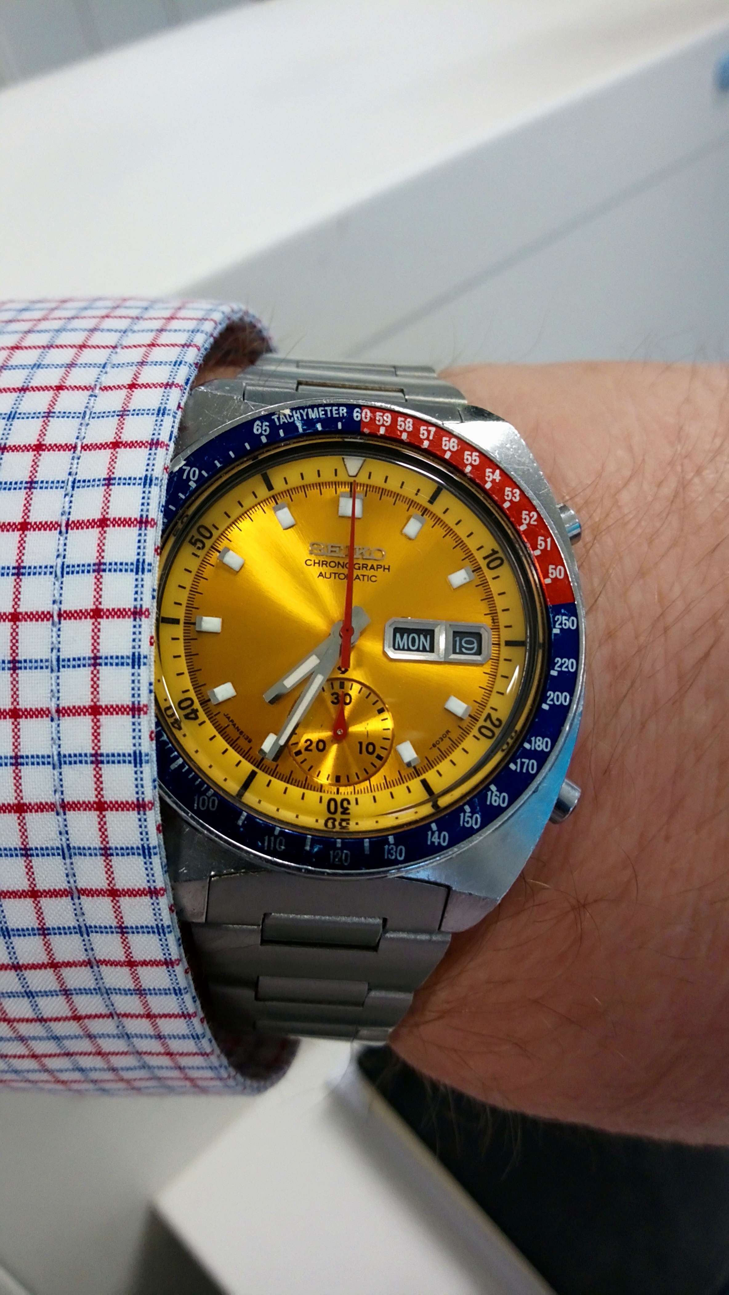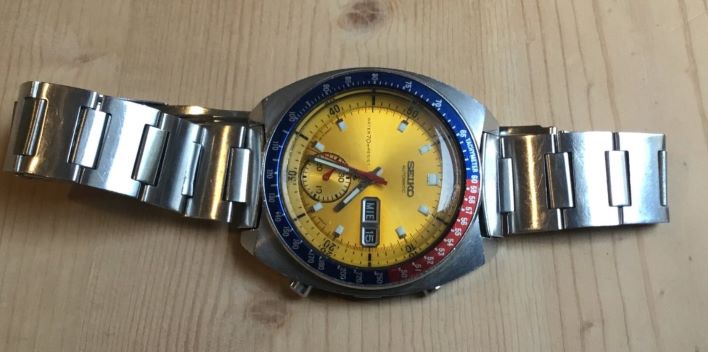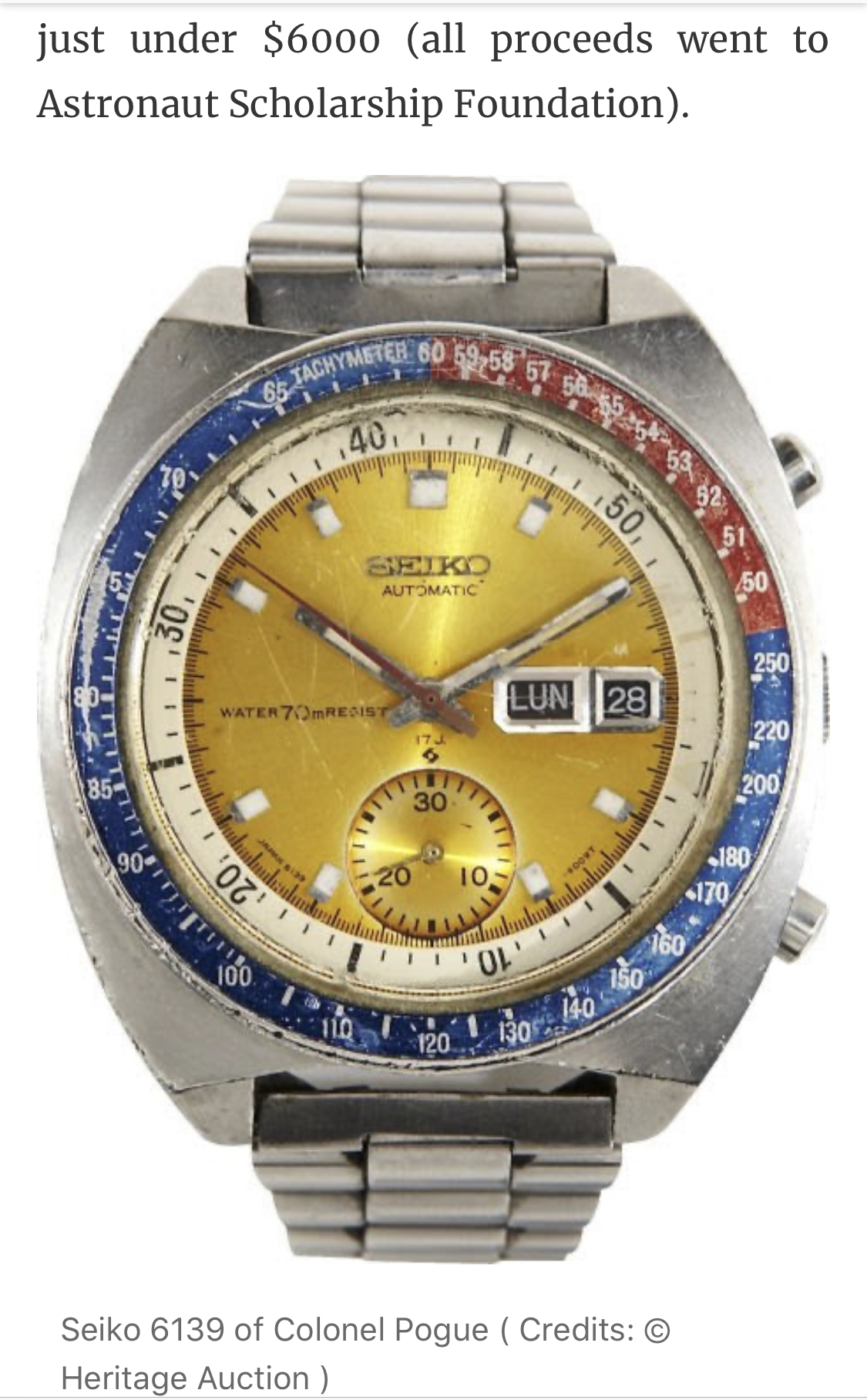 ·I'm not new to Seiko, as I owned many when my pockets were young and shallow, but I am only recently enjoying the Seiko space connection: The "Pogue" 6139 6005 American market watch worn by Bill Pogue on Skylab 4. The exact variant he wore sported "water 70m resist" on the left side of the dial and only "SEIKO Automatic" beneath noon. Of course, the dial was gold. That variation seems to have been produced between Feb 1971 and Apr 1972 only and only sold in US markets. He bought his at a BX on a USAF installation.