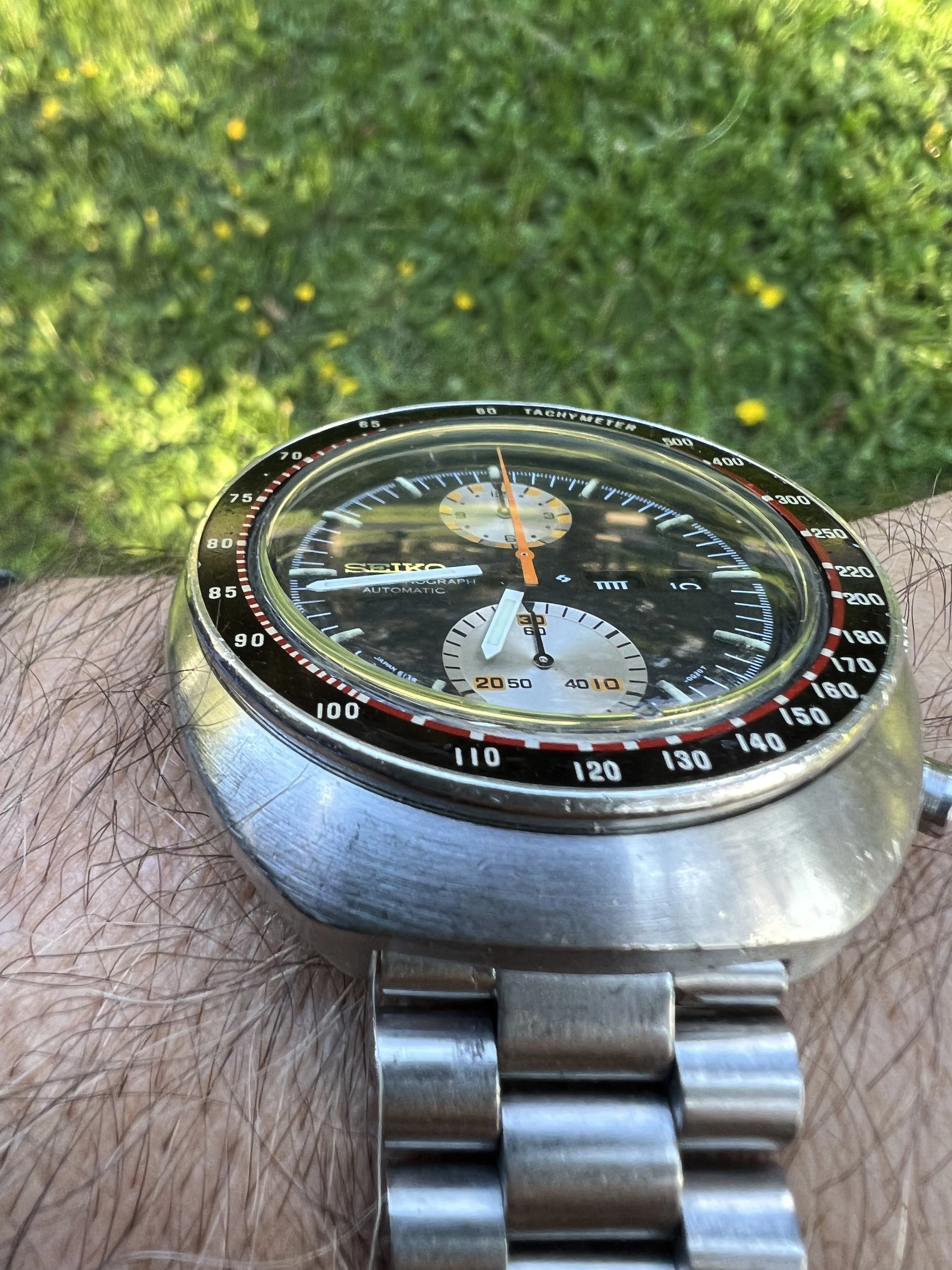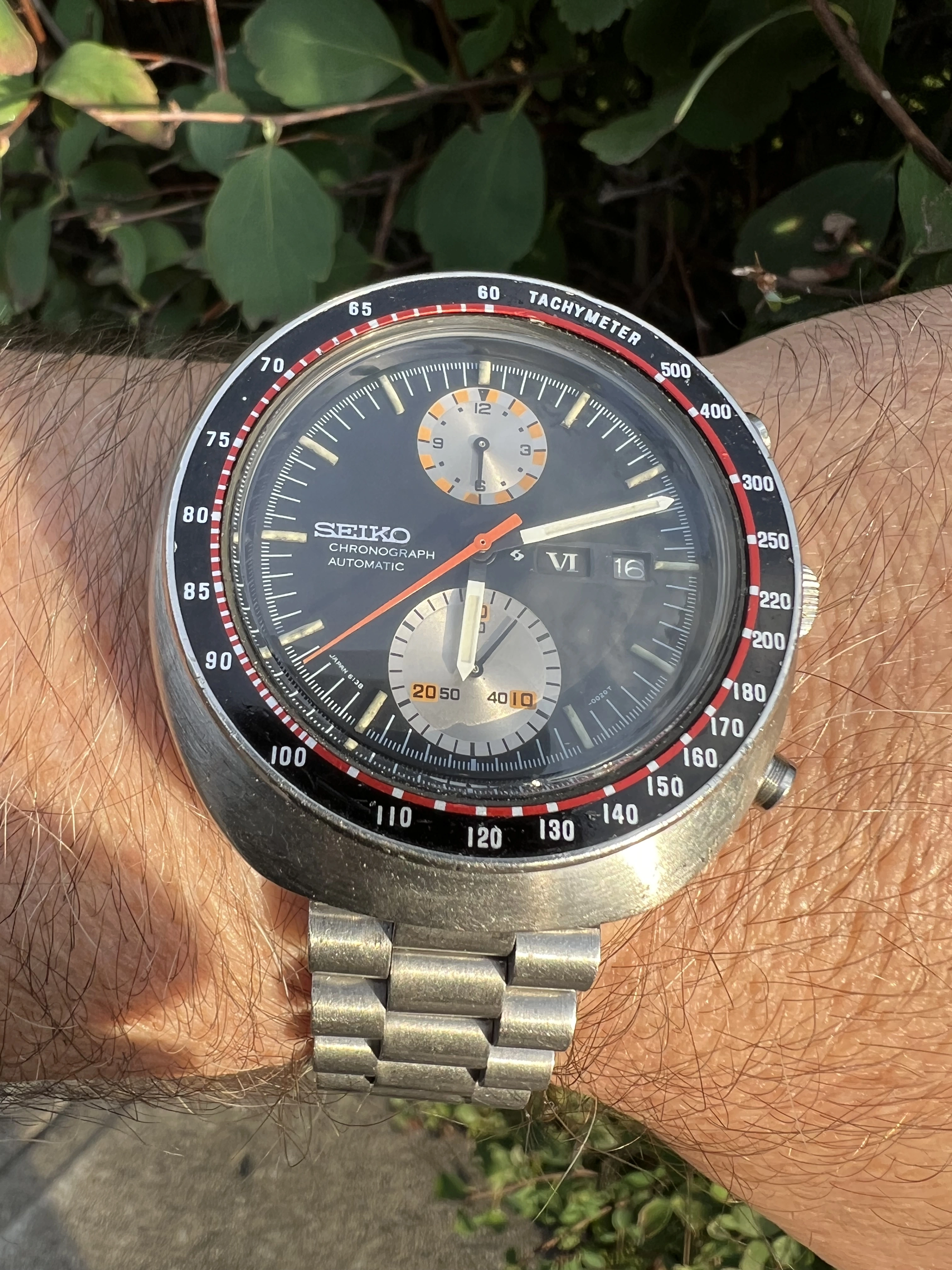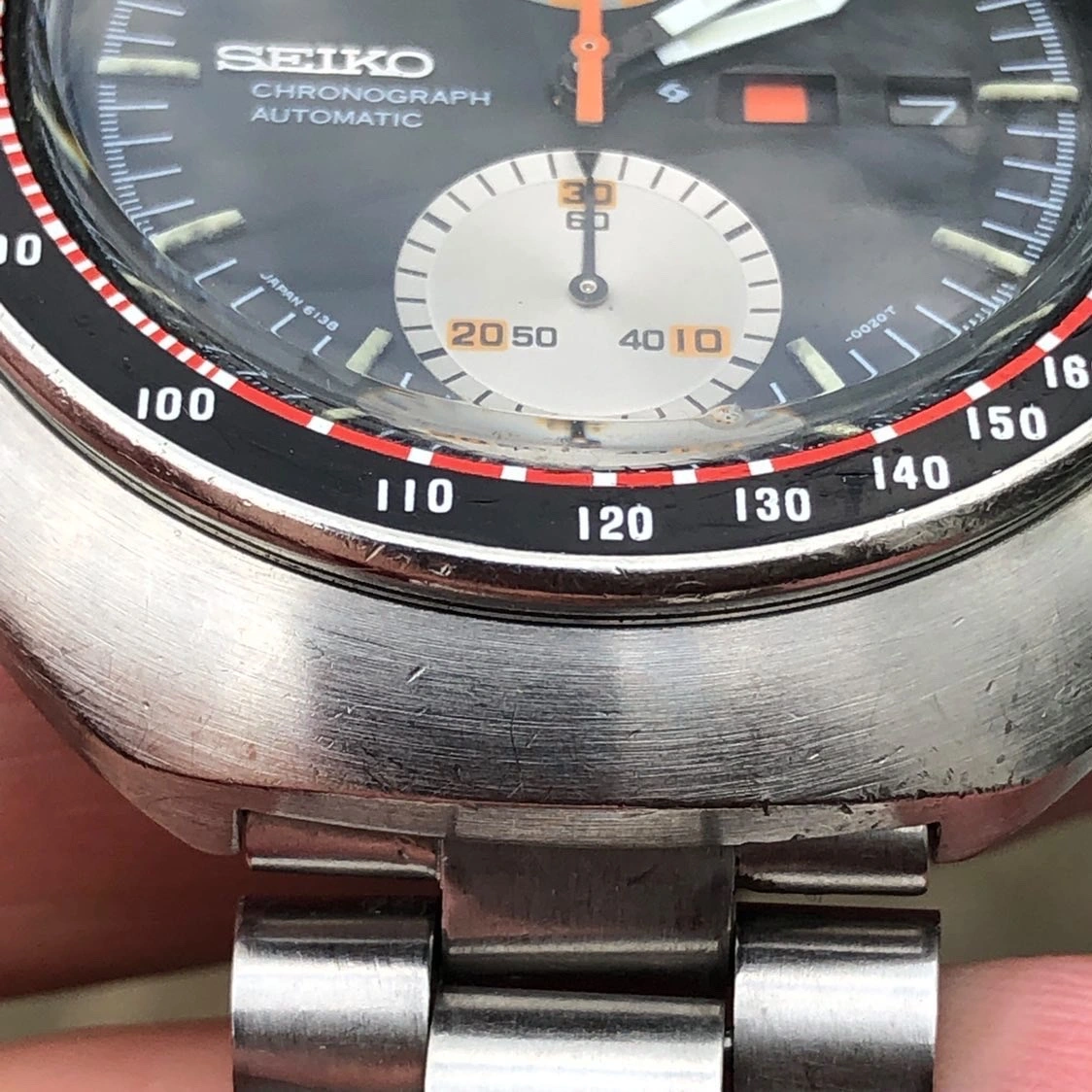 ·Seiko 6138-0011, known as “UFO” and also “Yachtsman” automatic chronograph, original Vintage from 1976. The 6138 line of automatic chronograph was improvement on famed 6139 reference, with addition of hand winding ability and hacking and quickset day-date. SE Asia “Thong Sia” distributed version, with original Stelux bracelet and Roman/English day wheel. Big bold 70’s style with original brushing on case, excellent clean dial. Overall fine example. Movie watch fans may recall this watch was worn by Jean Paul Belmondo in "Le Magnifique", with Jacqueline Bisset. This is a large bold 70's watch.