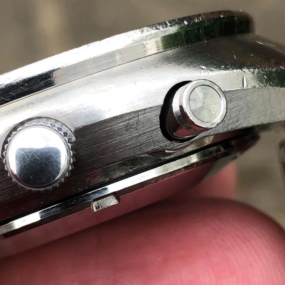 Original stainless steel crown. Original notched pushers, with normal chono start stop, reset to 0.