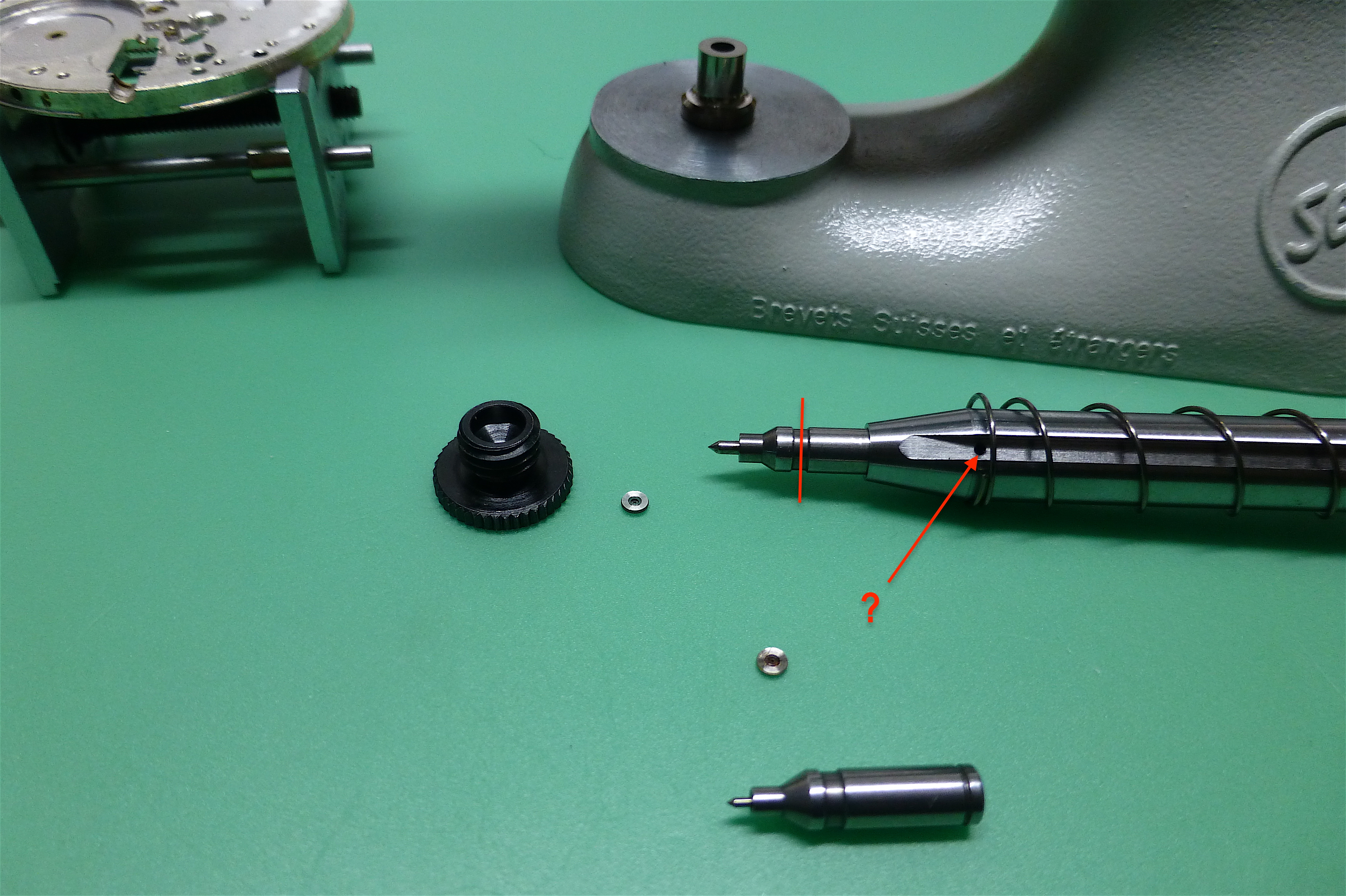 I assume the hole with the ? is to prevent air from pressurising in the spindle and stopping a vacuum when removing the pusher.